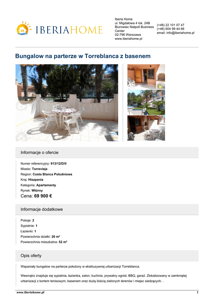 Iberia Home ul. Migdałowa 4 lok. 24B (+48) 22 101 07 47 Biurowiec Natpoll Business (+48) 604 99 44 66 Center email: [email protected] 02-796 Warszawa www.iberiahome.pl Bungalow na parterze w Torreblanca z basenem Informacje o ofercie Numer referencyjny: 913/12/D/II Miasto: Torrevieja Region: Costa Blanca Południowa Kraj: Hiszpania Kategoria: Apartamenty Rynek: Wtórny Cena: 69 900 € Informacje dodatkowe Pokoje: 2 Sypialnie: 1 Łazienki: 1 Powierzchnia działki: 20 m² Powierzchnia mieszkalna: 52 m² Opis oferty Wspaniały bungalow na parterze położony w ekskluzywnej urbanizacji Torreblanca. Wewnątrz znajduje się sypialnia, łazienka, salon, kuchnia, prywatny ogród, BBQ, garaż. Zlokalizowany w zamkniętej urbanizacji z kortem tenisowym, basenem oraz dużą ilością zielonych terenów i miejsc siedzących. . www.iberiahome.pl 1 Orientacja: wschodnia Powierzchnia: 52m2 Taras: 20m2 Odległość do morza: 950m Udogodnienia ● Basen wspólnoty ● Taras ● Umeblowany ● Miejsce parkingowe ● Garaż ● Ogródek www.iberiahome.pl 2