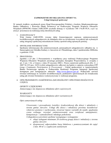 ZAPROSZENIE DO SKŁADANIA OFERT NA Usługi integracji społecznej W ramach środków uzyskanych przez Rząd Rzeczpospolitej Polskiej z kredytu Międzynarodowego Banku Odbudowy i Rozwoju (Bank Światowy) na Poakcesyjny Program Wsparcia Obszarów Wiejskich (PPWOW) Gmina JARCZÓW uzyskała dotację w wysokości 180 176,40 PLN, część tej dotacji przeznacza na realizację niżej określonych usług. 1. ZAMAWIAJĄCY Wójt Gminy JARCZÓW, (zwany dalej Zamawiającym) zaprasza zainteresowanych kwalifikowanych usługodawców do składania ofert na świadczenie wszystkich lub wybranych usług integracji społecznej mieszkańcom Gminy spośród usług opisanych poniżej. 2. SPOTKANIE INFORMACYJNE Spotkanie informacyjne dla zainteresowanych, potencjalnych usługodawców odbędzie się w Samorządowym Ośrodku Kultury w Jarczowie ul. Piłsudzkiego, dnia 3 października 2008roku o godzinie 13.00. 3. PROCEDURA Zgodnie z §3 pkt. 2 Porozumienia o współpracy przy realizacji Poakcesyjnego Programu Wsparcia Obszarów Wiejskich zawartego pomiędzy Zarządem Województwa, w związku z art. 4 ust. 1 lit. a Ustawy z dnia 29 stycznia 2004 r. Prawo zamówień publicznych (Dz. U. z 2007 Nr 233 poz. 1655) wybór usługodawców odbywać się będzie w oparciu o procedurę CPP ((ang.) Community Participation in Procurement – Udział społeczności w zamówieniach) Banku Światowego opisaną w Podręczniku Realizacji Programu Integracji Społecznej dostępnym pod następującym adresem: http://www.ppwow.gov.pl. Podręcznik zawiera również informacje nt. kosztów kwalifikowanych, podmiotów uprawnionych do świadczenia usług jak również formularze wykorzystywane w realizacji programu. 4. OPIS PRZEDMIOTU ZAMÓWIENIA (SZCZEGÓŁOWY OPIS POSZCZEGÓLNYCH CZĘŚCI) OFERTY CZĘŚCIOWE Zamawiający nie dopuszcza składania ofert częściowych. WARIANTY Zamawiający nie dopuszcza składania ofert wariantowych Opis zamawianych usług Utworzenie i prowadzenie świetlicy środowiskowej dla dzieci i młodzieży z terenu gminy Jarczów. Usługi dla dzieci i młodzieży powinny kształtować właściwe postawy i zachowania, stwarzać lepsze warunki do nauki, spędzania czasu wolnego, rozwijać zainteresowania oraz zwiększać umiejętności, kompetencje i samodzielność młodego pokolenia. Usługodawca powinien spełniać następujące wymagania: • objąć usługami minimum 20 osobową grupę dzieci i młodzieży z terenu gminy Jarczów • dysponować odpowiednia bazą lokalowa z pomieszczeniami do zajęć ( min. 60 m2 ) z zapleczem sanitarnym • • • • • • zapewnić dostępność usług minimum 3 dni w tygodniu w wymiarze 4 godziny dziennie w godzinach popołudniowych dysponować odpowiednim personelem do prowadzenia zajęć ( opiekunem z przygotowaniem pedagogicznym, instruktorami z uprawnieniami do prowadzenia zajęć(kursów)) zorganizowanie atrakcyjnych zajęć dla dzieci i młodzieży minimum 2 kursów o tematyce zaproponowanej przez usługodawcę zorganizowanie minimum jednej wycieczki zorganizowanie minimum 1 imprezy okolicznościowej prowadzenie kółek zainteresowań Termin wykonania zamówienia: 15 października 2008r do 31 grudnia 2008r Usługodawca zobowiązany jest do przedstawienia w ofercie informacji nt. sposobu monitorowania realizacji usług, przewidywanych działań informacyjnych, jak również informacji dotyczących zapewnienia trwałości podejmowanych działań. Podstawą dla płatności na rzecz usługodawcy będzie rzeczywiście zrealizowana liczba jednostek zdefiniowanych jako: godzina zajęć realizowanych w ramach usługi. 5. UPRAWNIENI USŁUGODAWCY Podmiotami uprawnionymi do ubiegania się o zamówienie w ramach niniejszej procedury są: 1. Organizacje pozarządowe (NGOs) 2. Organizacje kościelne 3. Prywatni usługodawcy: Firmy, osoby fizyczne, spółdzielnie socjalne, 4. Samorządy zawodowe, organizacje samorządu gospodarczego, izby rolnicze 5. Jednostki organizacyjne samorządu terytorialnego, stowarzyszenia jst i im podległe jednostki organizacyjne, 6. KRYTERIA OCENY TECHNICZNEJ 1. w odniesieniu do punktu 4 a. zgodność z warunkami realizacji i zakresem zamawianych usług b. dysponowanie odpowiednią bazą lokalową (min. 60 m2), z zapleczem sanitarnym, c. dysponowanie odpowiednim personelem do prowadzenia zajęć tzn. opiekun z przygotowaniem pedagogicznym oraz instruktorzy z uprawnieniami do prowadzenia zajęć( kursów) d. przedstawienie spójnego programu realizowanych zajęć Zamawiający oceni spełnienie powyższych minimalnych kryteriów technicznych w oparciu o następujące dokumenty/oświadczenia: • • Oświadczenie o posiadaniu pomieszczenia z zapleczem sanitarnym CV personelu mającego realizować usługi lub oświadczenie o posiadaniu personelu, który zapewni realizację usługi • • opis posiadanego doświadczenia w pracy z dziećmi i młodzieżą przedstawienie programu zajęć Usługodawca zobowiązany jest do przedstawienia w ofercie informacji nt. spodziewanych rezultatów oferowanych usług, sposobu monitorowania ich osiągnięcia, przewidywanych działań informacyjnych, jak również informacji dotyczących zapewnienia trwałości podejmowanych działań. 7. PROCEDURY SKŁADANIA I OCENY OFERT SKŁADANIE OFERT a) Oferty techniczno-finansowe przygotowane z użyciem formularzy załączonych do niniejszego ogłoszenia, należy składać w zaklejonej kopercie osobiście lub za pośrednictwem poczty do Urzędu Gminy w Jarczowie ul. 3 Maja 24 22-664 Jarczów w pok. 17 w terminie do 10 września 2008 r. do godz. 10.00 b) Oferta winna być ważna przez co najmniej [30] dni od daty określonej w pkt. a) c) Oferta winna być dostarczona w zamkniętej kopercie z dopiskiem „Oferta na świadczenie usług: Utworzenie i prowadzenie świetlicy środowiskowej dla dzieci i młodzieży z terenu gminy Jarczów., ponadto na kopercie winny zostać umieszczone dane adresowe Usługodawcy. OCENA OFERT 1. Ocena ofert i wybór najkorzystniejsze oferty odbywać się b
