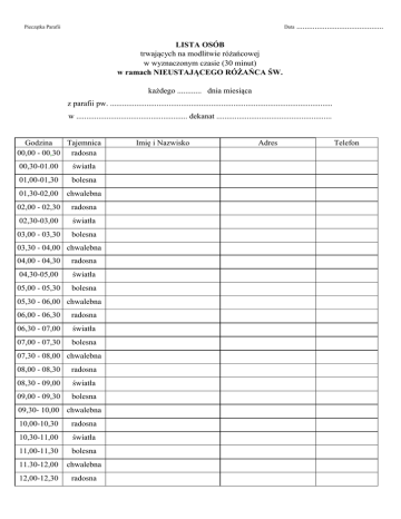 Pieczątka Parafii Data ........................................... LISTA OSÓB trwających na modlitwie różańcowej w wyznaczonym czasie (30 minut) w ramach NIEUSTAJĄCEGO RÓŻAŃCA ŚW. każdego ............ dnia miesiąca z parafii pw. .............................................................................................................. w ....................................................... dekanat ......................................................... Godzina Tajemnica 00,00 - 00,30 radosna 00,30-01.00 światła 01,00-01,30 bolesna 01,30-02,00 chwalebna 02,00 - 02,30 radosna 02,30-03,00 światła 03,00 - 03,30 bolesna 03,30 - 04,00 chwalebna 04,00 - 04,30 radosna 04,30-05,00 światła 05,00 - 05,30 bolesna 05,30 - 06,00 chwalebna 06,00 - 06,30 radosna 06,30 - 07,00 światła 07,00 - 07,30 bolesna 07,30 - 08,00 chwalebna 08,00 - 08,30 radosna 08,30 - 09,00 światła 09,00 - 09,30 bolesna 09,30- 10,00 chwalebna 10,00-10,30 radosna 10,30-11,00 światła 11,00-11,30 bolesna 11.30-12,00 chwalebna 12,00-12,30 radosna Imię i Nazwisko Adres Telefon 12,30-13,00 światła 13,00-13,30 bolesna 13,30-14,00 chwalebna 14,00 - 14,30 radosna 14,30-15,00 światła 15,00-15,30 bolesna 15,30-16,00 chwalebna 16,00-16,30 radosna 16,30-17,00 światła 17,00-17,30 bolesna 17,30-18,00 chwalebna 18,00-18,30 radosna 18,30-19,00 światła 19,00-19,30 bolesna 19,30-20,00 chwalebna 20,00-20,30 radosna 20,30-21,00 światła 21,00-21,30 bolesna 21,30-22,00 chwalebna 22,00 - 22,30 radosna 22,30 - 23,00 światła 23,00 - 23,30 bolesna 23,30 - 24,00 chwalebna ___________________________________________ Podpis Zelatorki _____________________________________________ Podpis Księdza Proboszcza Uwaga ! 1. 2. 3. 4. 5. 6. 7. 8. Powyższą Listę oraz karty przynależności danej osoby do Nieustającego Różańca proponujemy powielić przed ich wypełnieniem. Dzień trwania na modlitwie osób z danej parafii należy uzgodnić z Panią Marią Leśniewską, tel. (061) 832-1980, 606-273-394. W przypadku zgłoszenia się więcej osób do odmawiania różańca o tej samej godzinie w jednej parafii, prosimy umieścić te osoby na dodatkowej liście. Wypełniony druk : „Informacja dot. Nieustającego Różańca Świętego” ze stanem na 31 grudnia kończącego się roku, należy przesłać do Pani Marii Leśniewskiej na adres: ul. Kalinowa 15/1, 61-436 Poznań. W dniu odmawiania Nieustającego Różańca wskazane jest (chociaż nieobowiązkowe) wziąć pełny udział we Mszy św. (z przystąpieniem do Komunii św.). Zapomnienie odmówienia różańca w obranym dniu i godzinie nie jest grzechem. Jeżeli zaistnieje poważna przeszkoda w odmówieniu różańca w obranym terminie, można poprosić inną osobę o zastępstwo. We wszelkich kwestiach związanych z Nieustającym Różańcem należy zwracać się do Pani Marii Leśniewskiej. Więcej informacji: „Miesięcznik Kościelny”, nr 2003/6, s. 34-36.