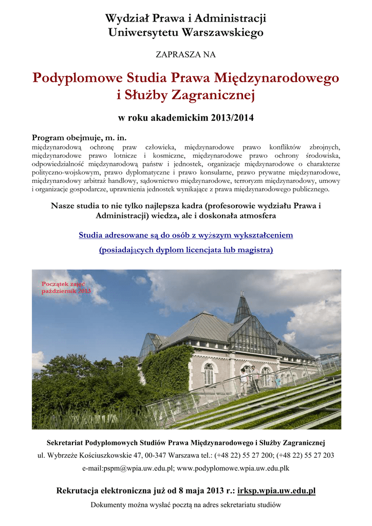 Wydział Prawa i Administracji Uniwersytetu Warszawskiego ZAPRASZA NA Podyplomowe Studia Prawa Międzynarodowego i Służby Zagranicznej w roku akademickim 2013/2014 Program obejmuje, m. in. międzynarodową ochronę praw człowieka, międzynarodowe prawo konfliktów zbrojnych, międzynarodowe prawo lotnicze i kosmiczne, międzynarodowe prawo ochrony środowiska, odpowiedzialność międzynarodową państw i jednostek, organizacje międzynarodowe o charakterze polityczno-wojskowym, prawo dyplomatyczne i prawo konsularne, prawo prywatne międzynarodowe, międzynarodowy arbitraż handlowy, sądownictwo międzynarodowe, terroryzm międzynarodowy, umowy i organizacje gospodarcze, uprawnienia jednostek wynikające z prawa międzynarodowego publicznego. Nasze studia to nie tylko najlepsza kadra (profesorowie wydziału Prawa i Administracji) wiedza, ale i doskonała atmosfera Studia adresowane są do osób z wyższym wykształceniem (posiadających dyplom licencjata lub magistra) Sekretariat Podyplomowych Studiów Prawa Międzynarodowego i Służby Zagranicznej ul. Wybrzeże Kościuszkowskie 47, 00-347 Warszawa tel.: (+48 22) 55 27 200; (+48 22) 55 27 203 e-mail:[email protected]; www.podyplomowe.wpia.uw.edu.plk Rekrutacja elektroniczna już od 8 maja 2013 r.: irksp.wpia.uw.edu.pl Dokumenty można wysłać pocztą na adres sekretariatu studiów