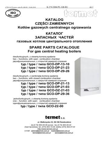 e7788_K-274-nowa_szata-PL-GB-RU / 24-06-2010 K-274:2006/PL-GB-RU str.1 KATALOG CZĘŚCI ZAMIENNYCH Kotłów gazowych centralnego ogrzewania КАТАЛОГ ЗАПАСНЫХ ЧАСТЕЙ газовых котлов центрального отопления SPARE PARTS CATALOGUE For gas central heating boilers dwufunkcyjnych, z otwartą komorą spalania two – functions, with open combustion chamber двухфункциональных, с открытой камерой сгорания typ / type / типа GCO-DP-13-10 typ / type / типа GCO-DP-21-23 typ / type / типа GCO-DP-29-26 dwufunkcyjnych, z zamkniętą komorą spalania two – functions, with closed combustion chamber двухфункциональных, с закрытой камерой сгорания typ / type / типа GCO-DP-21-13 typ / type / типа GCO-DP-21-03 typ / type / типа GCO-DZ-21-03 typ / type / типа GCO-DP-29-36 jednofunkcyjnych, z otwartą komorą spalania one – function, with open combustion chamber oднoфункциональных, с открытой камерой сгорания typ / type / типа GCO-22-00 s.a. ul. Wałbrzyska 33, 58-160 Świebodzice tel.(0 74) 854-04-46-serwis; fax.(0 74) 854-05-42 Dział Sprzedaży: tel. (074) 854-15-05; telefax (074) 854-07-03 http://www.termet.com.pl e-mail: [email protected] [email protected] [email protected] [email protected] e7788_K-274-nowa_szata-PL-GB-RU / 24-06-2010 K-274:2006/PL-GB-RU str.2 WPROWADZENIE Katalog części zamiennych kotła grzewczego przeznaczony jest głównie dla sprzedawców i punktów usługowych zajmujących się zamawianiem i rozprowadzaniem części, naprawą i konserwacją kotła w okresie gwarancyjnym i pogwarancyjnym. Katalog zawiera rysunek zestawieniowy kotła na którym pokazane są jego części i zespoły ich położenie i sposób zamocowania w wyrobie. Każda część na rysunku oznaczona jest numerem (pozycją), pod którym w odpowiedniej tabeli podawane są: nazwa, nr rysunku oraz opis miejsca zamontowania. Te części, których nie można było pokazać na rysunku występują w tabelach pod odpowiednią liczba porządkową. Przy zamawianiu określonych części należy powołać się na niniejszy katalog podając pełną nazwę części lub zespołu oraz nr rysunku. Przykład oznaczania części : Dysza na gaz ziemny 2E-G20 –20mbar (GZ-50) do kotła GCO-DP-13-10, w tabeli pod poz.6 znajdujemy: Dysza na gaz ziemny 2E-G20 -20mbar (GZ-50) nr rys. Z0851.70.20.01, oznaczenie 115 ilość sztuk/wyrób = 12 INTRODUCTION Spare parts catalogue is dedicated mainly for salesmen and servicing stations that deal with ordering and selling spare parts for boilers as well as repairing and making all maintenance operations of boilers during guarantee period and after it. Spare parts catalogue includes the assembly drawing of the boiler where its components, assemblies and their localisation and way of its fastening in the product are presented on. Every spare part on the drawing has its own number (item), which is stated in a proper table with a name of a part, its drawing number and a description of the a place where a component is installed in. The parts that could not be presented on the drawing are listed in tables below the proper ordinal number. To order a part it is necessary to refer to this Spare Parts Catalogue and give a full name of a spare part or its drawing number. Example of parts designation A nozzle supplied with natural gas 2E-G20 (GZ-50), for the boiler GCO-DP-13-10, in a table below the item 6 you can find: Nozzle for a natural gas 2E-G20 (GZ-50), drawing No Z0851.70.20.01, Designation 115, quantity / 1 product = 12 ВВЕДЕНИЕ Каталог запасных частей газовых котлов центрального отоплени предназначен прежде всего для продавцов и фирм занимающихся сервисом, ремонтом, консервацией в течении гарантийного и после гарантийного срока. В каталоге находятся сборочный чертёж который указывает узлы и элементы котла, их расположение и метод крепления в котле. Кажлая часть на сборочном чертеже обозначена номером (позиция) под котором в соответствующей табели находится: наименоване, номер чертежа, описание места установления и вид. Части которых не возможно указать на сборочным чертеже находятся в табели под соответствующим порядковым номером. При заказе определённых части надо создаться на настоящий каталог подавая полное наименование части или узла а также номер чертежа. Пример обозначения части: Сопло горелки на газ природный 2E-G20 (GZ-50), для GCO-DP-13-10, В табели поз. 6 находим: Сопло горелки на газ природный 2E-G20 (GZ-50) № черт. Z0851.70.20.01, маркировка 115 количество штук/изделие = 12 e7788_K-274-nowa_szata-PL-GB-RU / 24-06-2010 K-274:2006/PL-GB-RU Widok ogólny kotłów General view of the boilers Общий вид котлов str.3 e7788_K-274-nowa_szata-PL-GB-RU / 24-06-2010 K-274:2006/PL-GB-RU Podstawowe elementy kotła typ Main component of the boiler type Основные элементы котлов типа GCO-DP-13-10 str.4 K-274:2006/PL-GB-RU e7788_K-274-nowa_szata-PL-GB-RU / 24-06-2010 str.5 c o m k e b f Podstawowe elementy kotła typ Main component of the boiler type Основные элементы котлов ти