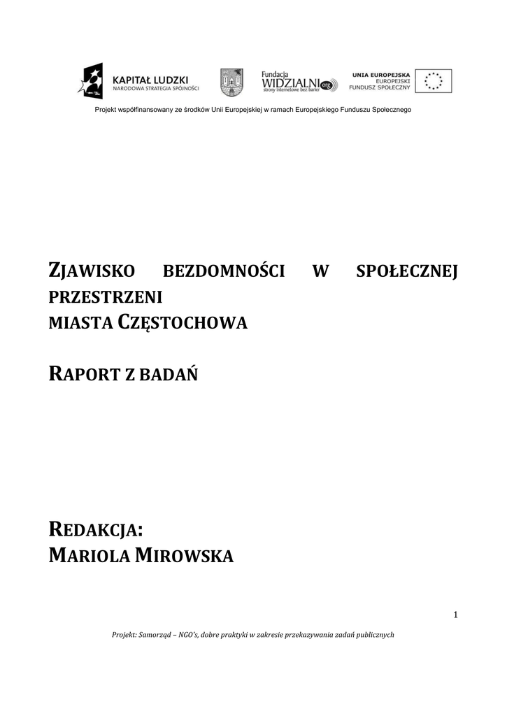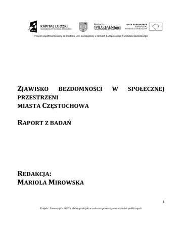 Projekt współfinansowany ze środków Unii Europejskiej w ramach Europejskiego Funduszu Społecznego ZJAWISKO BEZDOMNOŚCI W SPOŁECZNEJ PRZESTRZENI MIASTA CZĘSTOCHOWA RAPORT Z BADAŃ REDAKCJA: MARIOLA MIROWSKA 1 Projekt: Samorząd – NGO's, dobre praktyki w zakresie przekazywania zadań publicznych Projekt współfinansowany ze środków Unii Europejskiej w ramach Europejskiego Funduszu Społecznego SPIS TREŚCI Wstęp .................................................................................................................................................................................................. 5 Część I Analiza otoczenia formalnoprawnego i instytucjonalnego osób bezdomnych ..................................... 8 Beata Pawlica .............................................................................................................................................................................. 8 Opis wybranej i zastosowanej metodologii oraz źródeł informacji wykorzystanych w badaniach ....... 8 Przedmiot i cel badań ........................................................................................................................................................ 8 Problemy badawcze.......................................................................................................................................................... 11 Dobór próby badawczej .................................................................................................................................................. 12 Metoda, techniki i narzędzia badawcze .................................................................................................................... 14 Ilona Antoniewicz................................................................................................................................................................... 18 Lokalne dokumenty strategiczne dotyczące zjawiska bezdomności w Częstochowie oraz współpracy samorządu miasta Częstochowa z organizacjami pozarządowymi w latach 2007 - 2015 ........................................................................................................................................................................................................ 18 Lokalne dokumenty strategiczne ................................................................................................................................ 18 Kierunki współpracy z organizacjami pozarządowymi .................................................................................... 29 Podsumowanie ........................................................................................................................................................................ 32 Agnieszka Kowal - Smugowska ........................................................................................................................................ 34 Projekty i programy realizowane na rzecz osób bezdomnych przez MOPS i NGO's ................................ 34 Podstawowe akty prawne funkcjonowania MOPS i NGO's .............................................................................. 35 Projekty realizowane ze środków Europejskiego Funduszu Społecznegow ramach PO KL przez Miejski Ośrodek Pomocy Społecznej w Częstochowie ....................................................................................... 35 Projekty realizowane lub współrealizowane ze środków Europejskiego Funduszu Społecznego w ramach PO KL przez organizacje pozarządowe działające na rzecz bezdomnych w Częstochowie42 Programy finansowane ze środków rządowych, realizowane przez organizacje pozarządowe działające na rzecz osób bezdomnych w Częstochowie ................................................................................... 45 Podsumowanie ........................................................................................................................................................................ 54 2 Projekt: Samorząd – NGO's, dobre praktyki w zakresie przekazywania zadań publicznych Projekt współfinansowany ze środków Unii Europejskiej w ramach Europejskiego Funduszu Społecznego Magdalena Helińska .............................................................................................................................................................. 56 Wsparcie udzielane osobom bezdomnym przez Miejski Ośrodek Pomocy Społecznej oraz wybrane organizacje pozarządowe w Częstochowie w latach 2007 – 2011 – aspekty prawne, kadrowe, techniczne i finansowe ......................................................................................................................................................... 56 Wstęp do badań analitycznych .................................................................................................................................... 56 Podsumowanie ........................................................................................................................................................................ 76 Organizacje pozarządowe .............................................................................................................................................. 79 Caritas Archidiecezji Częstochowskiej .................................................................................................................. 101 Stowarzyszenie Wzajemnej Pomocy ,,AGAPE” ................................................................................................... 117 Fundacja św. Barnaby ................................................................................................................................................... 122 Część II Analiza wyników badań empirycznych .......................................................................................................... 138 Beata Pawlica ............................................