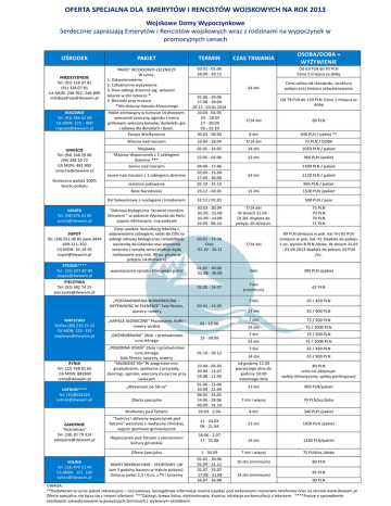 OFERTA SPECJALNA DLA EMERYTÓW I RENCISTÓW WOJSKOWYCH NA ROK 2013 Wojskowe Domy Wypoczynkowe Serdecznie zapraszają Emerytów i Rencistów wojskowych wraz z rodzinami na wypoczynek w promocyjnych cenach OŚRODEK MIĘDZYZDROJE Tel: (91) 328 07 81 (91) 328 07 91 CA MON: 246-911; 246-800 [email protected] ROGOWO Tel: (91) 386 62 69 CA MON: 225 – 900 [email protected] UNIEŚCIE Tel: (94) 348 19 00 (94) 348 19 72 CA MON: 481 900 [email protected] PAKIET PAKIET WCZASOWO-LECZNICZY W cenie: 1. Zakwaterowanie 2. Całodzienne wyżywienie 3. Dwa zabiegi dziennie wg. wskazań lekarza w dni robocze * 4. Biesiada przy muzyce * Nie dotyczy masażu klasycznego TERMIN CZAS TRWANIA 03.01 - 01.06 28.09 - 20.12 Od 63 PLN do 95 PLN Cena 1 miejsca za dobę 14 dni Pakiet animacyjny w turnusie 14 dniowym: wieczorek taneczny, ognisko z menu grillowym, wieczory karaoke, dyskoteki, gry i zabawy dla dorosłych i dzieci. 01.06 - 29.06 17.08 - 28.09 20.12 - 03.01.2014 20.04 - 03.05 05 - 18.05 17 - 30.09 02 - 15.10 OSOBA/DOBA + WYŻYWIENIE Cena zależy od standardu, struktury pokoju oraz miejsca zakwaterowania Od 78 PLN do 110 PLN Cena 1 miejsca za dobę 7/14 dni 60 PLN 640 PLN / pakiet ** Święta Wielkanocne 30.03 - 06.04 8 dni Wiosna nad morzem 15.04 - 28.04 7/14 dni 72 PLN / DOBA Majówka 01.05 - 14.05 14 dni 1050 PLN / pakiet Majowy Wypoczynek z 1 zabiegiem dziennie *** 22.05 - 02.06 12 dni Senior nad morzem 04.06 - 17.06 Jesień nad morzem z 1 zabiegiem dziennie 02.09 - 15.09 17.09 - 30.09 Jesienne jodowanie 02.10 - 15.10 Boże Narodzenie 960 PLN /pakiet 1190 PLN / pakiet 14 dni 1120 PLN / pakiet 23.12 - 02.01 11 dni 1520 PLN /pakiet Bal Sylwestrowy z noclegiem i śniadaniem 31.12 / 01.01 - 500 PLN / para JURATA Tel: (58) 675 42 85 [email protected] "Odnowa biologiczna -leczenie morskim klimatem ” w pakiecie Wycieczka do Helu, zajęcia rekreacyjno -rozrywkowe 30.03 - 30.04 01.05 - 15.06 01.09 - 14.09 23.09 - 06.10 7/14 dni W dniach 31.03 01.04. dopłata do pobytu 20 zł/od os. 75 PLN 79 PLN 79 PLN 71 PLN SOPOT Tel: (58) 551 06 85 wew.3444 609-211-350 CA MON: 26-19-91 [email protected] Cena zawiera: konsultację lekarską z odpowiednim zabiegiem; rabat do 25% na zabiegi odnowy biologicznej i rehabilitacji; wycieczkę do Gdańska oraz wieczorek taneczny z lampką wina (atrakcje będą realizowane przy min. 40-os. grupie w pobycie 14-dniowym) 03.01 - 25.04 Oraz 01.10 - 20.12 7/14 dni 89 PLN (miejsce w pok. kat II+) 81 PLN (miejsce w pok. kat. II). Dopłata do pokoju 1-os. wynosi 8 PLN /doba. W dniach 31.03 - 01.04.2013 dopłata do pobytu 10 PLN /os. wypożyczanie sprzętu plażowego gratis 01.05 - 30.06 01.09 - 30.09 5dni 395 PLN /pakiet 01.05 - 14.07 7 dni (minimum) 62 PLN 7 dni 65 / 450 PLN 14 dni 65 / 900 PLN Konieczna wpłata 100% kosztu pobytu STEGNA**** Tel: (55) 247-82-85 [email protected] PIECZYSKA Tel: (52) 382 74 25 [email protected] „POSTANOWIENIA NOWOROCZNE – AKTYWNOŚC W PLENERZE” Sala fitness, spacery, rowery WAPLEWO Tel/fax (89) 519 25 25 CA MON: 325 -135 [email protected] RYNIA Tel: (22) 768 01 66 CA MON: 882800 [email protected] USTROŃ**** Tel: (33)8542325 [email protected] ZAKOPANE "Kościelisko" Tel: (18) 20 79 314 [email protected] SOLINA Tel: (13) 470 11 45 CA MON: 157 -145 [email protected] 03.01 - 31.05 „KAPIELE SŁONECZNE” Plażowanie, łódki i rowery wodne 01 - 15.06 „GRZYBOBRANIE” Zbiór i przetwórstwo runa leśnego 15 - 30.09 „POGODNA JESIEŃ” Zbiór i przetwórstwo runa leśnego Sala fitness, spacery, rowery "MŁODZIEŻ 50+"W programie min. grzybobranie, spotkanie z przyrodą, dancingi, ognisko, wieczory muzyczne przy świecach „Aktywność po 50-ce” Oferta specjalna 966 PLN / pakiet 01.10 - 20.12 22.04 - 05.05 30.06 - 13.07 29.08 - 11.09 01.06 - 13.06 10.09 - 22.09 06.05 - 31.05 14.06 - 28.06 06.09 - 31.10 7 dni 75 / 500 PLN 14 dni 75 / 1000 PLN 7 dni 75 / 500 PLN 14 dni 75 / 1000 PLN 7 dni 65 / 450 PLN 14 dni 65 / 900 PLN od godziny 12.00 pierwszego dnia do godziny 10.00 ostatniego dnia 80 PLN cena nie obejmuje: opłaty klimatycznej, opłaty parkingowej 12 dni 905 PLN/pakiet 7 dni i więcej 70 PLN/os/doba Wielkanoc pod Tatrami 29.03 - 2.04 4 dni 340 PLN /pakiet "Twórczy i aktywny wypoczynek pod Tatrami" warsztaty z medycyny chińskiej, zajęcia sportowo-gimnastyczne 11 - 24.03 08 - 21.04 13 dni 1020 PLN /pakiet 18.06 - 2.07 17 - 31.08 14 dni 1260 PLN/pakiet Oferta Specjalna 1 - 30.09 7 dni i więcej 75 PLN/os./doba PAKIET REKREACYJNO - SPORTOWY (W tym 3 godziny basenu w trakcie pobytu). Dotyczy pokoi 2,3 i 4-os. z TV i łazienką 01.01 - 30.06 01.09 - 31.12 01.07 - 15.07 17.08 - 31.08 16.07 - 16.08 10 dni (minimum) 80 PLN Wypoczynek pod Tatrami z elementami kultury góralskiej 14 dni (minimum) 85 PLN 90 PLN UWAGA: **Dodatkowo w cenie pakiet rekreacyjno – rozrywkowy. Szczegółowe informacje można uzyskać pod wskazanymi numerami telefonów oraz na stronie www.dwwam.pl. Oferta specjalna nie łączy się z innymi ofertami. ***Zabiegi: lampa Solux, elektroterapia, Kryotur, inhalacje po konsultacji z lekarzem. ****Proszę o sprawdzenie możliwości zakwaterowanie w powyższych terminach z wybranym ośrodkiem.