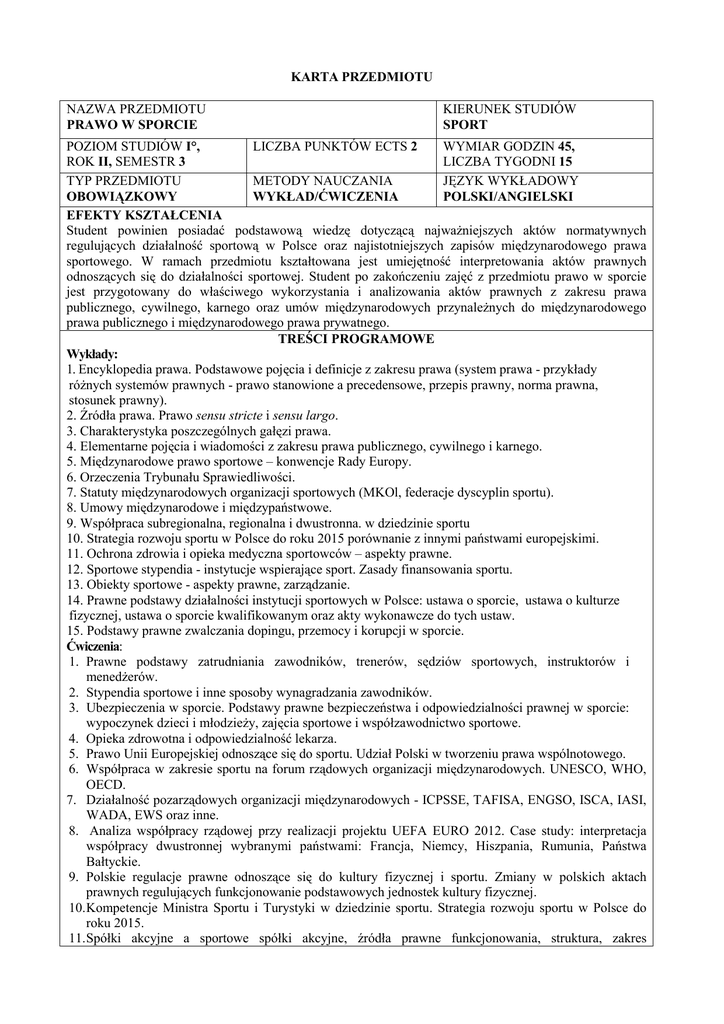 KARTA PRZEDMIOTU NAZWA PRZEDMIOTU PRAWO W SPORCIE KIERUNEK STUDIÓW SPORT POZIOM STUDIÓW I°, LICZBA PUNKTÓW ECTS 2 WYMIAR GODZIN 45, ROK II, SEMESTR 3 LICZBA TYGODNI 15 TYP PRZEDMIOTU METODY NAUCZANIA JĘZYK WYKŁADOWY OBOWIĄZKOWY WYKŁAD/ĆWICZENIA POLSKI/ANGIELSKI EFEKTY KSZTAŁCENIA Student powinien posiadać podstawową wiedzę dotyczącą najwaŜniejszych aktów normatywnych regulujących działalność sportową w Polsce oraz najistotniejszych zapisów międzynarodowego prawa sportowego. W ramach przedmiotu kształtowana jest umiejętność interpretowania aktów prawnych odnoszących się do działalności sportowej. Student po zakończeniu zajęć z przedmiotu prawo w sporcie jest przygotowany do właściwego wykorzystania i analizowania aktów prawnych z zakresu prawa publicznego, cywilnego, karnego oraz umów międzynarodowych przynaleŜnych do międzynarodowego prawa publicznego i międzynarodowego prawa prywatnego. TREŚCI PROGRAMOWE Wykłady: 1. Encyklopedia prawa. Podstawowe pojęcia i definicje z zakresu prawa (system prawa - przykłady róŜnych systemów prawnych - prawo stanowione a precedensowe, przepis prawny, norma prawna, stosunek prawny). 2. Źródła prawa. Prawo sensu stricte i sensu largo. 3. Charakterystyka poszczególnych gałęzi prawa. 4. Elementarne pojęcia i wiadomości z zakresu prawa publicznego, cywilnego i karnego. 5. Międzynarodowe prawo sportowe – konwencje Rady Europy. 6. Orzeczenia Trybunału Sprawiedliwości. 7. Statuty międzynarodowych organizacji sportowych (MKOl, federacje dyscyplin sportu). 8. Umowy międzynarodowe i międzypaństwowe. 9. Współpraca subregionalna, regionalna i dwustronna. w dziedzinie sportu 10. Strategia rozwoju sportu w Polsce do roku 2015 porównanie z innymi państwami europejskimi. 11. Ochrona zdrowia i opieka medyczna sportowców – aspekty prawne. 12. Sportowe stypendia - instytucje wspierające sport. Zasady finansowania sportu. 13. Obiekty sportowe - aspekty prawne, zarządzanie. 14. Prawne podstawy działalności instytucji sportowych w Polsce: ustawa o sporcie, ustawa o kulturze fizycznej, ustawa o sporcie kwalifikowanym oraz akty wykonawcze do tych ustaw. 15. Podstawy prawne zwalczania dopingu, przemocy i korupcji w sporcie. Ćwiczenia: 1. Prawne podstawy zatrudniania zawodników, trenerów, sędziów sportowych, instruktorów i menedŜerów. 2. Stypendia sportowe i inne sposoby wynagradzania zawodników. 3. Ubezpieczenia w sporcie. Podstawy prawne bezpieczeństwa i odpowiedzialności prawnej w sporcie: wypoczynek dzieci i młodzieŜy, zajęcia sportowe i współzawodnictwo sportowe. 4. Opieka zdrowotna i odpowiedzialność lekarza. 5. Prawo Unii Europejskiej odnoszące się do sportu. Udział Polski w tworzeniu prawa wspólnotowego. 6. Współpraca w zakresie sportu na forum rządowych organizacji międzynarodowych. UNESCO, WHO, OECD. 7. Działalność pozarządowych organizacji międzynarodowych - ICPSSE, TAFISA, ENGSO, ISCA, IASI, WADA, EWS oraz inne. 8. Analiza współpracy rządowej przy realizacji projektu UEFA EURO 2012. Case study: interpretacja współpracy dwustronnej wybranymi państwami: Francja, Niemcy, Hiszpania, Rumunia, Państwa Bałtyckie. 9. Polskie regulacje prawne odnoszące się do kultury fizycznej i sportu. Zmiany w polskich aktach prawnych regulujących funkcjonowanie podstawowych jednostek kultury fizycznej. 10. Kompetencje Ministra Sportu i Turystyki w dziedzinie sportu. Strategia rozwoju sportu w Polsce do roku 2015. 11. Spółki akcyjne a sportowe spółki akcyjne, źródła prawne funkcjonowania, struktura, zakres działalności. 12. Działalność gospodarcza prowadzona w związku ze sportem, sklepy sportowe, producenci sprzętu sportowego, działalność promocyjna, informacyjna, reklamowa i marketingowa 13. Podstawy prawne uprawiania sportu, prawa i obowiązki zawodnika. 14. Sądownictwo polubowne i rozstrzyganie sporów w sporcie. 15. Zwalczanie dopingu w sporcie. Działania UNESCO, Rady Europy, Unii Europejskiej i Światowej Agencji Anty-dopingowej. METODY OCENY Kolokwium zaliczeniowe. Zaliczenie prac semestralnych i sprawdzianów LITERATURA PODSTAWOWA I UZUPEŁNIAJĄCA Literatura podstawowa: • Cajsel W.: Ustawa o sporcie kwalifikowanym, Wyd. C H Beck, Warszawa 2006. • Stawecki T., Winczorek P., Wstęp do prawoznawstwa, Wydawnictwo C.H. Beck, Warszawa, 2003, • Jaczynowski L., Stopczyński M., śyśko J., Wypisy z podstawowych aktów prawnych dotyczących kultury fizycznej, Wydawnictwa AWF, Warszawa, 2007, • Korycki S., Kuciński J., Trzciński Z., Zaborowski J., Zarys prawa, Lexis Nexis, Warszawa, 2002, • Szwarc A., Prawo sportowe, akty prawne, ARS BONI et AEQUI, Poznań, 2003 • Szwarc A., Prawo sportowe, akty prawne [suplement], ARS BONI et AEQUI, Poznań, 2003 • Powołanie Komisji do Zwalczania Dopingu w Sporcie - rozporządzenie /2001.05.14/ - Dz.U.01.56.583, • Zakres i tryb działania Komisji do Zwalczania Dopingu w Sporcie - rozporządzenie /2001.10.17/ Dz.U.01.133.1501, • Szczegółowe zasady odpowiedzialności dyscyplinarnej za naruszenie przepisów antydopingowych rozporządzenie /2001.09.18/ - Dz.U.01.114.1217, • Baczewski A., Ryba B., Podstawy prawne bezpieczeństwa imprez sportowych, Polska Korporacja MenedŜerów Sportu, Warszawa, 2003 • Międzynarodowa Konwencja przeciw apartheidowi w sporcie, przyjęta przez Zgromadzenie Ogólne Organizacji Narodów Zjednoczonych. Nowy Jork.1985.12.10., • Konwencja antydopingowa. Strasburg.1989.11.16., • Europejska konwencja w sprawie przemocy i ekscesów widzów w czasie imprez sportowych, a w szczególności meczów piłki noŜnej. Strasburg.1985.08.19. Literatura uzupełniająca: • Stangreciak R.: Ubezpieczenia osobowe i majątkowe w sporcie, Wyd. PKMS, Warszawa 2002. • Cajsel W.: Podstawy prawne zatrudniania zawodników profesjonalnych, Wyd. C H. Beck, Warszawa 2004.