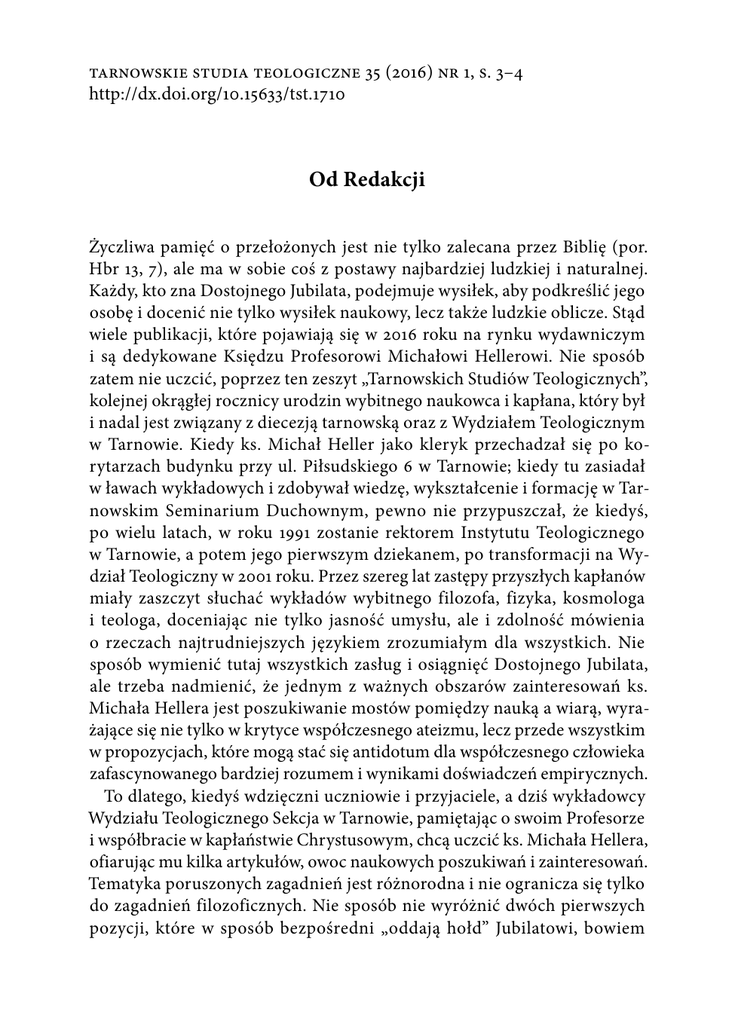 Tarnowskie Studia Teologiczne 35 (2016) nr 1, s. 3–4 http://dx.doi.org/10.15633/tst.1710 Od Redakcji Życzliwa pamięć o przełożonych jest nie tylko zalecana przez Biblię (por. Hbr 13, 7), ale ma w sobie coś z postawy najbardziej ludzkiej i naturalnej. Każdy, kto zna Dostojnego Jubilata, podejmuje wysiłek, aby podkreślić jego osobę i docenić nie tylko wysiłek naukowy, lecz także ludzkie oblicze. Stąd wiele publikacji, które pojawiają się w 2016 roku na rynku wydawniczym i są dedykowane Księdzu Profesorowi Michałowi Hellerowi. Nie sposób zatem nie uczcić, poprzez ten zeszyt „Tarnowskich Studiów Teologicznych”, kolejnej okrągłej rocznicy urodzin wybitnego naukowca i kapłana, który był i nadal jest związany z diecezją tarnowską oraz z Wydziałem Teologicznym w Tarnowie. Kiedy ks. Michał Heller jako kleryk przechadzał się po korytarzach budynku przy ul. Piłsudskiego 6 w Tarnowie; kiedy tu zasiadał w ławach wykładowych i zdobywał wiedzę, wykształcenie i formację w Tarnowskim Seminarium Duchownym, pewno nie przypuszczał, że kiedyś, po wielu latach, w roku 1991 zostanie rektorem Instytutu Teologicznego w Tarnowie, a potem jego pierwszym dziekanem, po transformacji na Wydział Teologiczny w 2001 roku. Przez szereg lat zastępy przyszłych kapłanów miały zaszczyt słuchać wykładów wybitnego filozofa, fizyka, kosmologa i teologa, doceniając nie tylko jasność umysłu, ale i zdolność mówienia o rzeczach najtrudniejszych językiem zrozumiałym dla wszystkich. Nie sposób wymienić tutaj wszystkich zasług i osiągnięć Dostojnego Jubilata, ale trzeba nadmienić, że jednym z ważnych obszarów zainteresowań ks. Michała Hellera jest poszukiwanie mostów pomiędzy nauką a wiarą, wyrażające się nie tylko w krytyce współczesnego ateizmu, lecz przede wszystkim w propozycjach, które mogą stać się antidotum dla współczesnego człowieka zafascynowanego bardziej rozumem i wynikami doświadczeń empirycznych. To dlatego, kiedyś wdzięczni uczniowie i przyjaciele, a dziś wykładowcy Wydziału Teologicznego Sekcja w Tarnowie, pamiętając o swoim Profesorze i współbracie w kapłaństwie Chrystusowym, chcą uczcić ks. Michała Hellera, ofiarując mu kilka artykułów, owoc naukowych poszukiwań i zainteresowań. Tematyka poruszonych zagadnień jest różnorodna i nie ogranicza się tylko do zagadnień filozoficznych. Nie sposób nie wyróżnić dwóch pierwszych pozycji, które w sposób bezpośredni „oddają hołd” Jubilatowi, bowiem 4 Od Redakcji za punkt wyjścia wzięły publikacje i poglądy ks. Michała Hellera. Jeden z autorów próbuje zarysować jego wkład w tworzenie współczesnej dziedziny naukowej nazywanej teologią nauki; drugi z kolei pochyla się nad tym, co stanowi jedno z głównych zadań prezbiterów i prezentuje nietuzinkowy, może nawet „hellerowski” sposób głoszenia słowa Bożego. W ten oto sposób, choć krótko, można zapoznać się z tymi dwoma wymiarami życia jedynego polskiego laureata Nagrody Templetona. Trzy kolejne teksty związane są z różnymi dziedzinami filozofii, zaś następne poruszają aktualne tematy teologiczne i współczesny problem globalizacji. Należy zaznaczyć, że cztery spośród artykułów są związane bezpośrednio z realizacją zadań statutowych Wydziału Teologicznego Sekcja w Tarnowie, który dba o ukazywanie studentom aktualnych problemów i wyzwań, przed jakimi staje dzisiaj Kościół. Są to poszerzone opracowania naukowe wykładów wygłoszonych publicznie do kleryków i studentów świeckich, przy dwóch różnych okazjach. Trzy artykuły (autorstwa ks. Janusza Królikowskiego, ks. Artura Maliny i ks. Piotra Łabudy) koncentrują się wokół Biblii, bowiem to zagadnienie zostało zaproponowane klerykom z okazji seminaryjnego odpustu ku czci św. Tomasza z Akwinu, obchodzonego 7 marca 2015 roku. Natomiast artykuł autorstwa ks. Stanisława Garnczarskiego jest świadectwem wykładu inaugurującego rok akademicki 2015–2016 (13 października 2015). Wreszcie, uważny czytelnik zauważy, że pośród artykułów, na samym końcu zamieszczono tekst w języku włoskim. Wynika to z decyzji zespołu redakcyjnego, aby od bieżącego roku w czasopiśmie mogły być publikowane także teksty w innych językach, które w świecie nauki uchodzą za oficjalne (angielski, niemiecki, francuski, hiszpański, portugalski i włoski). Dwie ostatnie części czasopisma zwracają uwagę na aktualne wydarzenia naukowe Wydziału Teologicznego Sekcja w Tarnowie oraz próbują ocenić wybrane publikacje niezwiązane ze środowiskiem tarnowskim. Ufamy, że niniejszy zeszyt „Tarnowskich Studiów Teologicznych”, w swojej zwyczajnej formie będzie najlepszą formą uczczenia wybitnego tarnowskiego kapłana i światowej sławy naukowca, który pomimo wielu osiągnięć, nagród i wyróżnień, prowadzi zwyczajne życie, nacechowane religijną i naukową pokorą. Ad multos annos, dostojny Jubilacie, Księże Profesorze Michale! Byli i obecni wykładowcy Wydziału Teologicznego Sekcja w Tarnowie Uniwersytetu Papieskiego Jana Pawła II w Krakowie