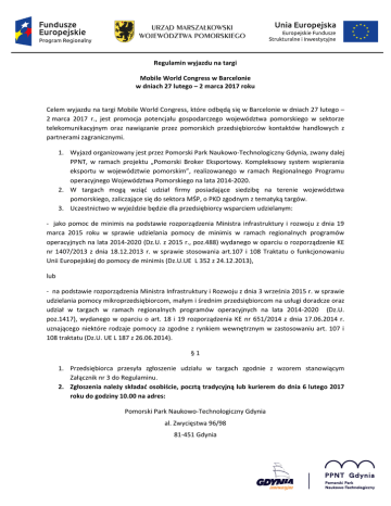 Regulamin wyjazdu na targi Mobile World Congress w Barcelonie w dniach 27 lutego – 2 marca 2017 roku Celem wyjazdu na targi Mobile World Congress, które odbędą się w Barcelonie w dniach 27 lutego – 2 marca 2017 r., jest promocja potencjału gospodarczego województwa pomorskiego w sektorze telekomunikacyjnym oraz nawiązanie przez pomorskich przedsiębiorców kontaktów handlowych z partnerami zagranicznymi. 1. Wyjazd organizowany jest przez Pomorski Park Naukowo-Technologiczny Gdynia, zwany dalej PPNT, w ramach projektu „Pomorski Broker Eksportowy. Kompleksowy system wspierania eksportu w województwie pomorskim”, realizowanego w ramach Regionalnego Programu operacyjnego Województwa Pomorskiego na lata 2014-2020. 2. W targach mogą wziąć udział firmy posiadające siedzibę na terenie województwa pomorskiego, zaliczające się do sektora MŚP, o PKD zgodnym z tematyką targów. 3. Uczestnictwo w wyjeździe będzie dla przedsiębiorcy wsparciem udzielanym: - jako pomoc de minimis na podstawie rozporządzenia Ministra infrastruktury i rozwoju z dnia 19 marca 2015 roku w sprawie udzielania pomocy de minimis w ramach regionalnych programów operacyjnych na lata 2014-2020 (Dz.U. z 2015 r., poz.488) wydanego w oparciu o rozporządzenie KE nr 1407/2013 z dnia 18.12.2013 r. w sprawie stosowania art.107 i 108 Traktatu o funkcjonowaniu Unii Europejskiej do pomocy de minimis (Dz.U.UE L 352 z 24.12.2013), lub - na podstawie rozporządzenia Ministra Infrastruktury i Rozwoju z dnia 3 września 2015 r. w sprawie udzielania pomocy mikroprzedsiębiorcom, małym i średnim przedsiębiorcom na usługi doradcze oraz udział w targach w ramach regionalnych programów operacyjnych na lata 2014-2020 (Dz.U. poz.1417), wydanego w oparciu o art. 18 i 19 rozporządzenia KE nr 651/2014 z dnia 17.06.2014 r. uznającego niektóre rodzaje pomocy za zgodne z rynkiem wewnętrznym w zastosowaniu art. 107 i 108 traktatu (Dz.U. UE L 187 z 26.06.2014). §1 1. Przedsiębiorca przesyła zgłoszenie udziału w targach zgodnie z wzorem stanowiącym Załącznik nr 3 do Regulaminu. 2. Zgłoszenia należy składać osobiście, pocztą tradycyjną lub kurierem do dnia 6 lutego 2017 roku do godziny 10.00 na adres: Pomorski Park Naukowo-Technologiczny Gdynia al. Zwycięstwa 96/98 81-451 Gdynia 3. Otwarcie nadesłanych zgłoszeń nastąpi w dniu 06.02.2017 roku o godz. 13.00. 4. Nadesłane zgłoszenia oceniane są przez Komisję Kwalifikacyjną na podstawie szczegółowych kryteriów stanowiących Załącznik nr 1. 5. W pierwszej kolejności kwalifikowani będą przedsiębiorcy o najwyższej liczbie punktów. W przypadku uzyskania takiej samej liczby punktów przez większą liczbę przedsiębiorców mogą zostać zastosowane dodatkowe kryteria kwalifikacyjne, o których zadecyduje Komisja kwalifikacyjna. 6. Do udziału w targach zostanie zakwalifikowanych maksymalnie 8 przedsiębiorców maksymalnie po 2 przedstawicieli reprezentujących jednego przedsiębiorcę. PPNT Gdynia zastrzega sobie prawo do zwiększenia bądź zmniejszenia liczby uczestników wyjazdu oraz do rezygnacji z organizacji wyjazdu. 7. Reprezentanci przedsiębiorców zgłoszeni do wyjazdu musza znać język angielski w stopniu umożliwiającym samodzielną prezentację oferty handlowej w trakcie targów. 8. Z każdym zakwalifikowanym przedsiębiorcą biorącym udział w targach zawarta zostanie umowa o dofinansowanie udziału w wyjeździe na targi. Wzór umowy stanowi Załącznik nr 2 do niniejszego regulaminu. Przed podpisanie umowy przedsiębiorca jest zobowiązany do dostarczenia dokumentów niezbędnych do ubiegania się o pomoc de minimis - Załączników nr 4,5,6 do niniejszego regulaminu lub przy ubieganiu się o pomoc publiczną Załącznika nr 7 do niniejszego regulaminu. 9. Przedsiębiorcy zostaną poinformowani o zakwalifikowaniu do wyjazdu najpóźniej w terminie 14 dni od terminu składania zgłoszeń. §2 1. Koszty uczestnictwa przedsiębiorcy w targach pokrywane przez PPNT obejmują: - koszt przelotu na trasie Gdańsk – Barcelona – Gdańsk, - koszty zakwaterowania na miejscu, - koszty wstępu na Targi, - koszty wynajmu i zabudowy powierzchni wystawienniczej. 2. Koszt udziału przedsiębiorcy finansowany przez PPNT szacowany jest na 21 300 zł. Koszt udziału drugiego przedstawiciela szacowany jest na 5 000 zł. Ostateczny koszt uczestnictwa będzie znany po zakończeniu wyjazdu i rozliczeniu wszystkich faktur. 3. Maksymalny poziom dofinansowania na jednego pracownika firmy będzie wynosił: a) 85% kosztu wskazanego w § 2 pkt 2, w przypadku skorzystania z pomocy de minimis; b) 50% kosztu wskazanego w § 2 pkt 2, w przypadku skorzystania z pomocy publicznej na udział w targach. 4. Koszty uczestnictwa nieobjęte dofinansowaniem będą stanowiły wkład własny Przedsiębiorcy. Po zakończeniu wyjazdu i rozliczeniu wszystkich faktur Organizator wystawi notę obciążeniową z tytułu wkładu własnego z ostatecznym kosztem uczestnictwa. 5. Przedsiębiorca jest zobowiązany do pokrycia szacunkowych kosztów uczestnictwa nie później, niż 5 dni roboczych od dnia podpisania umowy. Wpłaty należy dokonać na rachunek bankowy Organizatora o numerze 02-1440-1084-0000-0000-0448-5939. Brak wpłaty jest jednoznaczny ze skreśleniem z listy uczestników wyjazdu. 6. W przypadku, gdy po rozliczeniu wszystkich faktur ostateczny koszt uczestnictwa Przedsiębiorcy w wyjeździe będzie większy od kwoty o której mowa w pkt. 5, Organizator zwróci różnicę Przedsiębiorcy. W przypadku gdy ostateczny koszt będzie mniejszy od kwoty o której mowa w pkt. 5 przedsiębiorca wpłaci różnice na konto Organizatora. 7. W przypadku rezygnacji z wyjazdu wpłacony wkład własny zostanie zwrócony Przedsiębiorcy. W przypadku poniesienia przez Organizatora kosztów związanych z udziałem przedsiębiorcy w targach wpłacony kwota zostanie odpowiednio pomniejszona. 8. Wydatki związane z kosztami ubezpieczenia NNW i zdrowotnego, dietami pobytowymi, koszt