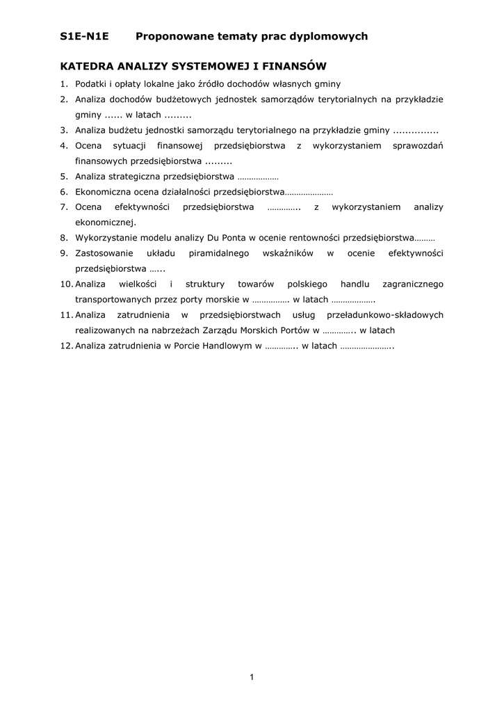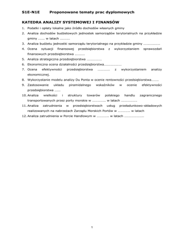S1E-N1E Proponowane tematy prac dyplomowych KATEDRA ANALIZY SYSTEMOWEJ I FINANSÓW 1. Podatki i opłaty lokalne jako źródło dochodów własnych gminy 2. Analiza dochodów budżetowych jednostek samorządów terytorialnych na przykładzie gminy ...... w latach ......... 3. Analiza budżetu jednostki samorządu terytorialnego na przykładzie gminy ............... 4. Ocena sytuacji finansowej przedsiębiorstwa z wykorzystaniem sprawozdań finansowych przedsiębiorstwa ......... 5. Analiza strategiczna przedsiębiorstwa ……………… 6. Ekonomiczna ocena działalności przedsiębiorstwa………………… 7. Ocena efektywności przedsiębiorstwa ………….. z wykorzystaniem analizy ekonomicznej. 8. Wykorzystanie modelu analizy Du Ponta w ocenie rentowności przedsiębiorstwa……… 9. Zastosowanie układu piramidalnego wskaźników w ocenie efektywności przedsiębiorstwa …... 10. Analiza wielkości i struktury towarów polskiego handlu zagranicznego transportowanych przez porty morskie w ……………. w latach ………………. 11. Analiza zatrudnienia w przedsiębiorstwach usług przeładunkowo-składowych realizowanych na nabrzeżach Zarządu Morskich Portów w ………….. w latach 12. Analiza zatrudnienia w Porcie Handlowym w ………….. w latach ………………….. 1 S1E-N1E Proponowane tematy prac dyplomowych KATEDRA EKONOMII 1. Innowacyjność jako czynnik rozwoju przedsiębiorstwa. 2. Efekty polityki wspierania innowacyjności. MŚP w Polsce na wybranym sektorze. 3. Determinanty rozwoju regionalnego w polskiej gospodarce na przykładzie województwa …… 4. Światowe doświadczenia wykorzystywania klastrów dla rozwoju regionu. 5. Franchising jako strategia rozwoju przedsiębiorstwa na wybranym przykładzie (przykładach). 6. Wykorzystanie alternatywnych źródeł finansowania dla rozwoju firmy………… . 7. Strategia integracji jako czynnik rozwoju firmy …………. . 8. Wykorzystanie regionalnego systemu innowacji w województwie ………. dla rozwoju. 9. Analiza ekonomiczna firmy …… w latach ……… . 10. Globalny kryzys gospodarczy i jego wpływ na polską gospodarkę. 11. Determinanty rozwoju wybranej firmy w latach ………….. . 12. Oddziaływanie polityki ….. na …… problem bezrobocia (ograniczenia wykluczenia itp.). 13. Wykorzystanie środków pomocowych UE dla rozwoju regionu. 14. Ocena wpływu środków z funduszy unijnych na firmy (regionu) ………… w latach ……. 15. Problem kobiet (innych grup) na rynku pracy i możliwości jego przezwyciężenia w Polsce. KATEDRA EKONOMII – ZAKŁAD EKONOMIKI KSZTAŁCENIA 1. Zasoby pracy i optymalizacja ich wykorzystania. 2. Alokacja siły roboczej poprzez wykształcenie. 3. Społeczno - ekonomiczna efektywność kształcenia. 4. Motywowanie jako sposób zarządzania ludźmi. 5. Człowiek – praca, maszyna, relacje, zależności i skutki w kontekście efektywności pracy. 6. Kwalifikacje jako czynnik humanizacji pracy. 7. Rynek pracy a kształcenie kadr (walka z bezrobociem). 8. Finansowanie oświaty na przykładzie szkoły lub gminy. 9. Aktywne formy walki z bezrobociem. 10. Identyfikacja i przyczyny bezrobocia w województwie zachodniopomorskim. 11. Bariery rynku pracy w województwie zachodniopomorskim. 12. Aspiracje i antycypacje zawodowe studentów (na przykładzie studentów ekonomii). 13. Specyfika polityki personalnej w organizacji. 14. System ocen okresowych pracowników w organizacji. 15. Przyczyny powstawania konfliktów i zarządzanie konfliktem w organizacji. 2 S1E-N1E Proponowane tematy prac dyplomowych 16. Istota, znaczenie i struktura procesu adaptacji pracownika w organizacji. 17. Kierowanie ludźmi w organizacji, style kierowania. 18. Przydatność zawodowa pracowników i jej determinanty. 19. Psychospołeczne problemy pracy. 20. Kapitał ludzki determinantą sukcesu organizacji, regionu, państwa – istota, determinanty i elementy składowe 21. Aktywne formy walki z bezrobociem. 22. Problemy współczesnej oświaty-zawody przyszłości. 23. Stosunki interpersonalne w pracy. 24. Etyczne problemy w kierowaniu ludźmi. 3 S1E-N1E Proponowane tematy prac dyplomowych KATEDRA EKONOMII MENEDŻERSKIEJ I RACHUNKOWOŚCI PRACE Z ZAKRESU EKONOMII MENEDŻERSKIEJ 1. Ocena decyzji kredytowych na przykładzie wybranego banku 2. Analiza struktury kapitałowej firmy na przykładzie wybranego przedsiębiorstwa 3. Wykorzystanie analizy wskaźnikowej do oceny standingu finansowego firmy na przykładzie wybranego przedsiębiorstwa 4. Zarządzanie kapitałem pracującym w przedsiębiorstwie produkcyjnym na przykładzie wybranej firmy 5. Analiza metod oceny zdolności kredytowej na przykładzie wybranego banku komercyjnego 6. Analiza finansowa jako instrument oceny sytuacji firmy na przykładzie wybranego przedsiębiorstwa 7. Analiza rozwoju bankowości elektronicznej na przykładzie wybranego banku komercyjnego 8. Analiza płynności finansowej firmy na przykładzie wybranego przedsiębiorstwa 9. Społeczna odpowiedzialność przedsiębiorstwa w strategii zarządzania firmą 10. Źródła finansowania działalności sektora MSP 11. Źródła finansowania nieruchomości 12. Ocena polityki budżetowej wybranej jednostki samorządu terytorialnego 13. Wykorzystanie sprawozdań finansowych do oceny kondycji finansowej wybranego przedsiębiorstwa 14. Wpływ systemu podatkowego na wynik finansowy firmy na przykładzie wybranego przedsiębiorstwa PRACE Z ZAKRESU RACHUNKOWOŚCI 1. Sprawozdanie finansowe jako źródło informacji o jednostce gospodarczej na przykładzie wybranego przedsiębiorstwa 2. Sprawozdawczość finansowa jako podstawa do oceny efektywności gospodarowania majątkiem 3. Specyfika rachunkowości …(np. w jednostkach sektora finansów publicznych, jednostek nie prowadzących działalności gospodarczej itd.) na przykładzie wybranych podmiotów 4. Organizacja rachunkowości w przedsiębiorstwie na przykładzie … 5. Organizacja dokumentacji księgowej w jednostkach g