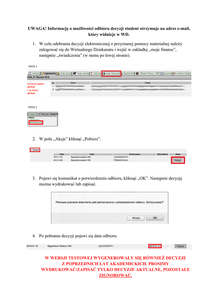 UWAGA! Informację o możliwości odbioru decyzji student otrzymuje na adres e-mail, który widnieje w WD. 1. W celu odebrania decyzji elektronicznej o przyznanej pomocy materialnej należy zalogować się do Wirtualnego Dziekanatu i wejść w zakładkę „moje finanse”, następnie „świadczenia” (w menu po lewej stronie). 2. W polu „Akcje” kliknąć „Pobierz”. 3. Pojawi się komunikat o potwierdzeniu odbioru, kliknąć „OK”. Następnie decyzję można wydrukować lub zapisać. 4. Po pobraniu decyzji pojawi się data odbioru. W WERSJI TESTOWEJ WYGENEROWAŁY SIĘ RÓWNIEŻ DECYZJE Z POPRZEDNICH LAT AKADEMICKICH. PROSIMY WYDRUKOWAĆ/ZAPISAĆ TYLKO DECYZJE AKTUALNE, POZOSTAŁE ZIGNOROWAĆ.