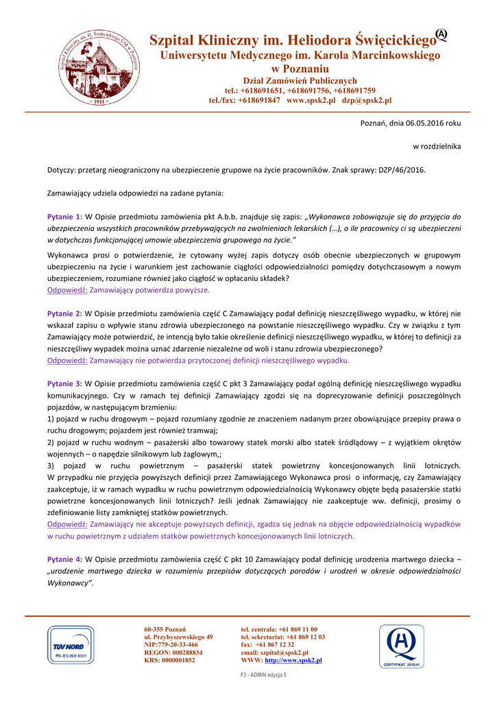 Szpital Kliniczny im. Heliodora Święcickiego Uniwersytetu Medycznego im. Karola Marcinkowskiego w Poznaniu Dział Zamówień Publicznych tel.: +618691651, +618691756, +618691759 tel./fax: +618691847 www.spsk2.pl [email protected] Poznań, dnia 06.05.2016 roku w rozdzielnika Dotyczy: przetarg nieograniczony na ubezpieczenie grupowe na życie pracowników. Znak sprawy: DZP/46/2016. Zamawiający udziela odpowiedzi na zadane pytania: Pytanie 1: W Opisie przedmiotu zamówienia pkt A.b.b. znajduje się zapis: „Wykonawca zobowiązuje się do przyjęcia do ubezpieczenia wszystkich pracowników przebywających na zwolnieniach lekarskich (…), o ile pracownicy ci są ubezpieczeni w dotychczas funkcjonującej umowie ubezpieczenia grupowego na życie.” Wykonawca prosi o potwierdzenie, że cytowany wyżej zapis dotyczy osób obecnie ubezpieczonych w grupowym ubezpieczeniu na życie i warunkiem jest zachowanie ciągłości odpowiedzialności pomiędzy dotychczasowym a nowym ubezpieczeniem, rozumiane również jako ciągłość w opłacaniu składek? Odpowiedź: Zamawiający potwierdza powyższe. Pytanie 2: W Opisie przedmiotu zamówienia część C Zamawiający podał definicję nieszczęśliwego wypadku, w której nie wskazał zapisu o wpływie stanu zdrowia ubezpieczonego na powstanie nieszczęśliwego wypadku. Czy w związku z tym Zamawiający może potwierdzić, że intencją było takie określenie definicji nieszczęśliwego wypadku, w której to definicji za nieszczęśliwy wypadek można uznać zdarzenie niezależne od woli i stanu zdrowia ubezpieczonego? Odpowiedź: Zamawiający nie potwierdza przytoczonej definicji nieszczęśliwego wypadku. Pytanie 3: W Opisie przedmiotu zamówienia część C pkt 3 Zamawiający podał ogólną definicję nieszczęśliwego wypadku komunikacyjnego. Czy w ramach tej definicji Zamawiający zgodzi się na doprecyzowanie definicji poszczególnych pojazdów, w następującym brzmieniu: 1) pojazd w ruchu drogowym – pojazd rozumiany zgodnie ze znaczeniem nadanym przez obowiązujące przepisy prawa o ruchu drogowym; pojazdem jest również tramwaj; 2) pojazd w ruchu wodnym – pasażerski albo towarowy statek morski albo statek śródlądowy – z wyjątkiem okrętów wojennych – o napędzie silnikowym lub żaglowym,; 3) pojazd w ruchu powietrznym – pasażerski statek powietrzny koncesjonowanych linii lotniczych. W przypadku nie przyjęcia powyższych definicji przez Zamawiającego Wykonawca prosi o informację, czy Zamawiający zaakceptuje, iż w ramach wypadku w ruchu powietrznym odpowiedzialnością Wykonawcy objęte będą pasażerskie statki powietrzne koncesjonowanych linii lotniczych? Jeśli jednak Zamawiający nie zaakceptuje ww. definicji, prosimy o zdefiniowanie listy zamkniętej statków powietrznych. Odpowiedź: Zamawiający nie akceptuje powyższych definicji, zgadza się jednak na objęcie odpowiedzialnością wypadków w ruchu powietrznym z udziałem statków powietrznych koncesjonowanych linii lotniczych. Pytanie 4: W Opisie przedmiotu zamówienia część C pkt 10 Zamawiający podał definicję urodzenia martwego dziecka – „urodzenie martwego dziecka w rozumieniu przepisów dotyczących porodów i urodzeń w okresie odpowiedzialności Wykonawcy”. 60-355 Poznań ul. Przybyszewskiego 49 NIP:779-20-33-466 REGON: 000288834 KRS: 0000001852 tel. centrala: +61 869 11 00 tel. sekretariat: +61 869 12 03 fax: +61 867 12 32 email: [email protected] WWW: http://www.spsk2.pl F3 - ADMIN edycja 5 Czy Wykonawca ma rozumieć, że Zamawiający powołując się w ww. definicji na przepisy dotyczące porodów i urodzeń ma na myśli przepisy Prawo o aktach stanu cywilnego? Czy Zamawiający zaakceptuje „urodzenie martwego dziecka w rozumieniu przepisów dotyczących porodów i urodzeń w okresie odpowiedzialności Wykonawcy, jeżeli urodzenie zostało zarejestrowane”? Odpowiedz: Zamawiający akceptuje definicję w przytoczonym brzmieniu. Pytanie 5: Opis przedmiotu zamówienia część C pkt 11 – czy Zamawiający zaakceptuje doprecyzowanie w przypadku definicji rodzica małżonka ubezpieczonego: matka lub ojciec aktualnego współmałżonka ubezpieczonego, albo ojczym lub macocha małżonka ubezpieczonego, jeżeli nie żyje matka lub ojciec małżonka ubezpieczonego? Odpowiedź: nie akceptujemy powyższej propozycji. Pytanie 6: Czy Zamawiający zgodzi się na przyjęcie w ubezpieczeniu trwałego uszczerbku na zdrowiu spowodowanego zawałem serca lub udarem mózgu oraz poważnych zachorowań poniższej definicji zawału serca: zawał serca - tylko taki zawał serca, który powoduje: a) wzrost lub spadek podwyższonego stężenia biomarkerów sercowych, z zastrzeżeniem, że przynajmniej w jednym pomiarze to stężenie musi przekraczać górną granicę normy oraz obecność co najmniej dwóch z następujących wykładników niedokrwienia mięśnia sercowego: objawy kliniczne niedokrwienia (m.in. ból w klatce piersiowej), zmiany w zapisie elektrokardiograficznym (EKG) typowe dla nowo powstałego niedokrwienia, nowe odcinkowe zaburzenia kurczliwości w badaniach obrazowych lub b) zwiększenie stężenia biomarkerów sercowych do wartości przekraczającej trzykrotnie górną granicę normy, przy prawidłowym ich poziomie wyjściowym w przypadku zabiegu przezskórnej interwencji wieńcowej (PCI), lub c) zwiększenie stężenia biomarkerów sercowych – w przypadku pomostowania tętnic wieńcowych (CABG) – do wartości przekraczającej pięciokrotnie górną granicę normy, przy prawidłowym ich poziomie wyjściowym oraz pojawienie się jednego z następujących objawów: nowych patologicznych załamków Q lub nowego bloku lewej odnogi pęczka Hisa, udokumentowanej angiograficznie niedrożności pomostu wieńcowego lub nowej niedrożności natywnej tętnicy wieńcowej, udokumentowanej badaniem obrazowym nowej martwicy mięśnia sercowego? Odpowiedź: nie akceptujemy powyższej definicji Pytanie 7: Czy Zamawiający zgodzi się na przyjęcie w ubezp