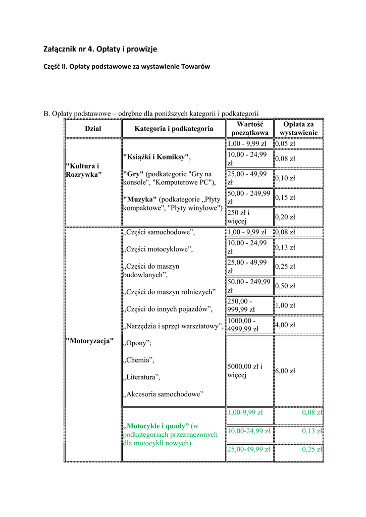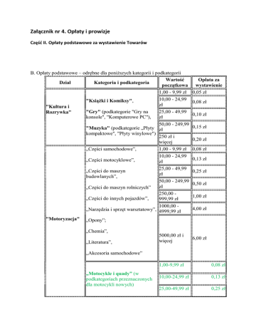 Załącznik nr 4. Opłaty i prowizje Część II. Opłaty podstawowe za wystawienie Towarów B. Opłaty podstawowe – odrębne dla poniższych kategorii i podkategorii Wartość Dział Kategoria i podkategoria początkowa 1,00 - 9,99 zł 10,00 - 24,99 "Książki i Komiksy", zł "Kultura i "Gry" (podkategorie "Gry na 25,00 - 49,99 Rozrywka" konsole", "Komputerowe PC"), zł 50,00 - 249,99 "Muzyka" (podkategorie „Płyty zł kompaktowe", "Płyty winylowe") 250 zł i więcej „Części samochodowe”, 1,00 - 9,99 zł 10,00 - 24,99 „Części motocyklowe”, zł 25,00 - 49,99 „Części do maszyn zł budowlanych”, 50,00 - 249,99 zł „Części do maszyn rolniczych” 250,00 „Części do innych pojazdów”, 999,99 zł 1000,00 „Narzędzia i sprzęt warsztatowy”, 4999,99 zł "Motoryzacja" Opłata za wystawienie 0,05 zł 0,08 zł 0,10 zł 0,15 zł 0,20 zł 0,08 zł 0,13 zł 0,25 zł 0,50 zł 1,00 zł 4,00 zł „Opony”; „Chemia”, „Literatura”, 5000,00 zł i więcej 6,00 zł „Akcesoria samochodowe” „Motocykle i quady” (w podkategoriach przeznaczonych dla motocykli nowych) 1,00-9,99 zł 0,08 zł 10,00-24,99 zł 0,13 zł 25,00-49,99 zł 0,25 zł 50,00-249,99 zł 0,50 zł 250-999,99 zł 1,00 zł 1000-4999,99 zł 4,00 zł 5000 zł i więcej 6zł C. Opłaty podstawowe – o charakterze ryczałtowym 1. Opłaty te są stałe, niezależnie od wartości oferowanego Towaru i wynoszą: Opłata za Dział Kategoria i podkategoria wystawienie "Samochody" oraz "Maszyny rolnicze" 25,00 zł "Motocykle i quady" (w podkategoriach przeznaczonych dla motocykli i quadów 15,00 zł używanych)", "Inne pojazdy i łodzie", "Przyczepy, naczepy" oraz "Wózki widłowe" "Motoryzacja" „Motocykle i quady”(w podkategoriach przeznaczonych dla motocykli i quadów nowych) "Maszyny budowlane" - z wyjątkiem wózków widłowych „Nieruchomości” - za wyjątkiem podkategorii „Pokoje do wynajęcia”, „Gotowe domy bez działki”, „Garaże i miejsca postojowe” oraz „Projekty domów” „Nieruchomości” – podkategorie „Pokoje do wynajęcia”, „Gotowe domy bez działki” oraz „Garaże i miejsca postojowe” "Dom i zdrowie” „Nieruchomości” – podkategoria „Projekty domów” Wszystkie podkategorie „Meble na wymiar” w ramach kategorii „Dom i ogród > Meble” „Kuchnia na zamówienie” w ramach kategorii „Dom i ogród > Meble > Kuchnia” „Żywe zwierzęta” w ramach kategorii „Dom i ogród > Zwierzęta” „Biżuteria i zegarki”, „Delikatesy”, „Erotyka”, „Filmy”, „Fotografia” oraz „Konsole i automaty” – oferty opublikowane w ramach konta nie będącego Kontem Firma 1,00 zł 30,00 zł 20,00 zł 5,00 zł 3,00 zł 9,00 zł 9,00 zł 2,00 zł 0,25 zł „Biżuteria i zegarki”, „Delikatesy”, „Erotyka”, „Filmy”, „Fotografia” oraz „Konsole i automaty” – oferty opublikowane w ramach Konta Brak opłat Firma „Sport i wypoczynek” „Wakacje” 15,00 zł 9,00 zł