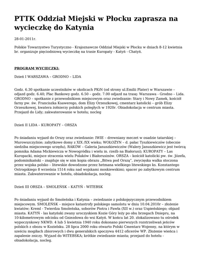 PTTK Oddział Miejski w Płocku zaprasza na wycieczkę do Katynia 28-01-2011r. Polskie Towarzystwo Turystyczno - Krajoznawcze Oddział Miejski w Płocku w dniach 8-12 kwietnia br. organizuje pięciodniową wycieczkę na trasie Kuropaty - Katyń - Chatyń. PROGRAM WYCIECZKI: Dzień I WARSZAWA – GRODNO – LIDA Godz. 6.30 spotkanie uczestników w okolicach PKiN (od strony ul.Emilii Plater) w Warszawie – odjazd godz. 6.40; Plac Bankowy godz. 6.50 – godz. 7.00 odjazd na trasę: Warszawa - Grodno – Lida. GRODNO – spotkanie z przewodnikiem miejscowym oraz zwiedzanie: Stary i Nowy Zamek, kościół farny pw. św. Franciszka Ksawerego, dom Elizy Orzeszkowej, cmentarz katolicki – grób Elizy Orzeszkowej, kwatera żołnierzy polskich poległych w 1920r. Obiadokolacja w centrum miasta. Przejazd do Lidy; zakwaterowanie w hotelu; nocleg Dzień II LIDA – KUROPATY – ORSZA Po śniadaniu wyjazd do Orszy oraz zwiedzanie: IWIE – drewniany meczet w osadzie tatarskiej – Murowszczyźnie; zabytkowe domy z XIX /XX wieku; WOŁOŻYN – d. pałac Tyszkiewiczów (obecnie siedziba miejscowego urzędu), RAKÓW – Galeria Januszkiewiczów (Walery Januszkiewicz jest twórcą pomnika Adama Mickiewicza w Nowogródku i wielu in. rzeźb na Białorusi); KUROPATY – Las Kuropacki, miejsce stracenia wielu Polaków i Białorusinów. ORSZA – kościół katolicki pw. św. Józefa, podominikański – znajduje się w nim kopia obrazu „Bitwa pod Orszą”, zwycięska walka stoczona przez wojska polsko – litewskie dowodzone przez hetmana wielkiego litewskiego ks. Konstantego Ostrogskiego 8 września 1514 roku nad wojskami moskiewskimi; spacer po zabytkowym centrum miasta. Zakwaterowanie w hotelu, obiadokolacja, nocleg. Dzień III ORSZA – SMOLEŃSK – KATYŃ - WITEBSK Po śniadaniu wyjazd do Smoleńska i Katynia – zwiedzanie z polskojęzycznym przewodnikiem miejscowym. SMOLEŃSK – miejsce katastrofy polskiego samolotu w dniu 10.04.2010r – złożenie kwiatów; Kreml - Twierdza Smoleńska, soborów Piotra i Pawła (XII w.) oraz Uspieńskiego; objazd miasta. KATYŃ - las katyński zwany uroczyskiem Kozie Góry leży po obu brzegach Dniepru, na 10-kilometrowym odcinku od Gniezdowa do wsi Katyń. W końcu lat 20. zlokalizowano tu ośrodek wypoczynkowy NKWD. 4 lub 5 kwietnia 1940 roku dokonano pierwszych rozstrzeliwań jeńców polskich z obozu w Kozielsku. 28 lipca 2000 roku otwarto Polski Cmentarz Wojenny, na którym w sześciu mogiłach zbiorowych i dwu generalskich spoczywa 4412 oficerów WP. Złożenie wieńca i zapalenie zniczy. Wyjazd do WITEBSKA; krótkie zwiedzanie miasta; przejazd do hotelu obiadokolacja, nocleg. Dzień IV WITEBSK – CHATYŃ - MIŃSK – BARANOWICZE Śniadanie. Wykwaterowanie z hotelu. Przejazd do Baranowicz. Na trasie przejazdu zwiedzanie: CHATYŃ – memoriał upamiętniający pacyfikację 618 wsi białoruskich podczas II wojny światowej na miejscu wsi o tej samej nazwie unicestwionej w marcu 1943r.; MIŃSK - kościół pw. św. Szymona i Heleny; ratusz, d. zespół klasztorny bernardynek obecnie sobór prawosławny, dwór Wańkowiczów, dom - miejsce kilkunastoletniego pobytu Stanisława Moniuszki, NIEŚWIEŻ - kościół pw. Bożego Ciała (XVI w.) zbudowany na wzór rzymskiego kościoła II Gesu (malowidła ścienne, krypta z sarkofagami Radziwiłłów), ratusz z sukiennicami, Dom Gdański, zespół zamkowo-pałacowy wpisany w 2005 roku na listę światowego dziedzictwa UNESCO; Przyjazd do Baranowicz, obiadokolacja, nocleg Dzień V BARANOWICZE – KOSÓW POLESKI – BRZEŚĆ - WARSZAWA Po śniadaniu – wyjazd do Warszawy oraz zwiedzanie: KOSÓW POLESKI – ruiny d. pałacu Pusłowskich; u podnóża d. folwark Mereczowszczyzna: odbudowany dwór – miejsce urodzenia Tadeusza Kościuszki, obecnie muzeum; kościół św. Trójcy – miejsce chrztu T. Kościuszki, BRZEŚĆ – Twierdza Brzeska zbudowana w latach 1833-42 na miejscu starego Brześcia, cerkiew św. Mikołaja, budynek koszarowy; pomnik Adama Mickiewicza, kościół katolicki z 1843r. zbudowany jako rekompensata za obiekty sakralne zniszczone podczas budowy twierdzy; Przejście graniczne Brześć Terespol; planowany przyjazd do Warszawy ok. 21.00. Cena wycieczki : 995 PLN Cena zawiera: 4 noclegi – wg oferty (pokoje 2-3-z łazienkami) wyżywienie – dwa posiłki dziennie od obiadokolacji w dniu pierwszym do obiadu w dniu kończącym imprezę transport autokarowy, opłaty drogowe i graniczne białoruskie i rosyjskie, opłaty parkingowe; vouchery białoruski i rosyjski, niezbędne do otrzymania wiz obsługę pilota na całej trasie oraz przewodników lokalnych: Białoruś, Rosja, ubezpieczenia medyczne rosyjskie i białoruskie; ubezpieczenie NNW i KL Cena nie zawiera: wiza białoruska - 20 EUR (dwukrotna); wiza rosyjska - 180 zł bilety wstępu do zwiedzanych obiektów, znicze, kwiaty - 15 euro. UWAGA : Dokumenty potrzebne do otrzymania wizy: paszport – ważny min. 6 miesięcy, 2 kolorowe aktualne zdjęcia , wypełnione wnioski wizowe, Osoby chętne do udziału proszone są o kontakt z Oddziałem Miejskim PTTK w Płocku - tel. 24 262 84 00 lub 24 262 26 00