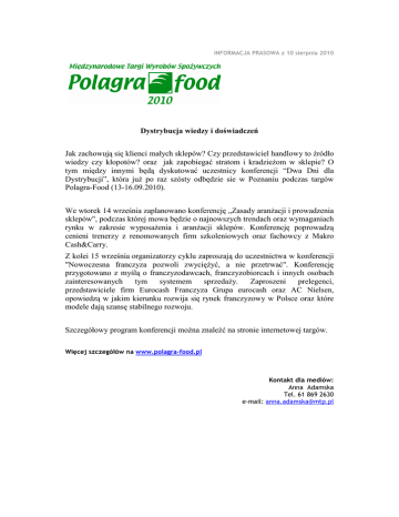 INFORMACJA PRASOWA z 10 sierpnia 2010 Dystrybucja wiedzy i doświadczeń Jak zachowują się klienci małych sklepów? Czy przedstawiciel handlowy to źródło wiedzy czy kłopotów? oraz jak zapobiegać stratom i kradzieŜom w sklepie? O tym między innymi będą dyskutować uczestnicy konferencji “Dwa Dni dla Dystrybucji”, która juŜ po raz szósty odbędzie sie w Poznaniu podczas targów Polagra-Food (13-16.09.2010). We wtorek 14 września zaplanowano konferencję „Zasady aranŜacji i prowadzenia sklepów", podczas której mowa będzie o najnowszych trendach oraz wymaganiach rynku w zakresie wyposaŜenia i aranŜacji sklepów. Konferencję poprowadzą cenieni trenerzy z renomowanych firm szkoleniowych oraz fachowcy z Makro Cash&Carry. Z kolei 15 września organizatorzy cyklu zaproszają do uczestnictwa w konferencji "Nowoczesna franczyza pozwoli zwycięŜyć, a nie przetrwać". Konferencję przygotowano z myślą o franczyzodawcach, franczyzobiorcach i innych osobach zainteresowanych tym systemem sprzedaŜy. Zaproszeni prelegenci, przedstawiciele firm Eurocash Franczyza Grupa eurocash oraz AC Nielsen, opowiedzą w jakim kierunku rozwija się rynek franczyzowy w Polsce oraz które modele dają szansę stabilnego rozwoju. Szczegółowy program konferencji moŜna znaleźć na stronie internetowej targów. Więcej szczegółów na www.polagra-food.pl Kontakt dla mediów: Anna Adamska Tel. 61 869 2630 e-mail: [email protected]