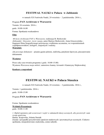 FESTIWAL NAUKI w Pałacu w Jabłonnie w ramach XX Festiwalu Nauki, 24 września - 2 października 2016 r., Program PAN Archiwum w Warszawie Termin: 24 września 2016 r. godz. 10.00-16.00 Forma: Spotkania weekendowe Film 60-lecie Archiwum PAN w Warszawie, realizacja B. Borkowski Aleksander Gieysztor- życie i pasja, autor Bartosz Borkowski, Anna Gruszczyńska fragment filmu biograficznego poświęcony wielkiemu uczonemu, we wspomnieniach współpracowników, kolegów, znajomych i rodziny. Warsztaty Jak powstaje dokument – pisanie gęsim piórem, stalówką, patykiem lipowym, pieczętowanie dokumentu Wystawa Przez cały czas trwania programu ( godz. 10.00-15.00) Wystawa Warszawa moja miłość, autorstwa Joanny Arwaniti i Katarzyny Słojkowskiej Konkurs z nagrodami FESTIWAL NAUKI w Pałacu Staszica w ramach XX Festiwalu Nauki, 24 września - 2 października 2016 r., Termin: 1 października 2016 r. godz. 10.00-15.00 Program PAN Archiwum w Warszawie Forma: Spotkania weekendowe Wykłady/Prezentacje godz. 10.00-11.00 1. Rąbek tajemnicy jak oczarować i wejść w zakamarki duszy uczonych, aby powierzyli nam swoją spuściznę. Hanna Krajewska, Jolanta Stasiak Zasady i przypadki pozyskiwania spuścizn naukowych i prywatnych po uczonych. Ciekawe spotkania, niespodziewane znaleziska, cenne nabytki. Film godz. 11.10-11.30 Aleksander Gieysztor- życie i pasja, autor Bartosz Borkowski, Anna Gruszczyńska fragment filmu biograficznego poświęcony wielkiemu uczonemu, we wspomnieniach współpracowników, kolegów, znajomych i rodziny. Wykłady/prezentacje godz. 11.40-12.10 2. Pałac Staszica w okresie międzywojennym. Katarzyna Słojkowska O odbudowie gmachu, zeszpeconego przez Moskali i przywróceniu mu pierwotnego wyglądu. Co znajdowało ie w Pałacu ? Jakie instytucje miały tu siedzibę. O dostojnych gościach i znaleziskach z dziedzińca. godz. 12.15-12.45 3. Historia bibliotek - od starożytności po XXI w. Hanna Krajewska Historia bibliotek – Biblioteka Aleksandryjska i Pergamenska, biblioteki Średniowiecza i Renesansu, Biblioteka braci Załuskich i najciekawsze biblioteki świata. godz.12.50-13.20 4. Polonus humoriscausa. Fryderyk Járosy (1889-1960) Anna Mieszkowska Fryderyk Járosy- aktor, reżyser, konferansjer i dyrektor kabaretów i teatrów rewiowych. Urodzony w Pradze, wychowany w rodzinie austriackiej, honorowy obywatel Polski, do której przybył w 1924 roku z Berlina z teatrzykiem rosyjskich emigrantów Niebieski Ptak. godz. 13.30- 14.00 5. Alkohol, ignorancja i nieporozumienia, czyli największe wpadki w wizytach dyplomatycznych. Bartosz Borkowski Prezentacja największych incydentów i skandali podczas spotkań dyplomatycznych, które miały miejsce w ciągu ostatniego stulecia. Od słynnych „ karteczek” Prezydenta Wojciechowskiego, przez toasty Prezydenta Obamy, aż po alkoholowe ekscesy Borysa Jelcyna w Irlandii. godz. 14.10-14.40 6. Warszawa moja miłość – historia powstania wystawy. Joanna Arvaniti Ekspozycja pokazuje najbardziej ulubione miejsca warszawiaków, symbole kojarzące się z Warszawą oraz osoby, które kochały Warszawę, pracowały dla niej, walczyły o nią, umierały dla niej lub pragnęły być w niej pochowane. Składa się z 15 plansz, ułożonych najczęściej nie chronologicznie, lecz tematycznie, prezentujących np. warszawskie uczelnie, towarzystwa naukowe, pomniki, kościoły, obiekty sportowe, parki i zieleńce, warszawskie atelier, słynące z urody warszawianki, a także zniszczenia powstańcze i stolicę już odbudowaną. Przewodnikiem po tablicach są wiersze Artura Oppmana, miłośnika Warszawy i jej legend. Wystawa Przez cały czas trwania programu ( godz. 10.00-15.00) wystawa Warszawa moja miłość. PAN Archiwum w Warszawie