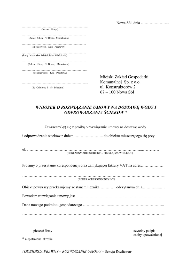 Nowa Sól, dnia ………………….. …………………………………………………………………… (Nazwa Firmy ) ………………………………………………………………….. (Adres: Ulica, Nr Domu, Mieszkania) ………………………………………………………………….. (Miejscowość, Kod Pocztowy) …………………………………………………………………. (Imię, Nazwisko Właściciela / Właściciela) ………………………………………………………………….. (Adres: Ulica, Nr Domu, Mieszkania) …………….…………………………………………………….. (Miejscowość, Kod Pocztowy) ………………………………,…………………………………... ( Id Odbiorcy i Nr Telefonu ) Miejski Zakład Gospodarki Komunalnej Sp. z o.o. ul. Konstruktorów 2 67 – 100 Nowa Sól WNIOSEK O ROZWIĄZANIE UMOWY NA DOSTAWĘ WODY I ODPROWADZANIA ŚCIEKÓW * Zawracam(-y) się z prośbą o rozwiązanie umowy na dostawę wody i odprowadzanie ścieków z dniem ………………….. do obiektu mieszczącego się przy ul. ………………………………………………………………………………...………… (DOKŁADNY ADRES OBIEKTU- PRZYŁĄCZA WOD-KAN.) Prosimy o przesyłanie korespondencji oraz zamykającej faktury VAT na adres……………… …………………………………………………………………………………………………... (ADRES KORESPONDENCYJNY) Obiekt powyŜszy przekazujemy ze stanem licznika…………..odczytanym dnia..………......… Powodem rozwiązania umowy jest …………………………………………………………….. Dane nowego podmiotu gospodarczego ……………… …...………………………………….. …………………………………………………………………………………………………... pieczęć firmy * niepotrzebne skreślić / ODBIORCA PRAWNY – ROZWIĄZANIE UMOWY – Sekcja Rozliczeń/ czytelny podpis osoby upowaŜnionej