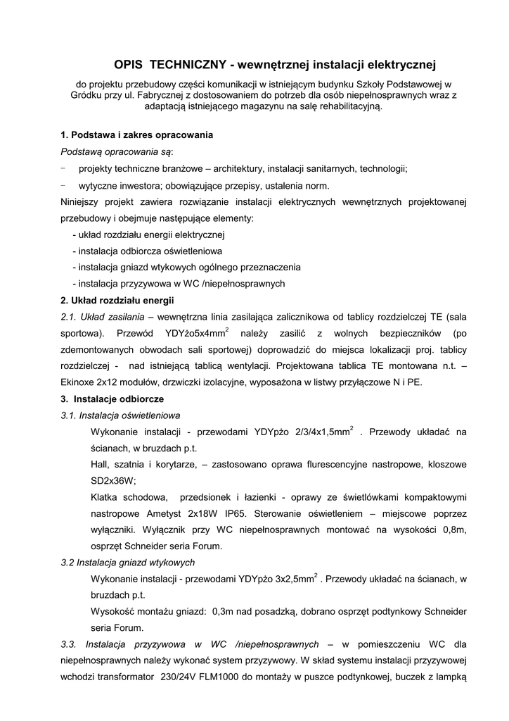 OPIS TECHNICZNY - wewnętrznej instalacji elektrycznej do projektu przebudowy części komunikacji w istniejącym budynku Szkoły Podstawowej w Gródku przy ul. Fabrycznej z dostosowaniem do potrzeb dla osób niepełnosprawnych wraz z adaptacją istniejącego magazynu na salę rehabilitacyjną. 1. Podstawa i zakres opracowania Podstawą opracowania są: - projekty techniczne branżowe – architektury, instalacji sanitarnych, technologii; - wytyczne inwestora; obowiązujące przepisy, ustalenia norm. Niniejszy projekt zawiera rozwiązanie instalacji elektrycznych wewnętrznych projektowanej przebudowy i obejmuje następujące elementy: - układ rozdziału energii elektrycznej - instalacja odbiorcza oświetleniowa - instalacja gniazd wtykowych ogólnego przeznaczenia - instalacja przyzywowa w WC /niepełnosprawnych 2. Układ rozdziału energii 2.1. Układ zasilania – wewnętrzna linia zasilająca zalicznikowa od tablicy rozdzielczej TE (sala sportowa). Przewód YDYżo5x4mm2 należy zasilić z wolnych bezpieczników (po zdemontowanych obwodach sali sportowej) doprowadzić do miejsca lokalizacji proj. tablicy rozdzielczej - nad istniejącą tablicą wentylacji. Projektowana tablica TE montowana n.t. – Ekinoxe 2x12 modułów, drzwiczki izolacyjne, wyposażona w listwy przyłączowe N i PE. 3. Instalacje odbiorcze 3.1. Instalacja oświetleniowa Wykonanie instalacji - przewodami YDYpżo 2/3/4x1,5mm2 . Przewody układać na ścianach, w bruzdach p.t. Hall, szatnia i korytarze, – zastosowano oprawa flurescencyjne nastropowe, kloszowe SD2x36W; Klatka schodowa, przedsionek i łazienki - oprawy ze świetlówkami kompaktowymi nastropowe Ametyst 2x18W IP65. Sterowanie oświetleniem – miejscowe poprzez wyłączniki. Wyłącznik przy WC niepełnosprawnych montować na wysokości 0,8m, osprzęt Schneider seria Forum. 3.2 Instalacja gniazd wtykowych Wykonanie instalacji - przewodami YDYpżo 3x2,5mm2 . Przewody układać na ścianach, w bruzdach p.t. Wysokość montażu gniazd: 0,3m nad posadzką, dobrano osprzęt podtynkowy Schneider seria Forum. 3.3. Instalacja przyzywowa w WC /niepełnosprawnych – w pomieszczeniu WC dla niepełnosprawnych należy wykonać system przyzywowy. W skład systemu instalacji przyzywowej wchodzi transformator 230/24V FLM1000 do montaży w puszce podtynkowej, buczek z lampką FIM1200 mocowany nad drzwiami wejściowymi do WC, kasownik FEH1001 montowany w pobliżu drzwi wewnątrz WC (wspólna ramka z transformatorem), przycisk pociągowy FAP3002 montowany w pobliżu sedesu i umywalki na wysokości ~1,8m z linką zakończoną na wysokości 0,6m. Kasowanie alarmu kasownikiem zamontowanym w pobliżu drzwi od strony wewnętrznej. Po wykonaniu instalacji zworki w przyciskach FAP ustawić w pozycji „B”, a w kasowniku usunąć. Instalację wykonać przewodem YTKSY4x0,5 układanym na ścianach w bruzdach. 4. Ochrona od porażeń Instalacje elektryczne wykonać w układzie TN-S z wydzielonym przewodem ochronnym. Jako system ochrony przed dotykiem bezpośrednim zastosowano izolację, przed dotykiem pośrednim przewidziano samoczynne wyłączenie zasilania, realizowane będzie przez zastosowanie wyłączników nadprądowych w obwodach gniazdowych i oświetleniowych oraz obniżone napięcie w obwodach sygnalizacji. Dodatkowo jako ochronę uzupełniającą zainstalować wyłączniki różnicowo-prądowe, prąd rozruchu 30mA. Przewód ochronny PE powinien być połączony do bolców ochronnych gniazd, wszelkich metalowych obudów, doprowadzony do wypustów oświetleniowych. Punkt rozdziału przewodu N i PE w tablicy istniejącej połączyć do istniejącego uziemienia. 5. Uwagi końcowe Obwód gniazdowy i oświetleniowy do sali rehabilitacji układać w listwie naściennej LN40x16.2 Całość robót wykonać zgodnie z obowiązującymi przepisami techniczno-budowlanymi i zasadami wiedzy technicznej oraz przepisami bhp. Opracował: Inż. Marek Łotko