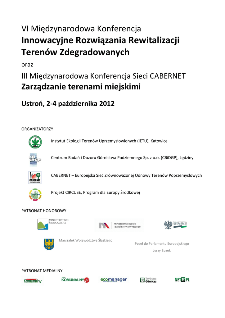 VI Międzynarodowa Konferencja Innowacyjne Rozwiązania Rewitalizacji Terenów Zdegradowanych oraz III Międzynarodowa Konferencja Sieci CABERNET Zarządzanie terenami miejskimi Ustroń, 2-4 października 2012 ORGANIZATORZY Instytut Ekologii Terenów Uprzemysłowionych (IETU), Katowice Centrum Badań i Dozoru Górnictwa Podziemnego Sp. z o.o. (CBiDGP), Lędziny CABERNET – Europejska Sieć Zrównoważonej Odnowy Terenów Poprzemysłowych Projekt CIRCUSE, Program dla Europy Środkowej PATRONAT HONOROWY Marszałek Województwa Śląskiego Poseł do Parlamentu Europejskiego Jerzy Buzek PATRONAT MEDIALNY Program konferencji 2 października 2012 – wtorek 11:00 – 12:30 Rejestracja uczestników 12:30 – 13:30 Obiad 13:30 – 14:05 Inauguracja konferencji: Jan SKOWRONEK – Instytut Ekologii Terenów Uprzemysłowionych, Katowice Krzysztof MIJALSKI – Centrum Badań i Dozoru Górnictwa Podziemnego Sp. z o.o., Lędziny Uwe FERBER – CABERNET Jerzy BUZEK – Parlament Europejski, Bruksela, Belgia Wystąpienie Gości: Bernard BŁASZCZYK – Regionalna Dyrekcja Ochrony Środowiska, Katowice Tadeusz KOSEK – Wojewódzki Fundusz Ochrony Środowiska i Gospodarki Wodnej w Katowicach Szymon TUMIELEWICZ – Ministerstwo Środowiska, Warszawa Jerzy SWATOŃ – Narodowy Fundusz Ochrony Środowiska i Gospodarki Wodnej 14:05 – 14:20 Wystąpienie Key Speakera – Thomas STRASSBURGER, Komisja Europejska, Bruksela, Belgia Wystąpienie Key Speakera – Marc KASZYNSKI, Etablissement Public Foncier Nord-Pas de Calais, Francja 14:20 – 14:35 Sesja Specjalna ZARZĄDZANIE CYKLICZNYM WYKORZYSTYWANIEM TERENÓW – Innowacyjne podejście zaprezentowane w projekcie CIRCUSE Prowadzący sesję: Uwe FERBER, Anna STARZEWSKA-SIKORSKA 14:35 – 14:55 CIRCUSE – Projekt nie cyrk – Anna STARZEWSKA-SIKORSKA, Instytut Ekologii Terenów Uprzemysłowionych, Katowice 14:55 – 15:15 Nowatorskie narzędzia zarządzania danymi w Projekcie CircUse – René OTPARLIK, Bernard SIEMER, Saksoński Urząd Regionalny do spraw Środowiska, Rolnictwa i Geologii, Niemcy 15:15 – 15:35 Zarządzanie cyklicznym wykorzystaniem terenów – Region Voitsberg – Gundula PROKOP, Barbara BIRLI, Environment Agency Austria, Wiedeń, Austria; Michaela GEIDL, Telepark Baernbach Corporation Ltd., Austria 15:35 – 15:55 Aspekty instytucjonalne – lokalni operatorzy działający na terenie Piekar Śląskich i Voitsberg (Austria) – Anton SCHABL, Schabl Consulting e.U., Austria 15:55 – 16:15 Od planów do zarządzania (nowe instrumenty?) – Maroš FINKA, Dagmar PETRIKOVÁ, Słowacki Uniwersytet Techniczny w Bratysławie, Słowacja 16:15 – 16:35 Wykorzystanie efektów Projektu CircUse: Strategia i kurs pilotażowy w zakresie podnoszenia świadomości – Thomas PREUSS, Niemiecki Instytut Urbanistyki, Niemcy 16:35 – 16:55 Przerwa na kawę 16:55 – 17:55 Dyskusja: Przyszłe perspektywy zarządzania terenami w Europie Środkowej Moderator: Uwe FERBER, Projektgruppe Stadt + Entwicklung, Niemcy 18:00 – 19:00 Warsztaty: Narzędzia do zarządzania danymi – René OTPARLIK, Bernd SIEMER, Saksoński Urząd Regionalny do spraw Środowiska, Rolnictwa i Geologii, Niemcy 20:00 Uroczysta kolacja Sesja Projektu CircUse jest finansowana przez Europejski Fundusz Rozwoju Regionalnego, Program dla Europy Środkowej. Udział w sesji jest bezpłatny. 3 października 2012 – środa 7:45 – 8:30 SESJA I Śniadanie ZINTEGROWANE ZARZĄDZANIE TERENAMI MIEJSKIMI Czas trwania wystąpienia obejmuje 13 minut wygłoszenia referatu i 2 minuty dyskusji. Prowadzący sesję: Krzysztof GASIDŁO, Paul SYMS 8:30 – 8:45 Wystąpienie Key Speakera – Rolf HEYER, NRW.Urban, Dusseldorf, Niemcy 8:45 – 9:00 Działania rewitalizacyjne w centrach miast a tożsamość miejsca – wybrane przykłady miast Europejskich – Anna BRZEZICKA, Politechnika Śląska, Gliwice 9:00 – 9:15 Ponowne zagospodarowanie zdegradowanych terenów miejskich w Estonii: podejście lokalnych władz – Jiri TINTERA, Aime RUUS, Uniwersytet Techniczny w Talinie (Tartu College), Estonia 9:15 – 9:30 Wpływ rewitalizacji terenów pogórniczych na małe miasta – przykład Ferropolis – Sylwia CYGAN, Akademia Górniczo-Hutnicza, Kraków 9:30 – 9:45 Master-plan jako zintegrowane narzędzie zarządzania wykorzystaniem terenów poprzemysłowych – Elżbieta PIETRZYK-SOKULSKA, Instytut Gospodarki Surowcami Mineralnymi i Energią PAN, Kraków 9:45 – 10:00 Zarządzanie zrównoważonym rozwojem dzielnic biznesowych – Włodzimierz A. SOKÓŁ, Główny Instytut Górnictwa, Katowice 10:00 – 10:15 Efektywna gospodarka wodna i jej rola w zintegrowanym zarządzaniu terenami miejskimi: studium przypadku z zastosowaniem narzędzia ”gemi local water tool” – Matthew ANDREWS, Uniwersytet w Delaware, USA 10:15 – 11:35 Przerwa na kawę 10:35 – 10:50 Potencjał w zakresie rozwoju i wykorzystania obszarów śródmiejskich niemieckich miast – badania znormalizowane – Georg SCHILLER, Holger OERTEL, Leibniz Institute of Ecological Urban and Regional Development, Niemcy 10:50 – 10:05 Wieloaspektowa rewitalizacja miejskiej doliny rzecznej na przykładzie katowickiej Ślepiotki – Leszek TRZĄSKI, Agnieszka GIEROSZKA, Małgorzata KOPERNIK, Główny Instytut Górnictwa, Katowice 11:05 – 11:20 Program rewitalizacji Lwowa-Podzamcza 2012-2025 – Wojciech JARCZEWSKI, Maciej HUCULAK, Instytut Rozwoju Miast, Kraków 11:20 – 11:35 Zintegrowane podejście do rewitalizacji miasta Wieliczka – Anna OSTRĘGA, Akademia Górniczo-Hutnicza, Kraków 11:35 – 11:50 Innowacje w zakresie programu nauczania planowania przestrzennego LADZIANSKA, Ľubomír JAMEČNÝ, STU w Bratysławie, Słowacja 11:50 – 12:05 Dyskusja 12:40 – 13:40 Obiad – Zuzana SESJA II EKONOMICZNE, SPOŁECZNE I ŚRODOWISKOWE CYKLICZNYM WYKORZYSTYWANIEM TERENÓW NARZĘDZIA ZARZĄDZANIA Czas trwania wystąpienia obejmuje 13 minut wygłoszenia referatu i 2 minuty dyskusji. Prowadzący sesję: Detlef GRIMSKI, Marc KASZYNSKI 13:45 – 14:00 Ro