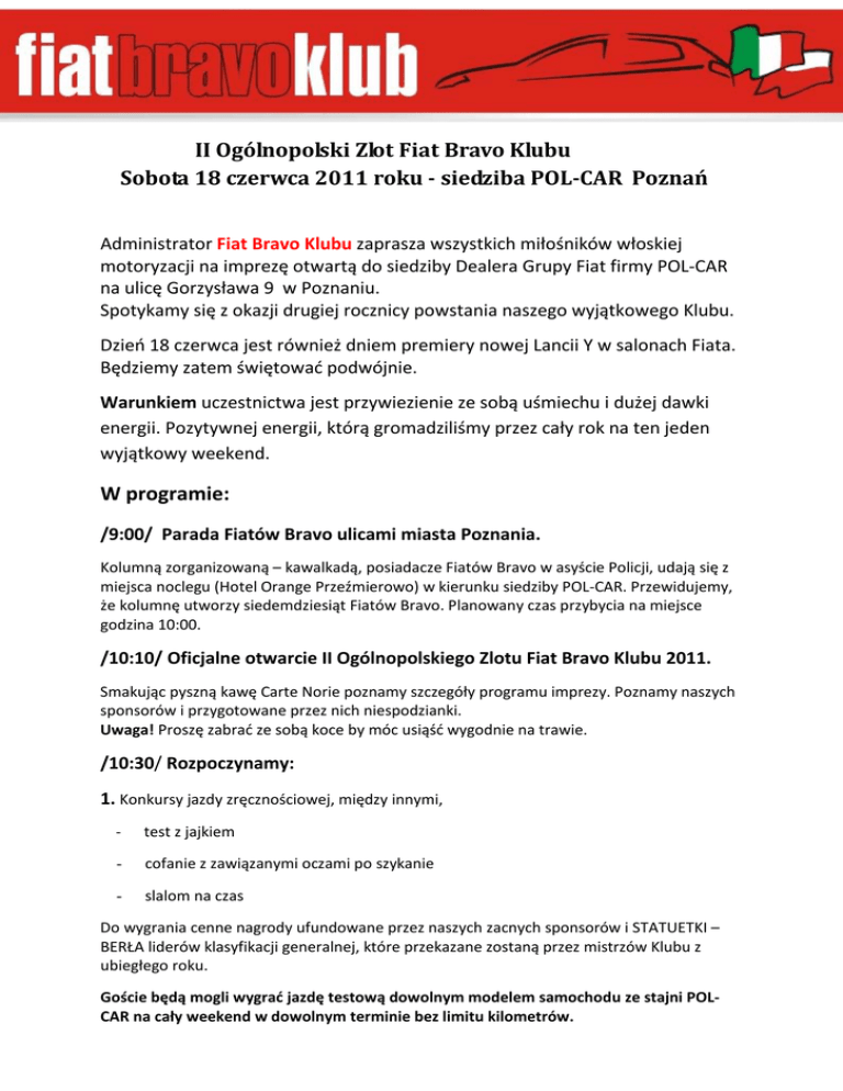 II Ogólnopolski Zlot Fiat Bravo Klubu Sobota 18 czerwca 2011 roku - siedziba POL-CAR Poznań Administrator Fiat Bravo Klubu zaprasza wszystkich miłośników włoskiej motoryzacji na imprezę otwartą do siedziby Dealera Grupy Fiat firmy POL-CAR na ulicę Gorzysława 9 w Poznaniu. Spotykamy się z okazji drugiej rocznicy powstania naszego wyjątkowego Klubu. Dzień 18 czerwca jest również dniem premiery nowej Lancii Y w salonach Fiata. Będziemy zatem świętować podwójnie. Warunkiem uczestnictwa jest przywiezienie ze sobą uśmiechu i dużej dawki energii. Pozytywnej energii, którą gromadziliśmy przez cały rok na ten jeden wyjątkowy weekend. W programie: /9:00/ Parada Fiatów Bravo ulicami miasta Poznania. Kolumną zorganizowaną – kawalkadą, posiadacze Fiatów Bravo w asyście Policji, udają się z miejsca noclegu (Hotel Orange Przeźmierowo) w kierunku siedziby POL-CAR. Przewidujemy, że kolumnę utworzy siedemdziesiąt Fiatów Bravo. Planowany czas przybycia na miejsce godzina 10:00. /10:10/ Oficjalne otwarcie II Ogólnopolskiego Zlotu Fiat Bravo Klubu 2011. Smakując pyszną kawę Carte Norie poznamy szczegóły programu imprezy. Poznamy naszych sponsorów i przygotowane przez nich niespodzianki. Uwaga! Proszę zabrać ze sobą koce by móc usiąść wygodnie na trawie. /10:30/ Rozpoczynamy: 1. Konkursy jazdy zręcznościowej, między innymi, - test z jajkiem - cofanie z zawiązanymi oczami po szykanie - slalom na czas Do wygrania cenne nagrody ufundowane przez naszych zacnych sponsorów i STATUETKI – BERŁA liderów klasyfikacji generalnej, które przekazane zostaną przez mistrzów Klubu z ubiegłego roku. Goście będą mogli wygrać jazdę testową dowolnym modelem samochodu ze stajni POLCAR na cały weekend w dowolnym terminie bez limitu kilometrów. 2. Wystawa Fiatów 500 z lat sześćdziesiątych z kolekcji Macieja Godula. Wspaniałe, odrestaurowane okazy, prezentowane na licznych wystawach i pokazach, uczestniczące również w rajdach oldtimerów. Cuda włoskiej motoryzacji pod opieką prawdziwego pasjonata. 3. POL-CAR Salon sprzedaży pojazdów nowych zaprezentuje współczesne modele Fiata 500. Topowe Fiaty Abarth, czy nowość na rynku w postaci pięknego Fiata 500 z dwucylindrowym silnikiem benzynowym Multi Air. Auta do jazdy testowej będą do dyspozycji uczestników. 4. Firma LAMBDA z Poznania, zaprezentuje produkty związane z oklejaniem samochodów. Zaprezentowane zostaną techniki oklejania aut foliami ozdobnymi i ochronnymi. Firma LAMBDA zafunduje nam pokaz wyklejania samochodu i każdy będzie mógł osobiście w tym uczestniczyć. Będzie można dotknąć tematu od kuchni, spróbować samemu zmierzyć się ze sobą w procesie oklejania. Przedstawiciele firmy LAMBDA będą służyć nam radą i pomocą. www.lambda.pl Siedziba firmy mieści się w Poznaniu przy ulicy Głogowskiej 419. Firma LAMBDA jest sponsorem koszulek dla Fiat Bravo Klub. Ogromne podziękowania dla reprezentanta firmy Wojciecha Antkowiaka za wspaniałą współpracę z Klubem i organizację przedsięwzięcia ze strony LAMBDA. 5. Polska Grupa Ratownictwa Medycznego i Szymon Kozłowski założyciel grupy. Instruktor i czynny Ratownik Medyczny pomoże nam spotkać się z Pierwszą Pomocą Medyczną. Wspaniały kolega i nauczyciel od ratowania życia gwarantuje, że po sobotnim spotkaniu będziemy odważniej pomagać potrzebującym tej pomocy. Przekaże nam nie tylko wiedzę, ale i siłę aby nie bać się pomagać. www.pgrm.pl Siedziba firmy mieści się w Pile (wielkopolska). Firma organizuje profesjonalne spotkania, szkolenia zarówno dla osób prywatnych, grup zorganizowanych jak i biznesu z pierwszej pomocy medycznej, certyfikowane dokumentem ukończenia kursu honorowanym przez instytucje państwowe. 6. POL-CAR Hurtownia Części Zamiennych zaprasza na zakupy. Hurtownia przygotuje specjalne ceny na zakupy w okresie zlotu na wszystkie części, podzespoły, materiały eksploatacyjne, gadżety grupy Fiat i wiele innych produktów znajdujących się w ofercie. Będzie doskonała okazja aby wydać mniej pieniędzy na nieuniknione zakupy. 7. POL-CAR Serwis. Dział serwisu naszego gospodarza pod dowództwem pana Macieja Garsteckiego Dyrektora ds. Usług POL-CAR zaprasza na: - darmową hamownię dla wszystkich, którzy chcą poznać moc swoich potworów - darmowe doradztwo, porady i oględziny pojazdu prowadzone przez najlepszych specjalistów od mechaniki i elektryki Fiata Bravo - darmową kontrolę systemu CAN prowadzoną przy pomocy specjalistycznego komputera serwisowego 8. Zabytkowy Londyński Autobus. Firma London-Bus Robert Szkudlarek udostępnia nam wspaniały piętrowy autobus w wersji Cabrio. www.london-bus.pl Ten Londyński autobus cieszący niegdyś ulice Londynu tym razem pomoże nam z innej perspektywy oglądać włoską motoryzację i piękny Poznań. Podczas imprezy piętro autobusu posłuży za taras widokowy i miejsce dowodzenia imprezą, parter zaś jako studio „Kobiecej Metamorfozy”. Podczas przejazdu ulicami Poznania w doborowym towarzystwie Fiatów Bravo będzie wiózł naszych gości. 9. „Kobiece Metamorfozy” – Studio Pauliny Lupa. Wszystkie Panie, które kochamy i uwielbiamy uczestniczące w imprezie zostaną zaproszone do udziału w warsztatach poświęconych kobiecości. „Kobiece Metamorfozy” to odkrycie głębi piękna. Podczas warsztatów zajmować się będą wami drogie panie styliści, wizarzyści, fryzjerzy, fotograficy. Parter Londyńskiego Autobusu przeistoczy się w studio przygotowane specjalnie dla was. Wierzę, że nie tylko Panie nauczą się czegoś o sobie. (panowie uśmiech...) 10. Dr Maryniak – tradycyjny staropolski posiłek. Swoją obecnością zaszczyci nas punkt gastronomiczny ze smacznym swojskim jedzeniem w dobrych cenach. Polska firma z tradycjami rodzinnymi „Wiejski stół - Dr Maryniak” przygotowuje od pokoleń naturalne potrawy bez konserwantów. Uwaga! Również osoby z dolegliwościami alergicznymi będą mogł