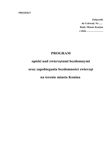 PROJEKT Załącznik do Uchwały Nr….. Rady Miasta Konina z dnia ………………. PROGRAM opieki nad zwierzętami bezdomnymi oraz zapobiegania bezdomności zwierząt na terenie miasta Konina Załącznik do Uchwały Nr …… Rady Miasta Konina z dnia …………….. PROGRAM OPIEKI NAD ZWIRZĘTAMI BEZDOMNYMI ORAZ ZAPOBIEGANIA BEZDOMNOŚCI ZWIERZĄT NA TERENIE m. KONINA w 2016 roku WPROWADZENIE „Zwierzę, jako istota żyjąca, zdolna do odczuwania cierpienia, nie jest rzeczą. Człowiek jest mu winien poszanowanie, ochronę i opiekę." (art. 1 ustawy z dnia 21 sierpnia 1997 r. o ochronie zwierząt). Podstawą prawną podjęcia przez Radę Miasta Konina uchwały w sprawie „Programu opieki nad zwierzętami bezdomnymi oraz zapobiegania bezdomności zwierząt na terenie m Konina”, zwanego dalej Programem jest art. 11a ustawy z dnia 21 sierpnia 1997 r. o ochronie zwierząt. Program ma zastosowanie do wszystkich zwierząt domowych, w szczególności psów i kotów, w tym kotów wolno żyjących oraz zwierząt gospodarskich. Większość działań określonych w Programie dotyczy psów i kotów, ponieważ skala bezdomności tych zwierząt jest największą w całym kraju, jak również na terenie m. Konina. W Schronisku dla Bezdomnych Zwierząt przy ul. Gajowej w Koninie, przebywa na co dzień ok. 130-180 psów i 40-80 kotów. Ponadto organizacje pozarządowe, działające na terenie Konina, sprawują opiekę głównie nad tymi zwierzętami. Bezdomność zwierząt jest zjawiskiem społecznym, którego głównymi przyczynami są: 1) niekontrolowane rozmnażanie, 2) porzucanie zwierząt przez właścicieli, 3) ucieczki zwierząt, 4) łatwość pozyskiwania zwierząt, 5) panujące mody na dane rasy zwierząt, 6) brak edukacji i wiedzy społeczeństwa w zakresie metod zapobiegania bezdomności, ze szczególnym uwzględnieniem sterylizacji i kastracji. Według raportu Najwyższej Izby Kontroli w sprawie przestrzegania praw zwierząt z dnia 23 sierpnia 2011 r., zjawisko bezdomności zwierząt utrzymuje się na wysokim poziomie i ma tendencję wzrostową. Elektroniczne znakowanie (czipowanie) zwierząt to jedna z głównych metod zapobiegania bezdomności zwierząt, dlatego też: od 1 stycznia 2016 roku zgodnie z Uchwałą Nr 202 Rada Miasta Konina z dnia 28 października 2015 r. wprowadzono opłatę od posiadania psa w wysokości 60,00 zł. od każdego psa nieposiadającego czipa. Zwalnia się właściciela psa z opłaty jednorazowej w danym roku, w którym przeprowadzono czipowanie psa. Sterylizacja i kastracja (pozbawienie możliwości rozmnażania) zwierząt bezdomnych oraz domowych to norma we wszystkich cywilizowanych krajach oraz najskuteczniejsza metoda unikania niekontrolowanej rozrodczości zwierząt. Program zakłada zachęcanie właścicieli zwierząt do ich sterylizacji i kastracji, poprzez prowadzenie działań edukacyjnoinformacyjnych oraz akcji dofinansowywania tych zabiegów. 2 Koty wolno żyjące, bytujące głównie w piwnicach budynków mieszkalnych, są elementem ekosystemu miejskiego, a ich obecność zapobiega rozprzestrzenianiu się gryzoni (myszy i szczurów). Koty te nie są zwierzętami bezdomnymi, dlatego nie należy ich wyłapywać ani wywozić, lecz stwarzać warunki bytowania w miejscach ich dotychczasowego schronienia. W celu kontroli populacji kotów wolno żyjących, w tym jej zdrowotności, Urząd Miejski w Koninie zapewni dofinansowanie kosztów sterylizacji i kastracji oraz leczenie tych zwierząt. Realizacja wszystkich zadań, określonych w rozdziale 2 Programu, zmierza do ograniczenia liczby bezdomnych zwierząt trafiających pod opiekę Schroniska dla Bezdomnych Zwierząt przy ul. Gajowej 7a i organizacji pozarządowych, działających na terenie Konina. I. POSTANOWIENIA OGÓLNE: 1. Ilekroć w programie jest mowa o: Mieście, należy przez to rozumieć Miasto Konin; Schronisku, należy przez to rozumieć Schronisko Dla Bezdomnych Zwierząt w Koninie ul. Gajowa 7a; zwierzętach bezdomnych, należy przez to rozumieć zwierzęta domowe lub gospodarskie, które uciekły, zabłąkały się lub zostały porzucone przez człowieka, a nie ma możliwości ustalenia ich właściciela lub innej osoby, pod której opieką trwale dotąd pozostawały; zwierzętach domowych, należy przez to rozumieć zwierzęta tradycyjnie przebywające wraz z człowiekiem w jego domu lub odpowiednim pomieszczeniu, utrzymane przez człowieka w charakterze jego towarzysza; kotach wolno żyjących, należy przez to rozumieć koty urodzone lub żyjące na wolności (żyjące w otoczeniu człowieka w stanie dzikim); Programie, należy przez to rozumieć Program opieki nad zwierzętami bezdomnymi oraz zapobiegania bezdomności zwierząt na terenie m. Konina w 2016 roku. 2. Koordynatorem Programu jest Prezydent m Konina, za pośrednictwem Wydziału Gospodarki Komunalnej Urzędu Miejskiego w Koninie. 3. Realizatorami Programu są: Wydział Gospodarki Komunalnej w Urzędzie Miejskim w Koninie; Straż Miejska m. Konin; Towarzystwo Opieki Nad Zwierzętami; Organizacje pozarządowe, których celem statutowym jest ochrona zwierząt. II. CEL I ZADANIA PROGRAMU: 1. Celem Programu jest zapobieganie bezdomności zwierząt na terenie Konina oraz opieka nad zwierzętami bezdomnymi. 2. Zadania priorytetowe Programu to: obligatoryjna sterylizacja albo kastracja zwierząt w schroniskach dla zwierząt; 3 zapewnienie bezdomnym zwierzętom miejsca w schronisku dla zwierząt; sprawowanie opieki nad kotami wolno żyjącymi, w tym ich dokarmianie; poszukiwanie nowych właścicieli dla bezdomnych zwierząt; odławianie bezdomnych zwierząt; zapewnienie całodobowej opieki weterynaryjnej w przypadkach zdarzeń drogowych z udziałem zwierząt; usypianie ślepych miotów; wskazanie gospodarstwa rolnego w celu zapewnienia miejsca dla zwierząt gospodarskich; edukacja mieszkańców Konina w zakresie opieki nad zwierzętami. III. SPOSÓB REALIZACJI ZADAŃ: 1. Obligatoryjną sterylizację albo kastrację zwierząt w