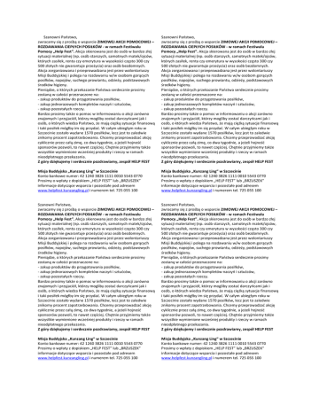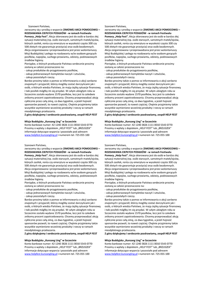 Szanowni Państwo, zwracamy się z prośbą o wsparcie ZIMOWEJ AKCJI POMOCOWEJ – ROZDAWANIA CIEPŁYCH POSIŁKÓW - w ramach Festiwalu Pomocy „Help Fest”. Akcja skierowana jest do osób w bardzo złej sytuacji materialnej (np. osób starszych, samotnych matek/ojców, których zasiłek, renta czy emerytura w wysokości często 300 czy 500 złotych nie gwarantuje przeżycia) oraz osób bezdomnych. Akcja zorganizowana i przeprowadzana jest przez wolontariuszy Misji Buddyjskiej i polega na rozdawaniu w/w osobom gorących posiłków, napojów, suchego prowiantu, odzieży, podstawowych środków higieny. Pieniądze, o których przekazanie Państwa serdecznie prosimy zostaną w całości przeznaczone na: - zakup produktów do przygotowania posiłków, - zakup jednorazowych kompletów naczyń i sztućców, - zakup pozostałych rzeczy. Bardzo prosimy także o pomoc w informowaniu o akcji zarówno znajomych i przyjaciół, którzy mogliby zostać darczyńcami jak i osób, o których wiedza Państwo, że mają ciężką sytuacje finansową i taki posiłek mógłby im się przydać. W całym ubiegłym roku w Szczecinie zostało wydane 1570 posiłków, lecz jest to zaledwie znikomy procent zapotrzebowania. Chcemy przeprowadzać akcję cyklicznie przez całą zimę, co dwa tygodnie, a jeżeli hojność sponsorów pozwoli, to nawet częściej. Chętnie przyjmiemy także wszystkie wymienione wcześniej produkty i rzeczy w ramach nieodpłatnego przekazania. Z góry dziękujemy i serdecznie pozdrawiamy, zespół HELP FEST Szanowni Państwo, zwracamy się z prośbą o wsparcie ZIMOWEJ AKCJI POMOCOWEJ – ROZDAWANIA CIEPŁYCH POSIŁKÓW - w ramach Festiwalu Pomocy „Help Fest”. Akcja skierowana jest do osób w bardzo złej sytuacji materialnej (np. osób starszych, samotnych matek/ojców, których zasiłek, renta czy emerytura w wysokości często 300 czy 500 złotych nie gwarantuje przeżycia) oraz osób bezdomnych. Akcja zorganizowana i przeprowadzana jest przez wolontariuszy Misji Buddyjskiej i polega na rozdawaniu w/w osobom gorących posiłków, napojów, suchego prowiantu, odzieży, podstawowych środków higieny. Pieniądze, o których przekazanie Państwa serdecznie prosimy zostaną w całości przeznaczone na: - zakup produktów do przygotowania posiłków, - zakup jednorazowych kompletów naczyń i sztućców, - zakup pozostałych rzeczy. Bardzo prosimy także o pomoc w informowaniu o akcji zarówno znajomych i przyjaciół, którzy mogliby zostać darczyńcami jak i osób, o których wiedza Państwo, że mają ciężką sytuacje finansową i taki posiłek mógłby im się przydać. W całym ubiegłym roku w Szczecinie zostało wydane 1570 posiłków, lecz jest to zaledwie znikomy procent zapotrzebowania. Chcemy przeprowadzać akcję cyklicznie przez całą zimę, co dwa tygodnie, a jeżeli hojność sponsorów pozwoli, to nawet częściej. Chętnie przyjmiemy także wszystkie wymienione wcześniej produkty i rzeczy w ramach nieodpłatnego przekazania. Z góry dziękujemy i serdecznie pozdrawiamy, zespół HELP FEST Misja Buddyjska „Kunzang Ling” w Szczecinie Konto bankowe numer: 42 1240 3826 1111 0010 5543 0770 Prosimy o wpłaty z dopiskiem „HELP FEST” lub „BRZUSZEK” informacje dotyczące wsparcia i pozostałe pod adresem www.helpfest.kunzangling.pl i numerem tel. 725 055 100 Misja Buddyjska „Kunzang Ling” w Szczecinie Konto bankowe numer: 42 1240 3826 1111 0010 5543 0770 Prosimy o wpłaty z dopiskiem „HELP FEST” lub „BRZUSZEK” informacje dotyczące wsparcia i pozostałe pod adresem www.helpfest.kunzangling.pl i numerem tel. 725 055 100 Szanowni Państwo, zwracamy się z prośbą o wsparcie ZIMOWEJ AKCJI POMOCOWEJ – ROZDAWANIA CIEPŁYCH POSIŁKÓW - w ramach Festiwalu Pomocy „Help Fest”. Akcja skierowana jest do osób w bardzo złej sytuacji materialnej (np. osób starszych, samotnych matek/ojców, których zasiłek, renta czy emerytura w wysokości często 300 czy 500 złotych nie gwarantuje przeżycia) oraz osób bezdomnych. Akcja zorganizowana i przeprowadzana jest przez wolontariuszy Misji Buddyjskiej i polega na rozdawaniu w/w osobom gorących posiłków, napojów, suchego prowiantu, odzieży, podstawowych środków higieny. Pieniądze, o których przekazanie Państwa serdecznie prosimy zostaną w całości przeznaczone na: - zakup produktów do przygotowania posiłków, - zakup jednorazowych kompletów naczyń i sztućców, - zakup pozostałych rzeczy. Bardzo prosimy także o pomoc w informowaniu o akcji zarówno znajomych i przyjaciół, którzy mogliby zostać darczyńcami jak i osób, o których wiedza Państwo, że mają ciężką sytuacje finansową i taki posiłek mógłby im się przydać. W całym ubiegłym roku w Szczecinie zostało wydane 1570 posiłków, lecz jest to zaledwie znikomy procent zapotrzebowania. Chcemy przeprowadzać akcję cyklicznie przez całą zimę, co dwa tygodnie, a jeżeli hojność sponsorów pozwoli, to nawet częściej. Chętnie przyjmiemy także wszystkie wymienione wcześniej produkty i rzeczy w ramach nieodpłatnego przekazania. Z góry dziękujemy i serdecznie pozdrawiamy, zespół HELP FEST Szanowni Państwo, zwracamy się z prośbą o wsparcie ZIMOWEJ AKCJI POMOCOWEJ – ROZDAWANIA CIEPŁYCH POSIŁKÓW - w ramach Festiwalu Pomocy „Help Fest”. Akcja skierowana jest do osób w bardzo złej sytuacji materialnej (np. osób starszych, samotnych matek/ojców, których zasiłek, renta czy emerytura w wysokości często 300 czy 500 złotych nie gwarantuje przeżycia) oraz osób bezdomnych. Akcja zorganizowana i przeprowadzana jest przez wolontariuszy Misji Buddyjskiej i polega na rozdawaniu w/w osobom gorących posiłków, napojów, suchego prowiantu, odzieży, podstawowych środków higieny. Pieniądze, o których przekazanie Państwa serdecznie prosimy zostaną w całości przeznaczone na: - zakup produktów do przygotowania posiłków, - zakup jednorazowych kompletów naczyń i sztućców, - zakup pozostałych rze