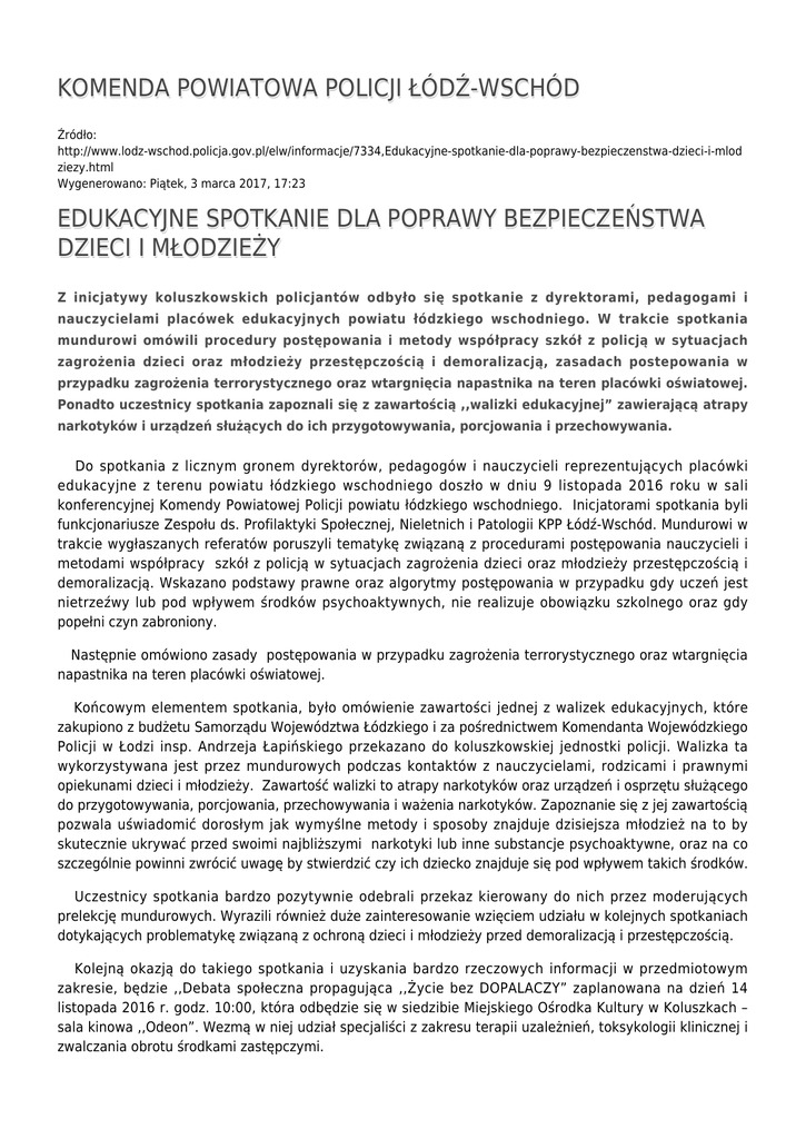 KOMENDA POWIATOWA POLICJI ŁÓDŹ-WSCHÓD Źródło: http://www.lodz-wschod.policja.gov.pl/elw/informacje/7334,Edukacyjne-spotkanie-dla-poprawy-bezpieczenstwa-dzieci-i-mlod ziezy.html Wygenerowano: Piątek, 3 marca 2017, 17:23 EDUKACYJNE SPOTKANIE DLA POPRAWY BEZPIECZEŃSTWA DZIECI I MŁODZIEŻY Z inicjatywy koluszkowskich policjantów odbyło się spotkanie z dyrektorami, pedagogami i nauczycielami placówek edukacyjnych powiatu łódzkiego wschodniego. W trakcie spotkania mundurowi omówili procedury postępowania i metody współpracy szkół z policją w sytuacjach zagrożenia dzieci oraz młodzieży przestępczością i demoralizacją, zasadach postepowania w przypadku zagrożenia terrorystycznego oraz wtargnięcia napastnika na teren placówki oświatowej. Ponadto uczestnicy spotkania zapoznali się z zawartością ,,walizki edukacyjnej” zawierającą atrapy narkotyków i urządzeń służących do ich przygotowywania, porcjowania i przechowywania. Do spotkania z licznym gronem dyrektorów, pedagogów i nauczycieli reprezentujących placówki edukacyjne z terenu powiatu łódzkiego wschodniego doszło w dniu 9 listopada 2016 roku w sali konferencyjnej Komendy Powiatowej Policji powiatu łódzkiego wschodniego. Inicjatorami spotkania byli funkcjonariusze Zespołu ds. Profilaktyki Społecznej, Nieletnich i Patologii KPP Łódź-Wschód. Mundurowi w trakcie wygłaszanych referatów poruszyli tematykę związaną z procedurami postępowania nauczycieli i metodami współpracy szkół z policją w sytuacjach zagrożenia dzieci oraz młodzieży przestępczością i demoralizacją. Wskazano podstawy prawne oraz algorytmy postępowania w przypadku gdy uczeń jest nietrzeźwy lub pod wpływem środków psychoaktywnych, nie realizuje obowiązku szkolnego oraz gdy popełni czyn zabroniony. Następnie omówiono zasady postępowania w przypadku zagrożenia terrorystycznego oraz wtargnięcia napastnika na teren placówki oświatowej. Końcowym elementem spotkania, było omówienie zawartości jednej z walizek edukacyjnych, które zakupiono z budżetu Samorządu Województwa Łódzkiego i za pośrednictwem Komendanta Wojewódzkiego Policji w Łodzi insp. Andrzeja Łapińskiego przekazano do koluszkowskiej jednostki policji. Walizka ta wykorzystywana jest przez mundurowych podczas kontaktów z nauczycielami, rodzicami i prawnymi opiekunami dzieci i młodzieży. Zawartość walizki to atrapy narkotyków oraz urządzeń i osprzętu służącego do przygotowywania, porcjowania, przechowywania i ważenia narkotyków. Zapoznanie się z jej zawartością pozwala uświadomić dorosłym jak wymyślne metody i sposoby znajduje dzisiejsza młodzież na to by skutecznie ukrywać przed swoimi najbliższymi narkotyki lub inne substancje psychoaktywne, oraz na co szczególnie powinni zwrócić uwagę by stwierdzić czy ich dziecko znajduje się pod wpływem takich środków. Uczestnicy spotkania bardzo pozytywnie odebrali przekaz kierowany do nich przez moderujących prelekcję mundurowych. Wyrazili również duże zainteresowanie wzięciem udziału w kolejnych spotkaniach dotykających problematykę związaną z ochroną dzieci i młodzieży przed demoralizacją i przestępczością. Kolejną okazją do takiego spotkania i uzyskania bardzo rzeczowych informacji w przedmiotowym zakresie, będzie ,,Debata społeczna propagująca ,,Życie bez DOPALACZY” zaplanowana na dzień 14 listopada 2016 r. godz. 10:00, która odbędzie się w siedzibie Miejskiego Ośrodka Kultury w Koluszkach – sala kinowa ,,Odeon”. Wezmą w niej udział specjaliści z zakresu terapii uzależnień, toksykologii klinicznej i zwalczania obrotu środkami zastępczymi. Spotkanie dyrektorów, pedagogów i nauczycieli z koluszkowskimi policjantami Spotkanie dyrektorów, pedagogów i nauczycieli z koluszkowskimi policjantami Spotkanie dyrektorów, pedagogów i nauczycieli z koluszkowskimi policjantami Spotkanie dyrektorów, pedagogów i nauczycieli z koluszkowskimi policjantami Spotkanie dyrektorów, pedagogów i nauczycieli z koluszkowskimi policjantami Spotkanie dyrektorów, pedagogów i nauczycieli z koluszkowskimi policjantami Spotkanie dyrektorów, pedagogów i nauczycieli z koluszkowskimi policjantami Spotkanie dyrektorów, pedagogów i nauczycieli z koluszkowskimi policjantami Spotkanie dyrektorów, pedagogów i nauczycieli z koluszkowskimi policjantami Ocena: 0/5 (0) Tweetnij spotkanie, edukacja, bezpieczeństwo, dzieci i młodzież, koluszkowscy policjanci