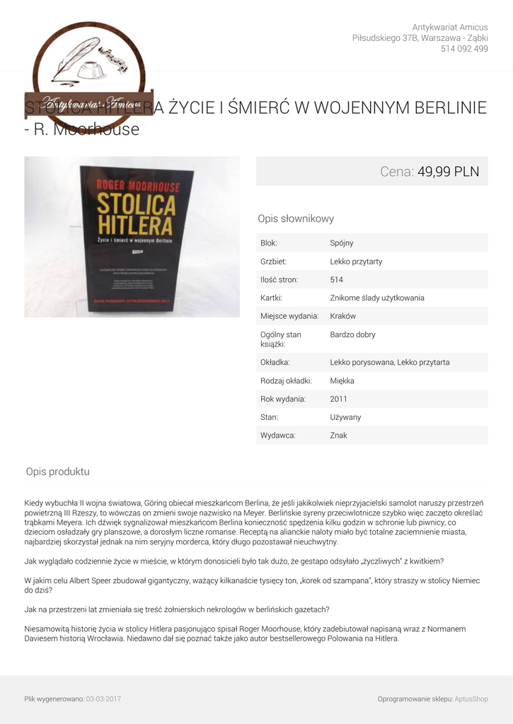 Antykwariat Amicus Piłsudskiego 37B, Warszawa - Ząbki 514 092 499 STOLICA HITLERA ŻYCIE I ŚMIERĆ W WOJENNYM BERLINIE - R. Moorhouse Cena: 49,99 PLN Opis słownikowy Blok: Spójny Grzbiet: Lekko przytarty Ilość stron: 514 Kartki: Znikome ślady użytkowania Miejsce wydania: Kraków Ogólny stan książki: Bardzo dobry Okładka: Lekko porysowana, Lekko przytarta Rodzaj okładki: Miękka Rok wydania: 2011 Stan: Używany Wydawca: Znak Opis produktu Kiedy wybuchła II wojna światowa, Göring obiecał mieszkańcom Berlina, że jeśli jakikolwiek nieprzyjacielski samolot naruszy przestrzeń powietrzną III Rzeszy, to wówczas on zmieni swoje nazwisko na Meyer. Berlińskie syreny przeciwlotnicze szybko więc zaczęto określać trąbkami Meyera. Ich dźwięk sygnalizował mieszkańcom Berlina konieczność spędzenia kilku godzin w schronie lub piwnicy, co dzieciom osładzały gry planszowe, a dorosłym liczne romanse. Receptą na alianckie naloty miało być totalne zaciemnienie miasta, najbardziej skorzystał jednak na nim seryjny morderca, który długo pozostawał nieuchwytny. Jak wyglądało codziennie życie w mieście, w którym donosicieli było tak dużo, że gestapo odsyłało „życzliwych” z kwitkiem? W jakim celu Albert Speer zbudował gigantyczny, ważący kilkanaście tysięcy ton, „korek od szampana”, który straszy w stolicy Niemiec do dziś? Jak na przestrzeni lat zmieniała się treść żołnierskich nekrologów w berlińskich gazetach? Niesamowitą historię życia w stolicy Hitlera pasjonująco spisał Roger Moorhouse, który zadebiutował napisaną wraz z Normanem Daviesem historią Wrocławia. Niedawno dał się poznać także jako autor bestsellerowego Polowania na Hitlera. Plik wygenerowano: 03-03-2017 Oprogramowanie sklepu: AptusShop Antykwariat Amicus Piłsudskiego 37B, Warszawa - Ząbki 514 092 499 Galeria Plik wygenerowano: 03-03-2017 Powered by TCPDF (www.tcpdf.org) Oprogramowanie sklepu: AptusShop