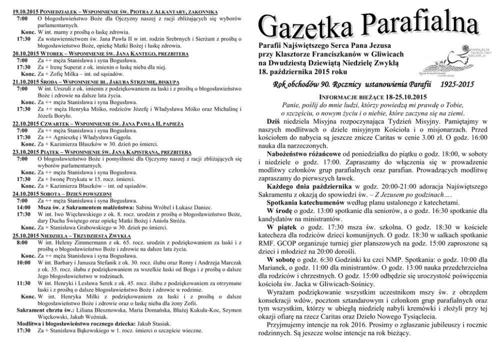 19.10.2015 PONIEDZIAŁEK – WSPOMNIENIE ŚW. PIOTRA Z ALKANTARY, ZAKONNIKA 7:00 O błogosławieństwo Boże dla Ojczyzny naszej z racji zbliżających się wyborów parlamentarnych. Konc. W int. mamy z prośbą o łaskę zdrowia. 17:30 Za wstawiennictwem św. Jana Pawła II w int. rodzin Srebrnych i Sierżant z prośbą o błogosławieństwo Boże, opiekę Matki Bożej i łaskę zdrowia. 20.10.2015 WTOREK – WSPOMNIENIE ŚW. JANA KANTEGO, PREZBITERA 7:00 Za ++ męża Stanisława i syna Bogusława. 17:30 Za + Irenę Superat z ok. imienin o łaskę nieba dla niej. Konc. Za + Zofię Milka – int. od sąsiadów. 21.10.2015 ŚRODA – WSPOMNIENIE BŁ. JAKUBA STRZEMIĘ, BISKUPA 7:00 W int. Urszuli z ok. imienin z podziękowaniem za łaski i z prośbą o błogosławieństwo Boże i zdrowie na dalsze lata życia. Konc. Za ++ męża Stanisława i syna Bogusława. 17:30 Za ++ męża Henryka Miśko, rodziców Józefę i Władysława Miśko oraz Michalinę i Józefa Boryło. 22.10.2015 CZWARTEK – WSPOMNIENIE ŚW. JANA PAWŁA II, PAPIEŻA 7:00 Za ++ męża Stanisława i syna Bogusława. 17:30 Za ++ Agnieszkę i Władysława Gągola. Konc. Za + Kazimierza Błaszków w 30. dzień po śmierci. 23.10.2015 PIĄTEK – WSPOMNIENIE ŚW. JANA KAPISTRANA, PREZBITERA 7:00 O błogosławieństwo Boże i pomyślność dla Ojczyzny naszej z racji zbliżających się wyborów parlamentarnych. Konc. Za ++ męża Stanisława i syna Bogusława. 17:30 Za + Iwonę Przykuta w 15. rocz. śmierci. Konc. Za + Kazimierza Błaszków – int. od sąsiadów. 24.10.2015 SOBOTA – DZIEŃ POWSZEDNI 7:00 Za ++ męża Stanisława i syna Bogusława. 14:00 Msza św. z Sakramentem małżeństwa: Sabina Wróbel i Łukasz Daniec. 17:30 W int. Iwo Więcławskiego z ok. 8. rocz. urodzin z prośbą o błogosławieństwo Boże, dary Ducha Świętego oraz opiekę Matki Bożej i Anioła Stróża. Konc. Za + Stanisława Grabowskiego w 30. dzień po śmierci. 25.10.2015 NIEDZIELA – TRZYDZIESTA ZWYKŁA 8:00 W int. Heleny Zimmermann z ok. 65. rocz. urodzin z podziękowaniem za łaski i z prośbą o błogosławieństwo Boże i zdrowie na dalsze lata życia. Konc. Za ++ męża Stanisława i syna Bogusława. 10:00 W int. Barbary i Janusza Stefanik z ok. 30. rocz. ślubu oraz Romy i Andrzeja Marczak z ok. 35. rocz. ślubu z podziękowaniem za wszelkie łaski od Boga i z prośbą o dalsze Jego błogosławieństwo w rodzinach. 11:30 W int. Henryki i Lesława Serek z ok. 45. rocz. ślubu z podziękowaniem za otrzymane łaski i z prośbą o dalsze błogosławieństwo Boże i zdrowie w rodzinie. Konc. W int. Henryka Milki z podziękowaniem za łaski i z prośbą o dalsze błogosławieństwo Boże i zdrowie oraz o łaskę nieba dla żony Zofii. Sakrament chrztu św.: Liliana Błesznowska, Maria Domańska, Błażej Kukuła-Koc, Szymon Więckowski, Jakub Woźniak. Modlitwa i błogosławieństwo rocznego dziecka: Jakub Stasiak. 17:30 Za + Stanisława Bąkowskiego w 1. rocz. śmierci o szczęście wieczne. Parafii Najświętszego Serca Pana Jezusa przy Klasztorze Franciszkanów w Gliwicach na Dwudziestą Dziewiątą Niedzielę Zwykłą 18. października 2015 roku Rok obchodów 90. Rocznicy ustanowienia Parafii 1925-2015 INFORMACJE BIEŻĄCE 18-25.10.2015 Panie, poślij do mnie ludzi, którzy powiedzą mi prawdę o Tobie, o szczęściu, o nowym życiu i o niebie, które zaczyna się na ziemi. Dziś niedziela Misyjna rozpoczynająca Tydzień Misyjny. Pamiętajmy w naszych modlitwach o dziele misyjnym Kościoła i o misjonarzach. Przed kościołem do nabycia są jeszcze znicze Caritas w cenie 3.00 zł. O godz. 16:00 nauka dla narzeczonych. Nabożeństwo różańcowe od poniedziałku do piątku o godz. 18:00, w soboty i niedziele o godz. 17:00. Zapraszamy do włączenia się w prowadzenie modlitwy członków grup parafialnych oraz parafian. Prowadzących modlitwę zapraszamy do pierwszych ławek. Każdego dnia października w godz. 20:00-21:00 adoracja Najświętszego Sakramentu z okazją do spowiedzi św. – Z Jezusem po godzinach…. Spotkania katechumenów według planu ustalonego z katechetami. W środę o godz. 13:00 spotkanie dla seniorów, a o godz. 16:30 spotkanie dla kandydatów na ministrantów. W piątek o godz. 17:30 msza św. szkolna. O godz. 18:30 w kościele katecheza dla rodziców dzieci komunijnych. O godz. 18:30 w salkach spotkanie RMF. GCOP organizuje turniej gier planszowych na godz. 15:00 zaproszone są dzieci i młodzież na 20:00 dorośli. W sobotę o godz. 6:30 Godzinki ku czci NMP. Spotkania: o godz. 10:00 dla Marianek, o godz. 11:00 dla ministrantów. O godz. 13:00 nauka przedchrzcielna dla rodziców i chrzestnych. O godz. 15:00 odbędzie się uroczystość poświęcenia kościoła św. Jacka w Gliwicach-Sośnicy. Wyrażam podziękowanie wszystkim uczestnikom mszy św. z obrzędem konsekracji wdów, pocztom sztandarowym i członkom grup parafialnych oraz tym wszystkim, którzy w ubiegłą niedzielę nabyli kremówki i złożyli przy tej okazji ofiarę na rzecz Caritas oraz Dzieło Nowego Tysiąclecia. Przyjmujemy intencje na rok 2016. Prosimy o zgłaszanie jubileuszy i rocznic rodzinnych. Są jeszcze wolne intencje na rok bieżący. Wypominki składać można w zakrystii lub kancelarii. Karty wyłożone są na stoliku pod chórem. Polecamy nowy numer Gościa Niedzielnego i Gazetki Parafialnej. Parafianom i Gościom dziękujemy za modlitwy, ofiary i kwiaty. Niech dzieło misyjne Kościoła zachęca i nas do głoszenia i życia Ewangelią każdego dnia. życie modlitewne i jedność z Panem i Jego odkupieńczą ofiarą. Powierzam Maryi, Matce Kościoła i wzorowi misyjnego zaangażowania, tych wszystkich, którzy współpracują w głoszeniu Ewangelii ad gentes lub na ich własnych terytoriach. Wszystkim głosicielom Ewangelii z całego serca udzielam apostolskiego błogosławieństwa. Z ORĘDZIA PAPIEŻA FRANCISZKA NA ŚWIATOWY DZIEŃ MISYJNY Światowy Dzień Misyjny w 2015 r., obchodzony w Roku Życia Konsekrowanego, jest inspirac