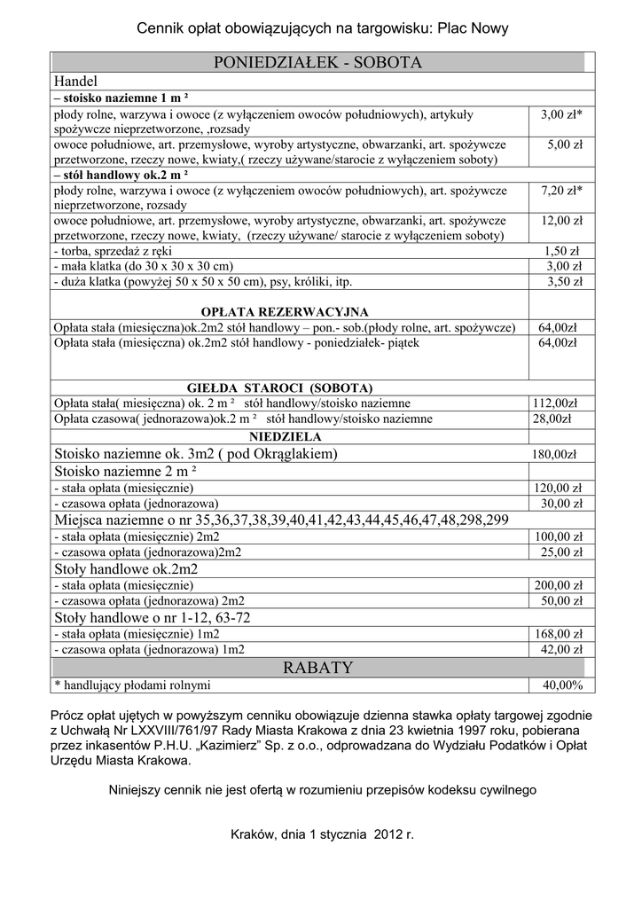 Cennik opłat obowiązujących na targowisku: Plac Nowy PONIEDZIAŁEK - SOBOTA Handel – stoisko naziemne 1 m ² płody rolne, warzywa i owoce (z wyłączeniem owoców południowych), artykuły spożywcze nieprzetworzone, ,rozsady owoce południowe, art. przemysłowe, wyroby artystyczne, obwarzanki, art. spożywcze przetworzone, rzeczy nowe, kwiaty,( rzeczy używane/starocie z wyłączeniem soboty) – stół handlowy ok.2 m ² płody rolne, warzywa i owoce (z wyłączeniem owoców południowych), art. spożywcze nieprzetworzone, rozsady owoce południowe, art. przemysłowe, wyroby artystyczne, obwarzanki, art. spożywcze przetworzone, rzeczy nowe, kwiaty, (rzeczy używane/ starocie z wyłączeniem soboty) - torba, sprzedaż z ręki - mała klatka (do 30 x 30 x 30 cm) - duża klatka (powyżej 50 x 50 x 50 cm), psy, króliki, itp. 3,00 zł* 5,00 zł 7,20 zł* 12,00 zł 1,50 zł 3,00 zł 3,50 zł OPŁATA REZERWACYJNA Opłata stała (miesięczna)ok.2m2 stół handlowy – pon.- sob.(płody rolne, art. spożywcze) Opłata stała (miesięczna) ok.2m2 stół handlowy - poniedziałek- piątek GIEŁDA STAROCI (SOBOTA) Opłata stała( miesięczna) ok. 2 m ² stół handlowy/stoisko naziemne Opłata czasowa( jednorazowa)ok.2 m ² stół handlowy/stoisko naziemne NIEDZIELA 64,00zł 64,00zł 112,00zł 28,00zł Stoisko naziemne ok. 3m2 ( pod Okrąglakiem) Stoisko naziemne 2 m ² 180,00zł - stała opłata (miesięcznie) - czasowa opłata (jednorazowa) 120,00 zł 30,00 zł Miejsca naziemne o nr 35,36,37,38,39,40,41,42,43,44,45,46,47,48,298,299 - stała opłata (miesięcznie) 2m2 - czasowa opłata (jednorazowa)2m2 100,00 zł 25,00 zł Stoły handlowe ok.2m2 - stała opłata (miesięcznie) - czasowa opłata (jednorazowa) 2m2 200,00 zł 50,00 zł Stoły handlowe o nr 1-12, 63-72 - stała opłata (miesięcznie) 1m2 - czasowa opłata (jednorazowa) 1m2 168,00 zł 42,00 zł RABATY * handlujący płodami rolnymi 40,00% Prócz opłat ujętych w powyższym cenniku obowiązuje dzienna stawka opłaty targowej zgodnie z Uchwałą Nr LXXVIII/761/97 Rady Miasta Krakowa z dnia 23 kwietnia 1997 roku, pobierana przez inkasentów P.H.U. „Kazimierz” Sp. z o.o., odprowadzana do Wydziału Podatków i Opłat Urzędu Miasta Krakowa. Niniejszy cennik nie jest ofertą w rozumieniu przepisów kodeksu cywilnego Kraków, dnia 1 stycznia 2012 r.