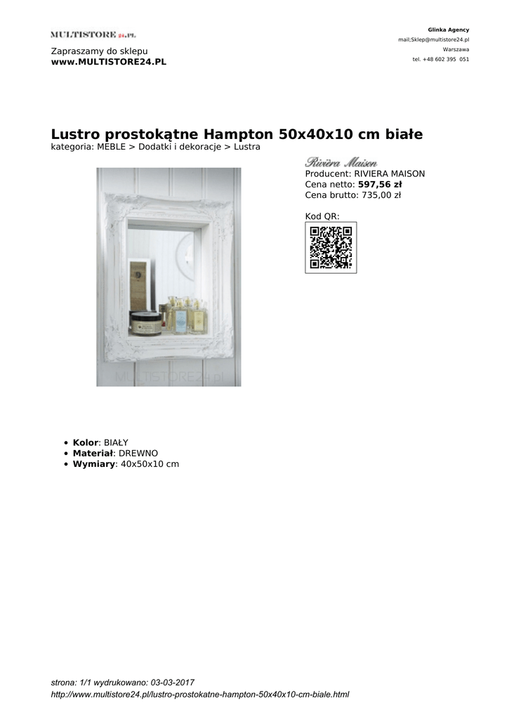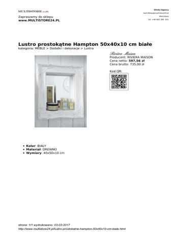 Glinka Agency mail;[email protected] Zapraszamy do sklepu www.MULTISTORE24.PL Warszawa tel. +48 602 395 051 Lustro prostokątne Hampton 50x40x10 cm białe kategoria: MEBLE > Dodatki i dekoracje > Lustra Producent: RIVIERA MAISON Cena netto: 597,56 zł Cena brutto: 735,00 zł Kod QR: Kolor: BIAŁY Materiał: DREWNO Wymiary: 40x50x10 cm strona: 1/1 wydrukowano: 03-03-2017 http://www.multistore24.pl/lustro-prostokatne-hampton-50x40x10-cm-biale.html