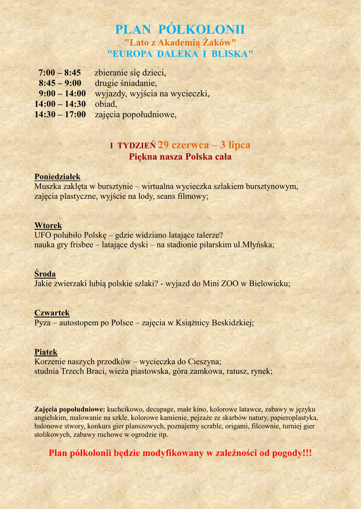 PLAN PÓŁKOLONII "Lato z Akademią Żaków" "EUROPA DALEKA I BLISKA" 7:00 – 8:45 8:45 – 9:00 9:00 – 14:00 14:00 – 14:30 14:30 – 17:00 zbieranie się dzieci, drugie śniadanie, wyjazdy, wyjścia na wycieczki, obiad, zajęcia popołudniowe, I TYDZIEŃ 29 czerwca – 3 lipca Piękna nasza Polska cała Poniedziałek Muszka zaklęta w bursztynie – wirtualna wycieczka szlakiem bursztynowym, zajęcia plastyczne, wyjście na lody, seans filmowy; Wtorek UFO polubiło Polskę – gdzie widziano latające talerze? nauka gry frisbee – latające dyski – na stadionie piłarskim ul.Młyńska; Środa Jakie zwierzaki lubią polskie szlaki? - wyjazd do Mini ZOO w Bielowicku; Czwartek Pyza – autostopem po Polsce – zajęcia w Książnicy Beskidzkiej; Piątek Korzenie naszych przodków – wycieczka do Cieszyna; studnia Trzech Braci, wieża piastowska, góra zamkowa, ratusz, rynek; Zajęcia popołudniowe: kuchcikowo, decupage, małe kino, kolorowe latawce, zabawy w języku angielskim, malowanie na szkle, kolorowe kamienie, pejzaże ze skarbów natury, papieroplastyka, balonowe stwory, konkurs gier planszowych, poznajemy scrable, origami, filcownie, turniej gier stolikowych, zabawy ruchowe w ogrodzie itp. Plan półkolonii będzie modyfikowany w zależności od pogody!!!