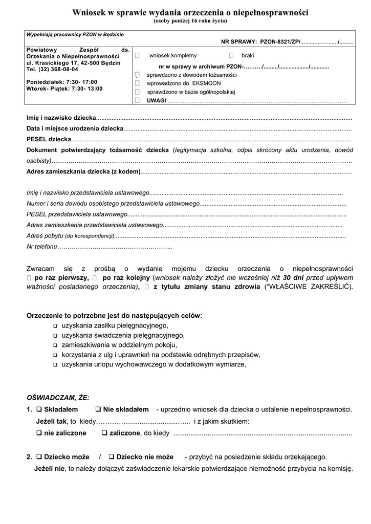 W n i o s e k w s p r a w i e w y d a n i a o r z e c z e n i a o n i e p e ł n o s p r aw n o ś c i ( o s o b y p o n i ż e j 1 6 r o ku ż y c i a ) Wypełniają pracownicy PZON w Będzinie NR SPRAWY: PZON-8321/ZP/......................../......... Powiatowy Zespół ds. Orzekania o Niepełnosprawności ul. Krasickiego 17, 42-500 Będzin Tel. (32) 368-08-04 Poniedziałek: 7:30- 17:00 Wtorek- Piątek: 7:30- 13:00 wniosek kompletny braki nr w sprawy w archiwum PZON-………./........./.................../............ sprawdzono z dowodem tożsamości wprowadzono do EKSMOON sprawdzono w bazie ogólnopolskiej UWAGI ……………………………………………………………………………………. Imię i nazwisko dziecka.................................................................................................................................................... Data i miejsce urodzenia dziecka.................................................................................................................................... PESEL dziecka.................................................................................................................................................................. Dokument potwierdzający tożsamość dziecka (legitymacja szkolna, odpis skrócony aktu urodzenia, dowód osobisty)………………………………………………………………………………………………………………………………. Adres zamieszkania dziecka (z kodem).......................................................................................................................... Imię i nazwisko przedstawiciela ustawowego................................................................................................................ Numer i seria dowodu osobistego przedstawiciela ustawowego..................................................................................... PESEL przedstawiciela ustawowego............................................................................................................................... Adres zamieszkania przedstawiciela ustawowego........................................................................................................ Adres pobytu (do korespondencji)...................................................................................................................................... Nr telefonu……………………………………………….. Zwracam się z prośbą o wydanie mojemu dziecku orzeczenia o niepełnosprawności po raz pierwszy, po raz kolejny (wniosek należy złożyć nie wcześniej niż 30 dni przed upływem ważności posiadanego orzeczenia), z tytułu zmiany stanu zdrowia (*WŁAŚCIWE ZAKREŚLIĆ). Orzeczenie to potrzebne jest do następujących celów: uzyskania zasiłku pielęgnacyjnego, uzyskania świadczenia pielęgnacyjnego, zamieszkiwania w oddzielnym pokoju, korzystania z ulg i uprawnień na podstawie odrębnych przepisów, uzyskania urlopu wychowawczego w dodatkowym wymiarze, OŚWIADCZAM, ŻE: 1. Składałem Nie składałem - uprzednio wniosek dla dziecka o ustalenie niepełnosprawności. Jeżeli tak, to kiedy…………….........................…... i z jakim skutkiem: nie zaliczone 2. Dziecko może zaliczone, do kiedy .............................................................................................. / Dziecko nie może - przybyć na posiedzenie składu orzekającego. Jeżeli nie, to należy dołączyć zaświadczenie lekarskie potwierdzające niemożność przybycia na komisję. INFORMACJA O ZAKRESIE OPIEKI I PIELĘGNACJI SPRAWOWANEJ NAD DZIECKI EM 1. Samoobsługa: dbanie o higienę osobistą samodzielnie / stosownie do wieku z pomocą brak możliwości spożywanie posiłków samodzielnie / stosownie do wieku z pomocą brak możliwości dziecko wymaga specjalnej diety ubieranie się NIE TAK (jakiej) ................................................................................ samodzielnie / stosownie do wieku z pomocą załatwianie czynności fizjologicznych samodzielnie / stosownie do wieku 2. Dziecko porusza się: samodzielnie / stosownie do wieku na wózku inwalidzkim z pomocą brak możliwości brak możliwości o kulach z pomocą drugiej osoby jest leżące 3. Nauka i edukacja: Przedszkole nie uczęszcza uczęszcza ( ogólnodostępne integracyjne specjalne) Szkoła nie uczęszcza uczęszcza ( ogólnodostępna integracyjna specjalna) samodzielnie Dodatkowe zajęcia szkolne, pozaszkolne Nauczanie indywidualne nie korzysta TAK niesamodzielnie NIE korzysta w wymiarze ........... godzin dziennie tygodniowo 4. Stosowane leczenie, rehabilitacja i pielęgnacja: Leczenie NIE TAK (jakie) ......................................................................................................................... w domu poza domem Częstotliwość wizyt lekarskich: (liczba w ciągu) Rehabilitacja NIE miesiąca........ roku....... poza domem Częstotliwość zabiegów rehab.: (liczba w ciągu) NIE tygodnia...... TAK (jaki rodzaj) ...................................................................................................... w domu Pielęgnacja dnia....... dnia......... tygodnia......... miesiąca......... roku.......... TAK (jaki rodzaj) ............................................................................................................. w domu poza domem Częstotliwość zabiegów pielęgn. (liczba w ciągu): dnia......... tygodnia......... miesiąca......... roku.......... ! UWAGA ! Do wniosku należy koniecznie dołączyć: 1. 2. 3. 4. Zaświadczenie o stanie zdrowia wypełnione przez lekarza prowadzącego – jest ono ważne przez 30 dni od daty wystawienia i w tym terminie należy dostarczyć je z wnioskiem Kserokopie posiadanej dokumentacji medycznej - powinny być potwierdzone ZA ZGODNOŚĆ Z ORYGINAŁEM. W przypadku braku potwierdzenia zgodności do wniosku należy dołączyć oryginały dokumentacji, które po pot