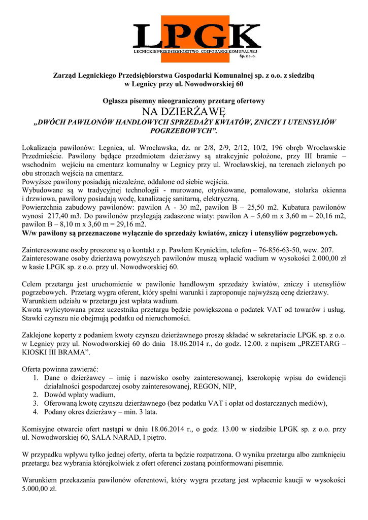 Zarząd Legnickiego Przedsiębiorstwa Gospodarki Komunalnej sp. z o.o. z siedzibą w Legnicy przy ul. Nowodworskiej 60 Ogłasza pisemny nieograniczony przetarg ofertowy NA DZIERŻAWĘ „DWÓCH PAWILONÓW HANDLOWYCH SPRZEDAŻY KWIATÓW, ZNICZY I UTENSYLIÓW POGRZEBOWYCH”. Lokalizacja pawilonów: Legnica, ul. Wrocławska, dz. nr 2/8, 2/9, 2/12, 10/2, 196 obręb Wrocławskie Przedmieście. Pawilony będące przedmiotem dzierżawy są atrakcyjnie położone, przy III bramie – wschodnim wejściu na cmentarz komunalny w Legnicy przy ul. Wrocławskiej, na terenach zielonych po obu stronach wejścia na cmentarz. Powyższe pawilony posiadają niezależne, oddalone od siebie wejścia. Wybudowane są w tradycyjnej technologii - murowane, otynkowane, pomalowane, stolarka okienna i drzwiowa, pawilony posiadają wodę, kanalizację sanitarną, elektryczną. Powierzchnia zabudowy pawilonów: pawilon A - 30 m2, pawilon B – 25,50 m2. Kubatura pawilonów wynosi 217,40 m3. Do pawilonów przylegają zadaszone wiaty: pawilon A – 5,60 m x 3,60 m = 20,16 m2, pawilon B – 8,10 m x 3,60 m = 29,16 m2. W/w pawilony są przeznaczone wyłącznie do sprzedaży kwiatów, zniczy i utensyliów pogrzebowych. Zainteresowane osoby proszone są o kontakt z p. Pawłem Krynickim, telefon – 76-856-63-50, wew. 207. Zainteresowane osoby dzierżawą powyższych pawilonów muszą wpłacić wadium w wysokości 2.000,00 zł w kasie LPGK sp. z o.o. przy ul. Nowodworskiej 60. Celem przetargu jest uruchomienie w pawilonie handlowym sprzedaży kwiatów, zniczy i utensyliów pogrzebowych. Przetarg wygra oferent, który spełni warunki i zaproponuje najwyższą cenę dzierżawy. Warunkiem udziału w przetargu jest wpłata wadium. Kwota wylicytowana przez uczestnika przetargu będzie powiększona o podatek VAT od towarów i usług. Stawki czynszu nie obejmują podatku od nieruchomości. Zaklejone koperty z podaniem kwoty czynszu dzierżawnego proszę składać w sekretariacie LPGK sp. z o.o. w Legnicy przy ul. Nowodworskiej 60 do dnia 18.06.2014 r., do godz. 12.00. z napisem „PRZETARG – KIOSKI III BRAMA”. Oferta powinna zawierać: 1. Dane o dzierżawcy – imię i nazwisko osoby zainteresowanej, kserokopię wpisu do ewidencji działalności gospodarczej osoby zainteresowanej, REGON, NIP, 2. Dowód wpłaty wadium, 3. Oferowaną kwotę czynszu dzierżawnego (bez podatku VAT i opłat od dostarczanych mediów), 4. Podany okres dzierżawy – min. 3 lata. Komisyjne otwarcie ofert nastąpi w dniu 18.06.2014 r., o godz. 13.00 w siedzibie LPGK sp. z o.o. przy ul. Nowodworskiej 60, SALA NARAD, I piętro. W przypadku wpływu tylko jednej oferty, oferta ta będzie rozpatrzona. O wyniku przetargu albo zamknięciu przetargu bez wybrania którejkolwiek z ofert oferenci zostaną poinformowani pisemnie. Warunkiem przekazania pawilonów oferentowi, który wygra przetarg jest wpłacenie kaucji w wysokości 5.000,00 zł.