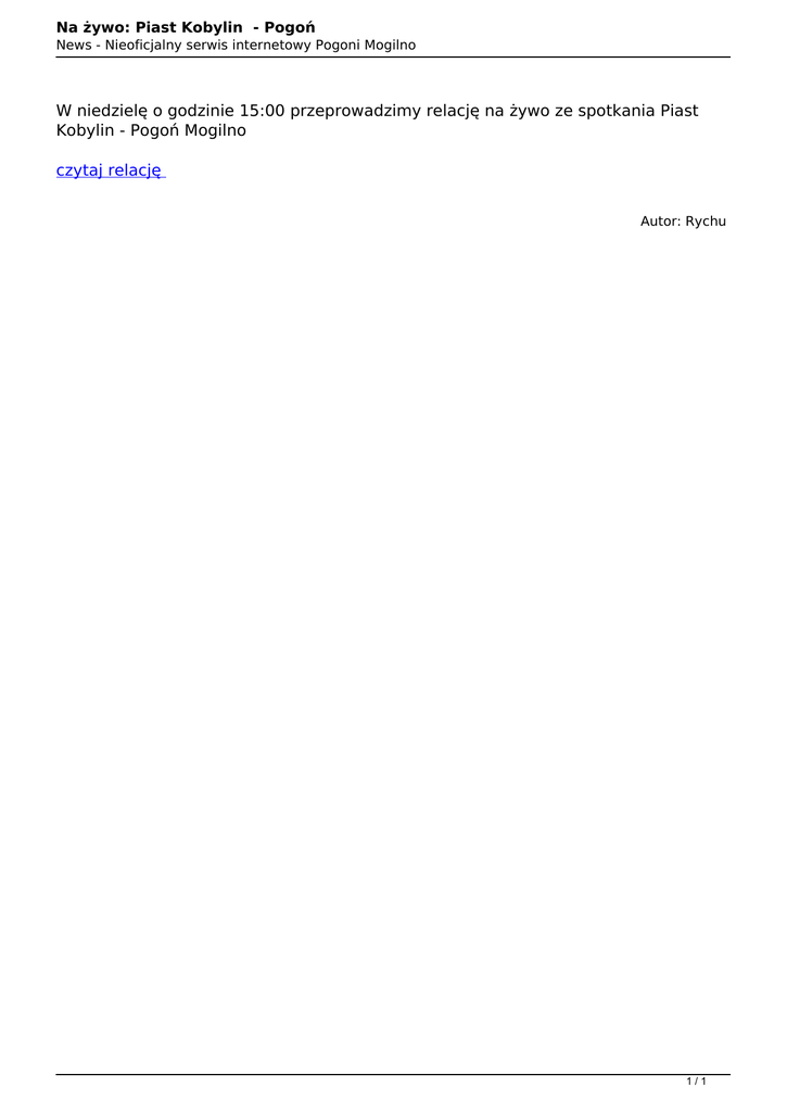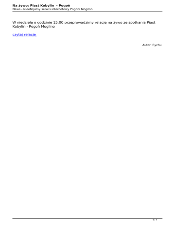 Na żywo: Piast Kobylin - Pogoń News - Nieoficjalny serwis internetowy Pogoni Mogilno W niedzielę o godzinie 15:00 przeprowadzimy relację na żywo ze spotkania Piast Kobylin - Pogoń Mogilno czytaj relację Autor: Rychu 1/1 Powered by TCPDF (www.tcpdf.org)