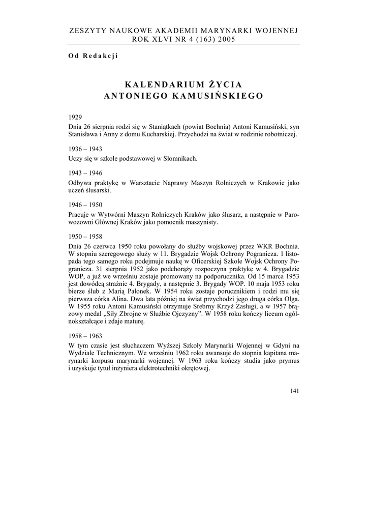 ZESZYTY NAUKOWE AKADEMII MARYNARKI WOJENNEJ ROK XLVI NR 4 (163) 2005 Od Redakcji KALENDARIUM ŻYCIA ANTONIEGO KAMUSIŃSKIEGO 1929 Dnia 26 sierpnia rodzi się w Staniątkach (powiat Bochnia) Antoni Kamusiński, syn Stanisława i Anny z domu Kucharskiej. Przychodzi na świat w rodzinie robotniczej. 1936 – 1943 Uczy się w szkole podstawowej w Słomnikach. 1943 – 1946 Odbywa praktykę w Warsztacie Naprawy Maszyn Rolniczych w Krakowie jako uczeń ślusarski. 1946 – 1950 Pracuje w Wytwórni Maszyn Rolniczych Kraków jako ślusarz, a następnie w Parowozowni Głównej Kraków jako pomocnik maszynisty. 1950 – 1958 Dnia 26 czerwca 1950 roku powołany do służby wojskowej przez WKR Bochnia. W stopniu szeregowego służy w 11. Brygadzie Wojsk Ochrony Pogranicza. 1 listopada tego samego roku podejmuje naukę w Oficerskiej Szkole Wojsk Ochrony Pogranicza. 31 sierpnia 1952 jako podchorąży rozpoczyna praktykę w 4. Brygadzie WOP, a już we wrześniu zostaje promowany na podporucznika. Od 15 marca 1953 jest dowódcą strażnic 4. Brygady, a następnie 3. Brygady WOP. 10 maja 1953 roku bierze ślub z Marią Palonek. W 1954 roku zostaje porucznikiem i rodzi mu się pierwsza córka Alina. Dwa lata później na świat przychodzi jego druga córka Olga. W 1955 roku Antoni Kamusiński otrzymuje Srebrny Krzyż Zasługi, a w 1957 brązowy medal „Siły Zbrojne w Służbie Ojczyzny”. W 1958 roku kończy liceum ogólnokształcące i zdaje maturę. 1958 – 1963 W tym czasie jest słuchaczem Wyższej Szkoły Marynarki Wojennej w Gdyni na Wydziale Technicznym. We wrześniu 1962 roku awansuje do stopnia kapitana marynarki korpusu marynarki wojennej. W 1963 roku kończy studia jako prymus i uzyskuje tytuł inżyniera elektrotechniki okrętowej. 141 Od Redakcji 1963 – 1968 Przez cztery lata pracuje jako starszy wykładowca elektrotechniki w Szkole Specjalistów Morskich Wojsk Ochrony Pogranicza w Gdańsku, a od 1967 roku w Szkole Specjalistów Morskich w Ustce. W 1964 roku otrzymuje odznaczenie „10 lat w Służbie Narodu”, rok później srebrny medal „Siły Zbrojne w Służbie Ojczyzny”. 1968 – 1972 Od kwietnia 1968 do początku 1972 roku pracuje jako przedstawiciel wojskowy w 124. Rejonowym Przedstawicielstwie Wojskowym Marynarki Wojennej. W październiku 1968 otrzymuje stopień komandora podporucznika. W 1970 w Wyższej Szkole Marynarki Wojennej kończy kurs magisterski. 1972 – 1989 W lutym 1972 roku rozpoczyna pracę w Wyższej Szkole Marynarki Wojennej na stanowisku adiunkta. Jeszcze w tym samym roku otrzymuje złoty medal „Siły Zbrojne w Służbie Ojczyzny”. W 1974 awansuje na stopień komandora porucznika. W 1975 roku odznaczony brązowym medalem „Za Zasługi dla Obronności Kraju”, a w 1978 Złotym Krzyżem Zasługi. W 1977 zostaje doktorem nauk technicznych Politechniki Gdańskiej. W 1980 roku odznaczony srebrnym medalem „Za Zasługi dla Obronności Kraju”. We wrześniu 1982 roku awansuje na stopień komandora. W 1985 roku odznaczony Krzyżem Kawalerskim Orderu Odrodzenia Polski, a w 1988 złotym medalem „Za Zasługi dla Obronności Kraju”. Dnia 9 listopada 1989 roku zostaje zwolniony z zawodowej służby wojskowej i przeniesiony w stan spoczynku. 1990 – 1999 We wrześniu 1990 roku podejmuje pracę w Akademii Marynarki Wojennej na stanowisku starszego wykładowcy. W lipcu 1991 roku Centralna Komisja ds. Tytułu Naukowego i Stopni Wojskowych zatwierdza uchwałę Rady Wydziału Elektrycznego Politechniki Gdańskiej z dnia 16 października 1990 roku w sprawie nadania dr. inż. Antoniemu Kamusińskiemu stopnia naukowego doktora habilitowanego. W 1993 roku minister obrony narodowej mianuje go na stanowisko profesora nadzwyczajnego Akademii Marynarki Wojennej. Po sześciu latach, 30 września 1999 roku, profesor Kamusiński po ukończeniu 70 lat odchodzi na emeryturę. 2000 Umiera 19 września w Gdańsku, przeżywszy 71 lat. 142 Zeszyty Naukowe AMW Kalendarium życia Antoniego Kamusińskiego 4 (163) 2005 143 Od Redakcji 144 Zeszyty Naukowe AMW