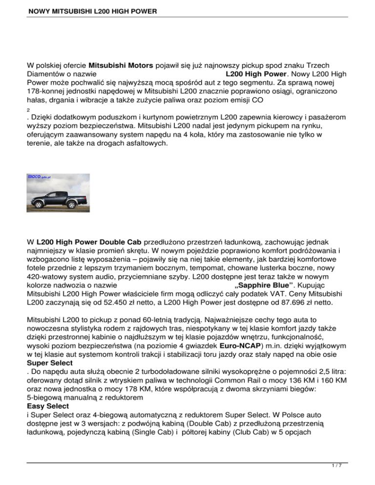 NOWY MITSUBISHI L200 HIGH POWER W polskiej ofercie Mitsubishi Motors pojawił się już najnowszy pickup spod znaku Trzech Diamentów o nazwie L200 High Power. Nowy L200 High Power może pochwalić się najwyższą mocą spośród aut z tego segmentu. Za sprawą nowej 178-konnej jednostki napędowej w Mitsubishi L200 znacznie poprawiono osiągi, ograniczono hałas, drgania i wibracje a także zużycie paliwa oraz poziom emisji CO 2 . Dzięki dodatkowym poduszkom i kurtynom powietrznym L200 zapewnia kierowcy i pasażerom wyższy poziom bezpieczeństwa. Mitsubishi L200 nadal jest jedynym pickupem na rynku, oferującym zaawansowany system napędu na 4 koła, który ma zastosowanie nie tylko w terenie, ale także na drogach asfaltowych. W L200 High Power Double Cab przedłużono przestrzeń ładunkową, zachowując jednak najmniejszy w klasie promień skrętu. W nowym pojeździe poprawiono komfort podróżowania i wzbogacono listę wyposażenia – pojawiły się na niej takie elementy, jak bardziej komfortowe fotele przednie z lepszym trzymaniem bocznym, tempomat, chowane lusterka boczne, nowy 420-watowy system audio, przyciemniane szyby. L200 dostępne jest teraz także w nowym kolorze nadwozia o nazwie „Sapphire Blue”. Kupując Mitsubishi L200 High Power właściciele firm mogą odliczyć cały podatek VAT. Ceny Mitsubishi L200 zaczynają się od 52.450 zł netto, a L200 High Power jest dostępne od 87.696 zł netto. Mitsubishi L200 to pickup z ponad 60-letnią tradycją. Najważniejsze cechy tego auta to nowoczesna stylistyka rodem z rajdowych tras, niespotykany w tej klasie komfort jazdy także dzięki przestronnej kabinie o najdłuższym w tej klasie pojazdów wnętrzu, funkcjonalność, wysoki poziom bezpieczeństwa (na poziomie 4 gwiazdek Euro-NCAP) m.in. dzięki wyjątkowym w tej klasie aut systemom kontroli trakcji i stabilizacji toru jazdy oraz stały napęd na obie osie Super Select . Do napędu auta służą obecnie 2 turbodoładowane silniki wysokoprężne o pojemności 2,5 litra: oferowany dotąd silnik z wtryskiem paliwa w technologii Common Rail o mocy 136 KM i 160 KM oraz nowa jednostka o mocy 178 KM, które współpracują z dwoma skrzyniami biegów: 5-biegową manualną z reduktorem Easy Select i Super Select oraz 4-biegową automatyczną z reduktorem Super Select. W Polsce auto dostępne jest w 3 wersjach: z podwójną kabiną (Double Cab) z przedłużoną przestrzenią ładunkową, pojedynczą kabiną (Single Cab) i półtorej kabiny (Club Cab) w 5 opcjach 1/7 NOWY MITSUBISHI L200 HIGH POWER wyposażenia – Inform , Invite , Intense , Intense Plus i Instyle oraz dziewięciu kolorach nadwozia. W ubiegłym roku L200 był drugim najpopularniejszym modelem Mitsubishi w Polsce. W 2008 roku sprzedano 1.047 takich aut. High Power o mocy 178 KM Inżynierowie Mitsubishi Motors z centrum badawczo-rozwojowego w Okazaki stanęli na wysokości zadania konstruując dla L200 nowy silnik High-Power 2.5Di-D o mocy 178 KM. Nowy motor będzie alternatywą dla oferowanej obecnie jednostki Mid-Power 2.5Di-D 136 KM i 167 KM, co da klientom w Europie większy wybór dostępnych opcji napędu. Gruntowna modernizacja spowodowała nie tylko poprawę osiągów, dzięki którym silnik jest obecnie liderem w swojej klasie. Odpowiednie przeprojektowanie jednostki przełożyło się także na istotne ograniczenie hałasu, wibracji i drgań. Inżynierowie MMC zmienili kształt komór spalania oraz stop metalu, z którego zostały wykonane. Wzmocniono łożyska, przeprojektowano wtrysk paliwa i turbosprężarkę oraz usprawniono układ chłodzenia. 2/7 NOWY MITSUBISHI L200 HIGH POWER W rezultacie nowy 2009 L200 2.5 Di-D High-Power może pochwalić się mocą 178 KM przy 4.000 obr/min (+ 29 % z przekładnią manualną i automatyczną w porównaniu z silnikiem Mid-Power) oraz maksymalnym momentem obrotowym wynoszącym odpowiednio 400 Nm przy 2.000 obr/min w wersjach z ręczną skrzynią biegów (+ 27% w porównaniu z Mid-Power) i 350 Nm przy 2.000 obr/min w wersjach z automatyczną skrzynią biegów (+ 11% w porównaniu z Mid-Power). Dodatkową korzyścią zwiększonej wydajności nowego silnika High Power 2.5 Di-D umieszczonego pod maską L200 jest znacznie mniejsze zużycie paliwa oraz niższy poziom emisji CO2. Nowy silnik współpracuje z: - 5-stopniową manualną skrzynią biegów, której walcową konstrukcję cechuje duża sztywność, pomagająca wyciszyć skrzynię i podnieść poziom jej niezawodności. Potrójne synchronizatory stożkowe dla I, II i III biegu zapewniają lekkie załączanie przełożeń. - sterowaną elektronicznie 4-stopniową automatyczną skrzynią biegów z nadbiegiem oferującą wysokie wartości momentu obrotowego, długą żywotność i niezawodność i korzystną charakterystykę zmiany przełożeń. Niższy poziom hałasu, wibracji i drgań Inżynierowie Mitsubishi jeszcze bardziej ograniczyli poziom hałasu, wibracji i drgań stosując szeroki zestaw elementów dźwiękochłonnych. Większe bezpieczeństwo bierne L200, znany z najwyższego poziomu bezpieczeństwa czynnego i biernego w swoim segmencie, oferuje w wersji 2009 nowe elementy: - boczne poduszki powietrzne w wersji Club Cab - boczne poduszki oraz kurtyny powietrzne w wersji Double Cab. 3/7 NOWY MITSUBISHI L200 HIGH POWER Dłuższa przestrzeń ładunkowa L200 nadal posiada najdłuższą kabinę w swoim segmencie (215,3 cm). W nowym Double Cab dodatkowo przedłużono przestrzeń ładunkową, by auto mogło lepiej sprostać wymaganiom klientów.Przeprojektowany pod kątem walorów użytkowych ujmuje prostotą oraz oferuje dodatkowe 18 cm przestrzeni ładunkowej (wzrost z 1.325 mm do 1.505 mm). Pomimo większej o 18 cm długości całkowitej (5.180 mm wliczając zderzak ze stopniem) nowy L200 Double Cab posiada ten sam rozstaw osi, dzięki czemu niezmieniony pozostał, liczący 5,9 m, promień zawracania, który jest najlepszym wynikiem w swojej klasie. Dopracowany pakiet wyposażenia Informacje zwrotne od