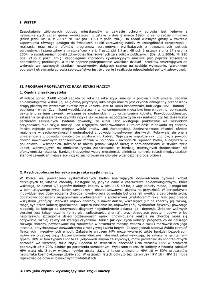 I. WSTĘP Zaspokajanie zbiorowych potrzeb mieszkańców w zakresie ochrony zdrowia jest jednym z najważniejszych zadań gminy wynikających z ustawy z dnia 8 marca 1990r. o samorządzie gminnym (tekst jedn. Dz. U. z 2001r. Nr 142 poz. 1591 z późn. zm.). Do zadań własnych gminy w zakresie zapewnienia równego dostępu do świadczeń opieki zdrowotnej należy w szczególności opracowanie i realizacja oraz ocena efektów programów zdrowotnych wynikających z rozpoznanych potrzeb zdrowotnych i stanu zdrowia mieszkańców - art. 7 ust.1 pkt 1 i art. 48 ust. 1 ustawy z dnia 27 sierpnia 2004r. o świadczeniach opieki zdrowotnej finansowanych ze środków publicznych (Dz. U. z 2004r. Nr 210 poz. 2135 z późn. zm.). Zapobieganie chorobom cywilizacyjnym możliwe jest poprzez stosowanie odpowiedniej profilaktyki, a także poprzez podejmowanie wszelkich działań i środków zmierzających do wykrycia we wczesnych stadiach nowotworów, dających szansę na szybkie wyleczenie. Warunkiem poprawy i utrzymania zdrowia społeczeństwa jest tworzenie i realizacja odpowiedniej polityki zdrowotnej. II. PROGRAM PROFILAKTYKI RAKA SZYJKI MACICY 1. Ogólna charakterystyka W Polsce ponad 3.600 kobiet zapada co roku na raka szyjki macicy, a połowa z nich umiera. Badania epidemiologiczne wskazują, że główną przyczyną raka szyjki macicy jest czynnik onkogenny przenoszony drogą płciową we wczesnym okresie życia kobiety. Jest to wirus brodawczaka ludzkiego HPV - human – papiloma - wirus. Czynnikami współdziałającymi w koncerogenezie mogą być inne wirusy np. opryszczki, bakterie oraz inne czynniki związane ze środowiskiem lub organizmem kobiety. Prawdopodobieństwo zakażenia zwiększają takie czynniki ryzyka jak wczesne rozpoczęcie życia seksualnego czy też duża liczba partnerów seksualnych. Badania dowiodły, że wirus HPV występuje praktycznie we wszystkich przypadkach raka szyjki macicy. Pod względem zachorowalności i umieralności z powodu tej choroby Polska zajmuje czołowe miejsce wśród krajów Unii Europejskiej. Zaobserwowano również różnice regionalne w zachorowalności i umieralności z powodu nowotworów złośliwych. Pokrywają się one z umieralnością z powodu nowotworów złośliwych u kobiet. Najwyższe współczynniki zgonów, z powodu chorób nowotworowych zaobserwować można w północno - zachodnich rejonach Polski, a najniższe w południowo - wschodnich. Różnice te należy jednak wiązać raczej z odmiennościami w stylach życia kobiet, wpływających na obniżenie ryzyka zachorowania w bardziej tradycyjnych środowiskach niż efektywnością leczenia. Bardziej tradycyjne wzory moralności, silniejsza kontrola relacji międzyludzkich stanowi czynnik zmniejszający ryzyko zachorowań na choroby przenoszone drogą płciową. 2. Psychospołeczne konsekwencje raka szyjki macicy W Polsce nie prowadzono systematycznych badań analizujących doświadczenia życiowe kobiet dotkniętych tą właśnie chorobą. Dostępne są jedynie dane o charakterze epidemiologicznym, które wskazują, że niemal 1/3 zgonów dotknęła kobiety w wieku 15–49 lat, a więc kobiety młode, u progu lub w pełni aktywnego życia, karier zawodowych, niezrealizowanych planów na przyszłość. W perspektywie indywidualnego doświadczenia choroba nowotworowa powoduje ból oraz lęk wynikły z zagrożenia życia, dodatkowo podsycany negatywnymi wyobrażeniami i społecznymi „metaforami” raka. Rak jest przede wszystkim „zabójcą”. Pierwsze objawy choroby, a nawet dalsze, wskazujące już na znaczny jej rozwój, mogą być przez kobietę ignorowane. Dopiero nasilenie się objawów (ból, dyskomfort fizyczny) powoduje niepokój, do którego po otrzymaniu diagnozy niejednokrotnie dołącza lęk i depresja. Źródłem wtórnych cierpień jest także leczenie (chirurgia, radioterapia, chemia), oraz stresujące pobyty i obawy o los najbliższych, szczególnie dzieci pozbawionych opieki. Indywidualna reakcja na chorobę może się oczywiście różnić; zależy od szeregu czynników, takich jak cykl życia kobiety, prognoza co do dalszego rozwoju choroby, powodowane nią zaburzenia w strukturze rodziny, wiedza o raku i możliwościach jego leczenia, dotychczasowe doświadczenia z medycyną i wielu innych. Zawsze jednak stanowi źródło cierpień fizycznych i negatywnych emocji. Zakażenie wirusem HPV może wywierać także bardziej bezpośredni wpływ na przebieg ciąży. Liczne badania kliniczne i doświadczalne wskazują, że zakażenie genitalnymi typami HPV, w tym typami HPV 6/11 (odpowiedzialnymi za kłykciny), może prowadzić do spontanicznych poronień we wczesnej fazie ciąży. Badania te stwierdziły obecność DNA wirusów HPV w próbkach pobranych aż z 70% płodów po poronieniu samoistnym. Wykazano także, że kobiety z historią zakażeń HPV mają ok. 3 razy większe ryzyko utraty ciąży, a także znaleziono HPV 18 w 50% preparatów nabłoniaka kosmówkowego złośliwego. W ostatnich latach odkryto też, że wirusy HPV 16 i HPV 31 mogą replikować de novo w łożyskowych trofoblastach. 3. HPV jako czynnik wywołujący raka szyjki macicy Rozpoznanym czynnikiem sprawczym raka szyjki macicy są onkogenne wirusy brodawczaka ludzkiego (HPV). Zakażenia genitalnymi typami tych wirusów wywołują różnego typu zmiany przednowotworowe i nowotworowe na błonach śluzowych narządów płciowych i innych okolic ciała. Wirus przenoszony jest drogą płciową. Ryzyko zakażenia genitalnymi typami HPV w ciągu całego życia u osób aktywnych seksualnie wynosi około 50%, a zakażenia te są najczęstsze u młodych kobiet. Spośród ponad 100 typów wirusa HPV około 40 zakaża preferencyjnie błony śluzowe narządów płciowych. Największy związek z rakiem szyjki macicy wykazuje HPV 16 oraz HPV 18, które są odpowiedzialne za ponad 70% wszystkich przypadków tego raka i większość przypadków śródnabłonkowych zmian przedmowo-tworowych. Ścisły związek między 