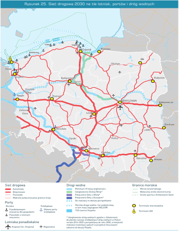Rysunek 25. Sieć drogowa 2030 na tle lotnisk, portów i dróg wodnych