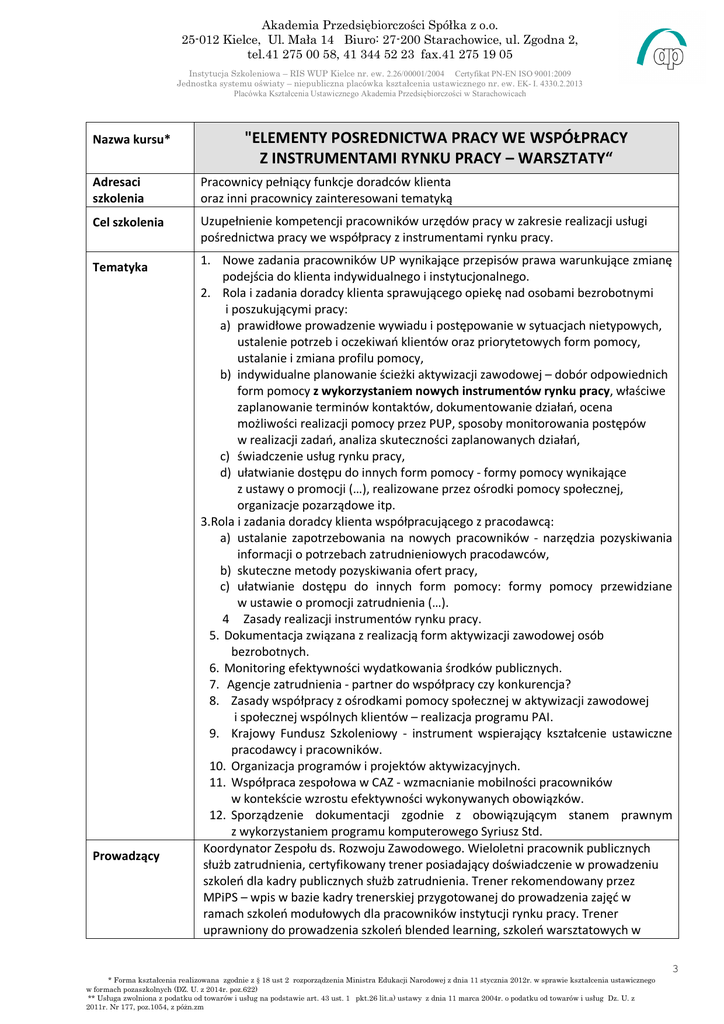 Akademia Przedsiębiorczości Spółka z o.o. 25-012 Kielce, Ul. Mała 14 Biuro: 27-200 Starachowice, ul. Zgodna 2, tel.41 275 00 58, 41 344 52 23 fax.41 275 19 05 Instytucja Szkoleniowa – RIS WUP Kielce nr. ew. 2.26/00001/2004 Certyfikat PN-EN ISO 9001:2009 Jednostka systemu oświaty – niepubliczna placówka kształcenia ustawicznego nr. ew. EK- I. 4330.2.2013 Placówka Kształcenia Ustawicznego Akademia Przedsiębiorczości w Starachowicach Nazwa kursu* "ELEMENTY POSREDNICTWA PRACY WE WSPÓŁPRACY Z INSTRUMENTAMI RYNKU PRACY – WARSZTATY“ Adresaci szkolenia Pracownicy pełniący funkcje doradców klienta oraz inni pracownicy zainteresowani tematyką Cel szkolenia Uzupełnienie kompetencji pracowników urzędów pracy w zakresie realizacji usługi pośrednictwa pracy we współpracy z instrumentami rynku pracy. Tematyka Prowadzący 1. Nowe zadania pracowników UP wynikające przepisów prawa warunkujące zmianę podejścia do klienta indywidualnego i instytucjonalnego. 2. Rola i zadania doradcy klienta sprawującego opiekę nad osobami bezrobotnymi i poszukującymi pracy: a) prawidłowe prowadzenie wywiadu i postępowanie w sytuacjach nietypowych, ustalenie potrzeb i oczekiwań klientów oraz priorytetowych form pomocy, ustalanie i zmiana profilu pomocy, b) indywidualne planowanie ścieżki aktywizacji zawodowej – dobór odpowiednich form pomocy z wykorzystaniem nowych instrumentów rynku pracy, właściwe zaplanowanie terminów kontaktów, dokumentowanie działań, ocena możliwości realizacji pomocy przez PUP, sposoby monitorowania postępów w realizacji zadań, analiza skuteczności zaplanowanych działań, c) świadczenie usług rynku pracy, d) ułatwianie dostępu do innych form pomocy - formy pomocy wynikające z ustawy o promocji (…), realizowane przez ośrodki pomocy społecznej, organizacje pozarządowe itp. 3.Rola i zadania doradcy klienta współpracującego z pracodawcą: a) ustalanie zapotrzebowania na nowych pracowników - narzędzia pozyskiwania informacji o potrzebach zatrudnieniowych pracodawców, b) skuteczne metody pozyskiwania ofert pracy, c) ułatwianie dostępu do innych form pomocy: formy pomocy przewidziane w ustawie o promocji zatrudnienia (…). 4 Zasady realizacji instrumentów rynku pracy. 5. Dokumentacja związana z realizacją form aktywizacji zawodowej osób bezrobotnych. 6. Monitoring efektywności wydatkowania środków publicznych. 7. Agencje zatrudnienia - partner do współpracy czy konkurencja? 8. Zasady współpracy z ośrodkami pomocy społecznej w aktywizacji zawodowej i społecznej wspólnych klientów – realizacja programu PAI. 9. Krajowy Fundusz Szkoleniowy - instrument wspierający kształcenie ustawiczne pracodawcy i pracowników. 10. Organizacja programów i projektów aktywizacyjnych. 11. Współpraca zespołowa w CAZ - wzmacnianie mobilności pracowników w kontekście wzrostu efektywności wykonywanych obowiązków. 12. Sporządzenie dokumentacji zgodnie z obowiązującym stanem prawnym z wykorzystaniem programu komputerowego Syriusz Std. Koordynator Zespołu ds. Rozwoju Zawodowego. Wieloletni pracownik publicznych służb zatrudnienia, certyfikowany trener posiadający doświadczenie w prowadzeniu szkoleń dla kadry publicznych służb zatrudnienia. Trener rekomendowany przez MPiPS – wpis w bazie kadry trenerskiej przygotowanej do prowadzenia zajęć w ramach szkoleń modułowych dla pracowników instytucji rynku pracy. Trener uprawniony do prowadzenia szkoleń blended learning, szkoleń warsztatowych w 3 * Forma kształcenia realizowana zgodnie z § 18 ust 2 rozporządzenia Ministra Edukacji Narodowej z dnia 11 stycznia 2012r. w sprawie kształcenia ustawicznego w formach pozaszkolnych (DZ. U. z 2014r. poz.622) ** Usługa zwolniona z podatku od towarów i usług na podstawie art. 43 ust. 1 pkt.26 lit.a) ustawy z dnia 11 marca 2004r. o podatku od towarów i usług Dz. U. z 2011r. Nr 177, poz.1054, z póżn.zm Akademia Przedsiębiorczości Spółka z o.o. 25-012 Kielce, Ul. Mała 14 Biuro: 27-200 Starachowice, ul. Zgodna 2, tel.41 275 00 58, 41 344 52 23 fax.41 275 19 05 Instytucja Szkoleniowa – RIS WUP Kielce nr. ew. 2.26/00001/2004 Certyfikat PN-EN ISO 9001:2009 Jednostka systemu oświaty – niepubliczna placówka kształcenia ustawicznego nr. ew. EK- I. 4330.2.2013 Placówka Kształcenia Ustawicznego Akademia Przedsiębiorczości w Starachowicach zakresie wdrażania modelu diagnozowania zapotrzebowania na kwalifikacje oraz szkoleń nt. badania efektywności aktywnej polityki rynku pracy. Praktyk w zakresie KFS. Termin 01-03 marca 2017 r. ZAKOPANE 1490 zł Cena** Termin zgłoszeń W cenie: materiały szkoleniowe, zaświadczenie zgodne ze wzorem MEN, zakwaterowanie w pokojach 2os. w hotelu /ośrodku o standardzie 3***. wyżywienie, obsługa i opieka organizatora. Możliwość rezerwacji dodatkowego noclegu lub pokoju 1-os. za dopłatą oraz wliczenia kosztu dojazdu w cenę szkolenia 15 lutego 2017r. 4 * Forma kształcenia realizowana zgodnie z § 18 ust 2 rozporządzenia Ministra Edukacji Narodowej z dnia 11 stycznia 2012r. w sprawie kształcenia ustawicznego w formach pozaszkolnych (DZ. U. z 2014r. poz.622) ** Usługa zwolniona z podatku od towarów i usług na podstawie art. 43 ust. 1 pkt.26 lit.a) ustawy z dnia 11 marca 2004r. o podatku od towarów i usług Dz. U. z 2011r. Nr 177, poz.1054, z póżn.zm