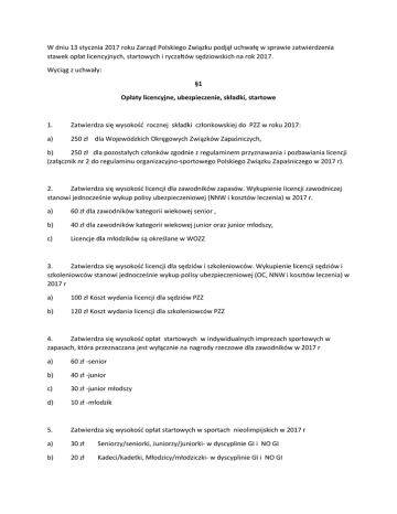 W dniu 13 stycznia 2017 roku Zarząd Polskiego Związku podjął uchwałę w sprawie zatwierdzenia stawek opłat licencyjnych, startowych i ryczałtów sędziowskich na rok 2017. Wyciąg z uchwały: §1 Opłaty licencyjne, ubezpieczenie, składki, startowe 1. Zatwierdza się wysokość rocznej składki członkowskiej do PZZ w roku 2017: a) 250 zł dla Wojewódzkich Okręgowych Związków Zapaśniczych, b) 250 zł dla pozostałych członków zgodnie z regulaminem przyznawania i pozbawiania licencji (załącznik nr 2 do regulaminu organizacyjno-sportowego Polskiego Związku Zapaśniczego w 2017 r). 2. Zatwierdza się wysokość licencji dla zawodników zapasów. Wykupienie licencji zawodniczej stanowi jednocześnie wykup polisy ubezpieczeniowej (NNW i kosztów leczenia) w 2017 r. a) 60 zł dla zawodników kategorii wiekowej senior , b) 40 zł dla zawodników kategorii wiekowej junior oraz junior młodszy, c) Licencje dla młodzików są określane w WOZZ 3. Zatwierdza się wysokość licencji dla sędziów i szkoleniowców. Wykupienie licencji sędziów i szkoleniowców stanowi jednocześnie wykup polisy ubezpieczeniowej (OC, NNW i kosztów leczenia) w 2017 r a) 100 zł Koszt wydania licencji dla sędziów PZZ b) 120 zł Koszt wydania licencji dla szkoleniowców PZZ 4. Zatwierdza się wysokość opłat startowych w indywidualnych imprezach sportowych w zapasach, która przeznaczana jest wyłącznie na nagrody rzeczowe dla zawodników w 2017 r a) 60 zł -senior b) 40 zł -junior c) 30 zł -junior młodszy d) 10 zł -młodzik 5. Zatwierdza się wysokość opłat startowych w sportach nieolimpijskich w 2017 r a) 30 zł Seniorzy/seniorki, Juniorzy/juniorki- w dyscyplinie GI i NO GI b) 20 zł Kadeci/kadetki, Młodzicy/młodziczki- w dyscyplinie GI i NO GI