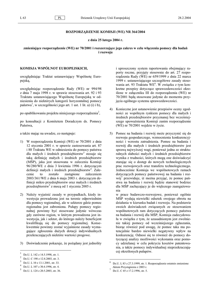 L 63 PL Dziennik Urzędowy Unii Europejskiej 28.2.2004 ROZPORZĄDZENIE KOMISJI (WE) NR 364/2004 z dnia 25 lutego 2004 r. zmieniające rozporządzenie (WE) nr 70/2001 i rozszerzające jego zakres w celu włączenia pomocy dla badań i rozwoju i uproszczony system raportowania obejmujący raporty roczne, przyjęty stosownie do art. 27 rozporządzenia Rady (WE) nr 659/1999 z dnia 22 marca 1999 r. ustanawiającego szczegółowe zasady stosowania art. 93 Traktatu WE6. W związku z tym konkretne przepisy dotyczące sprawozdawczości określone w załączniku III do rozporządzenia (WE) nr 70/2001 będą stosowane jedynie do momentu przyjęcia ogólnego systemu sprawozdawczości. KOMISJA WSPÓLNOT EUROPEJSKICH, uwzględniając Traktat ustanawiający Wspólnotę Europejską, uwzględniając rozporządzenie Rady (WE) nr 994/98 z dnia 7 maja 1998 r. w sprawie stosowania art. 92 i 93 Traktatu ustanawiającego Wspólnotę Europejską w odniesieniu do niektórych kategorii horyzontalnej pomocy państwa1, w szczególności jego art. 1 ust. 1 lit. a) (i) i b), po opublikowaniu projektu niniejszego rozporządzenia2, po konsultacji z Komitetem Doradczym ds. Pomocy Państwa, a także mając na uwadze, co następuje: 1) W rozporządzeniu Komisji (WE) nr 70/2001 z dnia 12 stycznia 2001 r. w sprawie zastosowania art. 87 i 88 Traktatu WE w odniesieniu do pomocy państwa dla małych i średnich przedsiębiorstw3 stosuje się taką definicję małych i średnich przedsiębiorstw (MŚP), jaka jest stosowana w zaleceniu Komisji 96/280/WE z dnia 3 kwietnia 1996 r. dotyczącym definicji małych i średnich przedsiębiorstw4. Zalecenie to zostało zastąpione zaleceniem 2003/361/WE z dnia 6 maja 2003 r. dotyczącym definicji mikro przedsiębiorstw oraz małych i średnich przedsiębiorstw5 z mocą od 1 stycznia 2005 r. 2) Należy wyjaśnić zasady w przypadkach, kiedy inwestycja prowadzona jest na terenie odpowiednim dla pomocy regionalnej, ale w sektorze gdzie pomoc regionalna jest zabroniona. Pułapy pomocy regionalnej powinny być stosowane jedynie wówczas gdy zarówno region, w którym prowadzona jest inwestycja, jak i sektor, do którego należy beneficjent kwalifikują się do pomocy regionalnej. Konsekwentnie powinny zostać wyjaśnione zasady wymagające zgłoszenia dużych dotacji indywidualnych przekraczających niektóre wartości progowe. 3) Doświadczenie pokazuje, że pożądany jest jednolity 1 Dz.U. L 142 z 14.5.1998, str. 1. Dz.U. C 190 z 12.8.2003, str. 3. 3 Dz.U. L 10 z 13.1.2001, str. 33. 4 Dz.U. L 107 z 30.4.1996, str. 4. 5 Dz.U. L 124 z 20.5.2003, str. 36. 4) Konieczne jest ustanowienie przepisów oceny zgodności ze wspólnym rynkiem pomocy dla małych i średnich przedsiębiorstw przyznanej bez wcześniejszego upoważnienia Komisji zanim rozporządzenie (WE) nr 70/2001 wejdzie w życie. 5) Pomoc na badania i rozwój może przyczynić się do rozwoju gospodarczego, wzmocnienia konkurencyjności i wzrostu zatrudnienia. Pomoc na badania i rozwój dla małych i średnich przedsiębiorstw jest sprawą najwyższej wagi, ponieważ jedna ze strukturalnych słabości małych i średnich przedsiębiorstw wynika z trudności, których mogą one doświadczyć starając się o dostęp do nowych technologicznych prac rozwojowych oraz transferu technologicznego. Jednocześnie Komisja we wspólnotowych ramach dotyczących pomocy państwowej na badania i rozwój7 przewiduje, iż można przyjąć, że pomoc państwa na badania i rozwój będzie stanowić bodziec dla MŚP zachęcający je do większego zaangażowania w prace badawczo-rozwojowe, ponieważ ogólnie MŚP wydają niewielki odsetek swojego obrotu na działania w kierunku badań i rozwoju. Na podstawie swoich doświadczeń związanych ze stosowaniem wspólnotowych ram dotyczących pomocy państwa na badania i rozwój dla MŚP, Komisja zadecydowała w związku z tym, że uzasadnionym jest zwolnienie takiej pomocy od wcześniejszego zgłaszania, biorąc również pod uwagę, że pomoc taka ma potencjalnie bardzo niewielki negatywny wpływ na konkurencję. Odnosi się to również do pomocy dotyczącej analizy możliwości wykonania oraz pomocy udzielanej w celu pokrycia kosztów patentowania, a także pomocy indywidualnej nieprzekraczającej określonych pułapów. 2 6 Dz.U. L 83 z 27.3.1999, str. 1. Rozporządzenie ostatnio zmienione Aktem Przystąpienia z 2003 r. 7 Dz.U. C 45 z 17.2.1996, str. 5. L 63 PL Dziennik Urzędowy Unii Europejskiej 6) Wobec tego zakres rozporządzenia (WE) nr 70/2001 powinien zostać rozszerzony, tak aby objął pomoc na badania i rozwój przyznawaną MŚP w jak największej ilości sektorów. 7) Niektóre definicje w rozporządzeniu (WE) nr 70/2001 powinny zostać zmienione celem ujęcia szczegółów dotyczących pomocy państwa na badania i rozwój, a inne powinno się dodać. Szczególnie powinno się dodać definicje etapów prac badawczorozwojowych znajdujące się w załączniku I do wspólnotowych ram pomocy państwa na badania i rozwój. Lista dopuszczalnych kosztów powinna odpowiadać liście w załączniku II do wspólnotowych ram przy pewnych wyjaśnieniach koniecznych w celu pokazania faktu, że rozporządzenie jest stosowane bezpośrednio w Państwach Członkowskich. Beneficjenci nie będą mogli korzystać z podwójnego subsydiowania identycznych wyników badań. 28.2.2004 tów, przekracza intensywność pomocy w tym rozporządzeniu i jest zwrotna jedynie w przypadku pomyślnego wyniku prac badawczych, jak to zostało przewidziane we wspólnotowych ramach pomocy państwa na badania i rozwój, ponieważ Komisja ocenia pomoc zwrotną dotyczącą danej sprawy na podstawie sprawy, biorąc pod uwagę proponowane warunki zwrotu. 12) Rozporządzenie (WE) nr 70/2001, zmienione niniejszym rozporządzeniem, stosuje się wyłącznie w odniesieniu do pomocy państwa na badania i rozwój przyznawanej małym i średnim przedsiębiorstwom. Wspólnotowe ramy pomocy państwa na badania i rozwój są wciąż aktualne w odnies