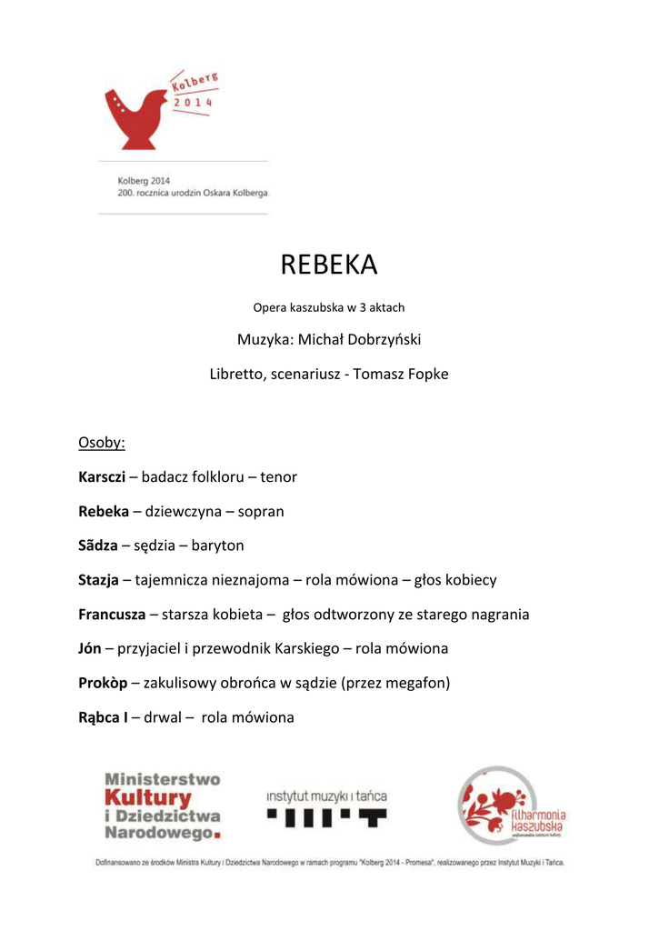 REBEKA Opera kaszubska w 3 aktach Muzyka: Michał Dobrzyński Libretto, scenariusz - Tomasz Fopke Osoby: Karsczi – badacz folkloru – tenor Rebeka – dziewczyna – sopran Sãdza – sędzia – baryton Stazja – tajemnicza nieznajoma – rola mówiona – głos kobiecy Francusza – starsza kobieta – głos odtworzony ze starego nagrania Jón – przyjaciel i przewodnik Karskiego – rola mówiona Prokòp – zakulisowy obrońca w sądzie (przez megafon) Rąbca I – drwal – rola mówiona Rąbca II – drwal – rola mówiona Szëmón – mężczyzna – rola mówiona Mańdel – karczmarz – rola mówiona Szandara – żandarm – rola mówiona Rąbcë – chór męski, drwale AKT I Wnętrze XIXw. chaty kaszubskiej. Badacz folkloru Kamil Karsczi notuje opowieści i piosenki usłyszane od miejscowych i przybyłych z okolicznych miejscowości. Francusza …i tak król kôzôł ùszëc swi córce trzë sëknie: mòdrą jak niebò, strzébrzną jak miesąc a złotą jak słuńce. A do te jesz kòżëch ze wszëtczëch zwierzãtów swiata. Karsczi Co bëło dali? Francusza Prińcesa nie chca za swégò òjca jic. Założa kòżëch i wtim jã przeniosło w jiny môl. Do gãstégò lasu. Szła i doszła do zómkù, dze kùchôrka ji da w psy bùdze spac. Karsczi (notuje) … w psy bùdze spac… Francusza Prińc z negò zómkù bal wëprôwiôł, bò chcôł so nalezc brutkã do żeńbë. Kùchôrka pùszcza na tuńce nã prińcesã z psy bùdë, co so kléd mòdri jak niebò założa. I prińc leno z nią tuńcowôł. Karsczi … z nią tuńcowôł… Francusza Òna so swój kòżëch założa nazôt a prińc nick nie zmerkôł, że to ba òna. Żebë jã nalezc, òn jesz jeden bal zrobił i jesz jeden – a òna to strzébrzną sëkniã, to złotą sëkniã założa – i prińc le wcyg z nią tuńcowôł. I dôł ji swój piestrzéń złoti. Karsczi …piestrzéń złoti… Francusza Kùchôrka kôza ji zupã dlô prińca ùwarzëc a òna na spódk talerza nen piestrzéń pùsca. Prińcowi zupa szmaka a czej nalôzł w talôrzu piestrzéń, zawòłôł tã, co zupã ùwarza i pòznôł, że to je na, co mù sã widzy. Tim spòsobã dzewùs z psy bùdë doprzëszło do zómkù prińca. Karsczi I? Francusza …I długò żëlë a szczestlewie. Karsczi A mie to pòwiôdała? Francusza Wòjewsczich Francusza z Gòscëcëna Karsczi A Wami to pòwiôdała? Francusza Mòja mëmka, Miotkòwa Ana z Bólszewa Karsczi Dzãkùjã Wami baro. Z Bògã! Francusza Òstanita z Bògã! Wychodzi. Karsczi Cëż sã w Piãknym Lasu spiéwô, Szëmónie? Szëmón W Szëmôłdze, Panie. Karsczi Nié w Schön Waldze? Rąbcë Më jesmë Kaszëbi, nié Niemcë! (pieśń – cytat ludowy, dodana przez kompozytora) Zemia jãczi, mòrze rëczi, sztorm tuńcëje z falą. Wałë wësok, jak te chëcze z hùkã ò sztrąd walą. Bôt pòsłëszny je rëbôkóm, wiosłama pãcają Pòrze mòrze tak, jak mewa, procëm fali gnają. Białka w trwòdze, płaczą dzecë, na sztrąd pòbieżelë, Bôt sã jima nie wëwrócył, wiele rib złowilë. Karsczi Wiém, jô to, wiém… A jak szła ta chòranka ò Kaszce? Szëmón (uspokaja wzburzenie) Tak, tej kòl naj to sã spiéwało tak: Rąbcë (oryginalna melodia ludowa) Terô Wama pòwiém, jakô Kaszka bëła, Czedë reno wstała, nigdë sã nie mëła. Głowë nie ùczesze, jizbë nie wëmiece. Słoma w jizbie leżi, w domù fóra smiecy. Twarzëczka sã zdarzi jak kòl kòminiarzi. Krowë nie wëdoji, ògòna sã bòji. Swinie w seni rëją, kòtczi statczi mëją, Talerze pòd ławą zarosłé mùrawą. Drzewa nie narąbiã, wòdë nie przeniosã We dnie jã wëtłëczã, w nocë jã przeproszã. Ùtopiła mie sã mòja Kaszka w stëdni. Mòcno jã żałujã, że jaż zemia dudni. Terô Wama pòwiém, jakô Kaszka bëła, Czedë reno wstała, nigdë sã nie mëła. Karsczi Jesz rôz, jo? Terô same słowa (notuje) Szëmón (dyktuje, niektórë wyrazy głośniej) ... sã nie mëła. … nie wëmiece … w domù fóra smiecy … jak kòl kòminiarzi … ògòna sã bòji … kòtczi statczi mëją … talerze pòd ławą … w nocë jã przeproszã. … mòcno jã żałujã, że jaż zemia dudni. Karsczi Dzãkùjã. Pòzdrówczi a dlô Kaszczi – zdrowaszczi! Śmieją się, Szëmón i Rąbcë wychodzą. Mijają się w progu z Rebeką. Karsczi (patrzy na Rebekę) A kògùm të jest, aniele? Rebeka (pąsowiejąc) Jô? Rebeka. Wë mie wòłelë? Karsczi Co mie pòwiész? Rebeka Nié za wiele Karsczi Cos zanócysz? Rebeka Leno tëli: Sama jem, żôrotnô serota na swiece. Dôwno jem wëpłaka za swim szczescym òczë. Kam mie je pòdëszką, ni móm òjca, matczi, Na jich grobach roscą w trôwie dzëczé kwiôtczi. Ò pòrénkù rosë sã napijã zëmny A na wieczór w kùli pòłożã sã cemny. Sama jem, żôrotnô serota… Lejla, lejla, lejlala… Karsczi (do siebie) Co sã ze mną dzeje? Ta melodia smùtnô… Serce tak bùgrëje… Dzéwczã… Aniół… Wpada przewodnik i przyjaciel Karsczégò- Jón. Jón Trudno! Dziewczyna wybiega. Bãdze w karczmie spanié. Mòjsze mô na górze Szëkòwac pòsłanié. Patrzy po pustej izbie. To ju dzysô kùńc je…? Karsczi (patrząc w kierunku drzwi za dziewczyną) Kùńc… Je… Rąbcë Żëcé przez pôlce jak wòda przecékô A të szãtopórczi a kòzlinczi spiéwôsz! Szpòrtë a bôjczi i lëdzczé gôdanié W twòjim zesziwkù wnetk nańdą mieszkanié. Jón Czas òdpòcząc! Chcemë jic do Mańdelowi karczmë! AKT II Karczma Mańdla. Rebeka usługuje. Drwale śpiewają swoją pieśń biesiadną. Jón z Karsczim wchodzą i siadają przy stole. Drwale wznoszą kufle siedząc po czterech przy stole. Jedna chójka – (uderzają się kuflami wstając) spùszczonô! Drëgô chójka – spùszczonô! Trzëcô chójka – spùszczonô! Czwiôrtô chójka – spùszczonô! Wypijają do dna, śpiewają kołysząc się objęci. Zybie wiater, zybie las Bãdze las, czej nie mdze nas! Płënie swòją strëgą czas Bãdze l
