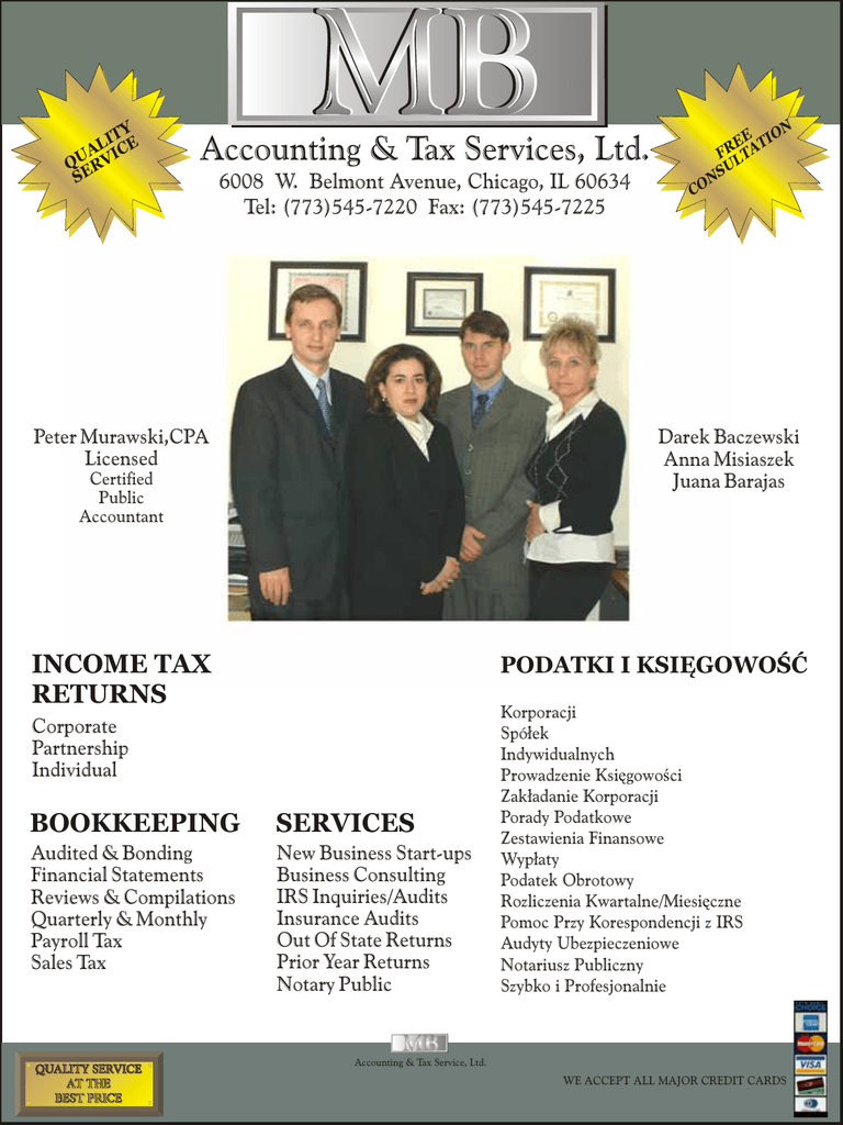 Y IT E L A IC QU RV E S MB Accounting & Tax Services, Ltd. 6008 W. Belmont Avenue, Chicago, IL 60634 Tel: (773)545-7220 Fax: (773)545-7225 Peter Murawski,CPA Licensed N EEATIO R F LT U S N O C Darek Baczewski Anna Misiaszek Juana Barajas Certified Public Accountant INCOME TAX RETURNS PODATKI I KSIÊGOWOŒÆ Corporate Partnership Individual BOOKKEEPING SERVICES Audited & Bonding Financial Statements Reviews & Compilations Quarterly & Monthly Payroll Tax Sales Tax New Business Start-ups Business Consulting IRS Inquiries/Audits Insurance Audits Out Of State Returns Prior Year Returns Notary Public Korporacji Spólek Indywidualnych Prowadzenie Ksiêgowoœci Zakladanie Korporacji Porady Podatkowe Zestawienia Finansowe Wyplaty Podatek Obrotowy Rozliczenia Kwartalne/Miesiêczne Pomoc Przy Korespondencji z IRS Audyty Ubezpieczeniowe Notariusz Publiczny Szybko i Profesjonalnie Accounting & Tax Service, Ltd. WE ACCEPT ALL MAJOR CREDIT CARDS