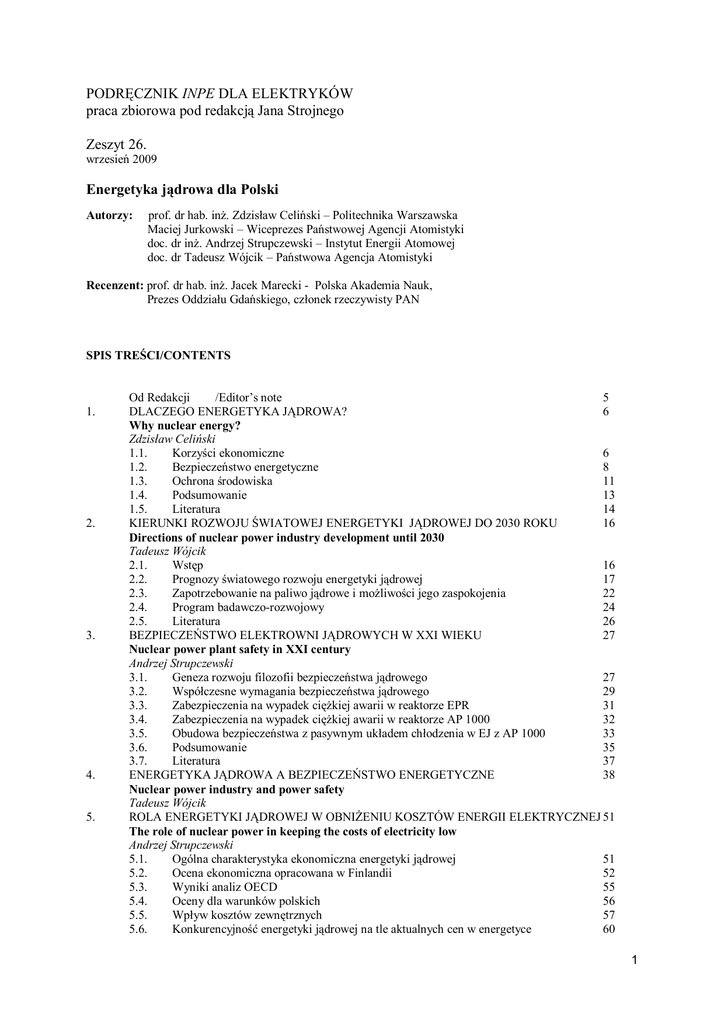 PODRĘCZNIK INPE DLA ELEKTRYKÓW praca zbiorowa pod redakcją Jana Strojnego Zeszyt 26. wrzesień 2009 Energetyka jądrowa dla Polski Autorzy: prof. dr hab. inż. Zdzisław Celiński – Politechnika Warszawska Maciej Jurkowski – Wiceprezes Państwowej Agencji Atomistyki doc. dr inż. Andrzej Strupczewski – Instytut Energii Atomowej doc. dr Tadeusz Wójcik – Państwowa Agencja Atomistyki Recenzent: prof. dr hab. inż. Jacek Marecki - Polska Akademia Nauk, Prezes Oddziału Gdańskiego, członek rzeczywisty PAN SPIS TREŚCI/CONTENTS 1. 2. 3. 4. 5. Od Redakcji /Editor’s note 5 DLACZEGO ENERGETYKA JĄDROWA? 6 Why nuclear energy? Zdzisław Celiński 1.1. Korzyści ekonomiczne 6 1.2. Bezpieczeństwo energetyczne 8 1.3. Ochrona środowiska 11 1.4. Podsumowanie 13 1.5. Literatura 14 KIERUNKI ROZWOJU ŚWIATOWEJ ENERGETYKI JĄDROWEJ DO 2030 ROKU 16 Directions of nuclear power industry development until 2030 Tadeusz Wójcik 2.1. Wstęp 16 2.2. Prognozy światowego rozwoju energetyki jądrowej 17 2.3. Zapotrzebowanie na paliwo jądrowe i możliwości jego zaspokojenia 22 2.4. Program badawczo-rozwojowy 24 2.5. Literatura 26 BEZPIECZEŃSTWO ELEKTROWNI JĄDROWYCH W XXI WIEKU 27 Nuclear power plant safety in XXI century Andrzej Strupczewski 3.1. Geneza rozwoju filozofii bezpieczeństwa jądrowego 27 3.2. Współczesne wymagania bezpieczeństwa jądrowego 29 3.3. Zabezpieczenia na wypadek ciężkiej awarii w reaktorze EPR 31 3.4. Zabezpieczenia na wypadek ciężkiej awarii w reaktorze AP 1000 32 3.5. Obudowa bezpieczeństwa z pasywnym układem chłodzenia w EJ z AP 1000 33 3.6. Podsumowanie 35 3.7. Literatura 37 ENERGETYKA JĄDROWA A BEZPIECZEŃSTWO ENERGETYCZNE 38 Nuclear power industry and power safety Tadeusz Wójcik ROLA ENERGETYKI JĄDROWEJ W OBNIŻENIU KOSZTÓW ENERGII ELEKTRYCZNEJ 51 The role of nuclear power in keeping the costs of electricity low Andrzej Strupczewski 5.1. Ogólna charakterystyka ekonomiczna energetyki jądrowej 51 5.2. Ocena ekonomiczna opracowana w Finlandii 52 5.3. Wyniki analiz OECD 55 5.4. Oceny dla warunków polskich 56 5.5. Wpływ kosztów zewnętrznych 57 5.6. Konkurencyjność energetyki jądrowej na tle aktualnych cen w energetyce 60 1 6. 7. DOZÓR BEZPIECZEŃSTWA JĄDROWEGO W POLSCE – NOWE WYZWANIA Nuclear safety regulation in Poland – new challenges Maciej Jurkowski 6.1. Cel i zasady bezpieczeństwa według aktualnych norm MAEA 6.2. Rola rządu w zapewnieniu bezpieczeństwa 6.3. Niezależność dozoru jądrowego – wymóg międzynarodowych konwencji 6.4. Przykłady przyjętych rozwiązań krajowych 6.5. Możliwe kierunki przekształceń ZASOBY PALIWOWE DLA ENERGETYKI JĄDROWEJ W POLSCE Fuel resources for nuclear power plants in Poland Andrzej Strupczewski 7.1. Dostępność uranu na wolnym rynku światowym 7.2. Możliwość uzyskiwania uranu z rud ubogich 7.3. Energia uzyskiwana w EJ 89 7.4. Energia potrzebna na wydobycie i oczyszczenie uranu 7.5. Energia na rekultywację kopalni 7.6. Porównania energii dla kopalni Ranger 7.7. Porównanie energetyczne dla kopalni z ubogą rudą uranową 7.8. Zużycie energii w kopalni w Trekkopje, Namibia 7.9. Dyskusja twierdzeń SLS 7.10. Zasoby uranu w Polsce 7.11. Zaopatrzenie w paliwo jądrowe dla planowanych obecnie elektrowni jądrowych w Polsce 64 68 70 71 73 84 85 86 88 89 90 90 91 92 93 93 96 2