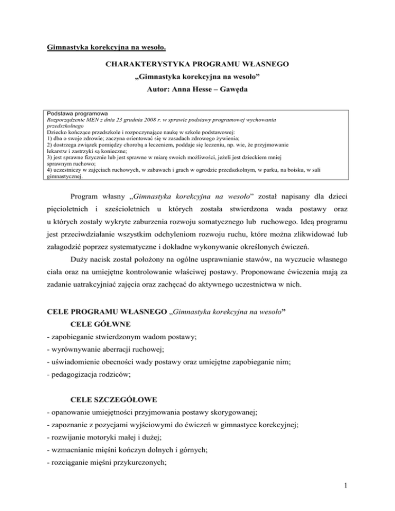 Gimnastyka korekcyjna na wesoło. CHARAKTERYSTYKA PROGRAMU WŁASNEGO „Gimnastyka korekcyjna na wesoło” Autor: Anna Hesse – Gawęda Podstawa programowa Rozporządzenie MEN z dnia 23 grudnia 2008 r. w sprawie podstawy programowej wychowania przedszkolnego Dziecko kończące przedszkole i rozpoczynające naukę w szkole podstawowej: 1) dba o swoje zdrowie; zaczyna orientować się w zasadach zdrowego żywienia; 2) dostrzega związek pomiędzy chorobą a leczeniem, poddaje się leczeniu, np. wie, że przyjmowanie lekarstw i zastrzyki są konieczne; 3) jest sprawne fizycznie lub jest sprawne w miarę swoich możliwości, jeżeli jest dzieckiem mniej sprawnym ruchowo; 4) uczestniczy w zajęciach ruchowych, w zabawach i grach w ogrodzie przedszkolnym, w parku, na boisku, w sali gimnastycznej. Program własny „Gimnastyka korekcyjna na wesoło” został napisany dla dzieci pięcioletnich i sześcioletnich u których została stwierdzona wada postawy oraz u których zostały wykryte zaburzenia rozwoju somatycznego lub ruchowego. Ideą programu jest przeciwdziałanie wszystkim odchyleniom rozwoju ruchu, które można zlikwidować lub załagodzić poprzez systematyczne i dokładne wykonywanie określonych ćwiczeń. Duży nacisk został położony na ogólne usprawnianie stawów, na wyczucie własnego ciała oraz na umiejętne kontrolowanie właściwej postawy. Proponowane ćwiczenia mają za zadanie uatrakcyjniać zajęcia oraz zachęcać do aktywnego uczestnictwa w nich. CELE PROGRAMU WŁASNEGO „Gimnastyka korekcyjna na wesoło” CELE GÓŁWNE - zapobieganie stwierdzonym wadom postawy; - wyrównywanie aberracji ruchowej; - uświadomienie obecności wady postawy oraz umiejętne zapobieganie nim; - pedagogizacja rodziców; CELE SZCZEGÓŁOWE - opanowanie umiejętności przyjmowania postawy skorygowanej; - zapoznanie z pozycjami wyjściowymi do ćwiczeń w gimnastyce korekcyjnej; - rozwijanie motoryki małej i dużej; - wzmacnianie mięśni kończyn dolnych i górnych; - rozciąganie mięśni przykurczonych; 1 - kształcenie mięśni wysklepujących stopy; - korygowanie nadmiernej kifozy, lordozy i skoliozy; - zmniejszanie dystonii mięśniowej; - wzmacnianie mięśni skośnych brzucha; - wzmacnianie mięśni pośladkowych i kulszowo – goleniowych; - zwiększanie pojemności życiowej płuc; - wzmacnianie mięśni ściągających łopatki; - doskonalenie mięśni posturalnych; - nauka ćwiczeń elongacyjnych oraz antygrawitacyjnych; - kształcenie świadomości własnego ciała; - zapoznanie ze sposobami dbania o higienę życia codziennego; - uświadomienie rodzicom znaczenia powstrzymywania dalszego rozwoju wady oraz zapobiegania powstawaniu nowych; CELE UZUPEŁNIAJĄCE - wdrażanie do dokładności wykonywanych ćwiczeń; - modelowanie uczciwości i wytrwałości; - kształcenie empatii; - doskonalenie umiejętności słuchania; - kształcenie umiejętności współpracy z partnerem; - kształtowanie pozytywnego spostrzegania samego siebie; TREŚCI NAUCZANIA Osiągnięcie sukcesów w prowadzeniu ćwiczeń korygujących wady postawy u dzieci uzależnione jest od właściwie sprecyzowanych treści nauczania, które w programie własnym „Gimnastyka korekcyjna na wesoło” są następujące: - zapoznanie z doborem pozycji wyjściowych i ćwiczeń; - zapoznanie z właściwym wykorzystaniem przyborów i przyrządów; - zachęcanie do umiejętnego kontrolowania poprawności wykonanych ćwiczeń; - umiejętne dostosowywanie ćwiczeń i metod do wieku, możliwości i zainteresowań ćwiczących; - indywidualizowanie ćwiczeń (lub części) i dostosowanie ich do potrzeb poszczególnych dzieci; - aktywizowanie rodziców do czynnej pomocy w niwelowaniu wady postawy dziecka; 2 - zachęcenie do wykonywania ćwiczeń korekcyjnych w domu przy współpracy z rodzicami; METODY PRACY: METODA SYNTETYCZNA (całości) – polega na nauczaniu określonej zabawy, gry, ćwiczenia ruchowego w całości, od początku w pełnej formie. W przypadku zabaw i gier ruchowych powinna ona być podstawową metodą nauczania. METODA ANALITYCZNA (części) – polega na nauczaniu poszczególnych elementów zabawy, gry, ćwiczenia ruchowego. Nauczanie rozpoczyna się od elementów prostych, łatwych. Po opanowaniu przez ćwiczących wyizolowanych elementów ruchu, należy przejść do bardziej złożonych, by w efekcie końcowym uczeń opanował daną zabawę, grę, ćwiczenie w całości. METODA MIESZANA (syntetyczno – analityczna) – polega w pierwszej fazie na nauczaniu częściami, a następnie w pełnej formie. Może ona polegać także na podziale uczniów na grupy. Dzieci mniej sprawne uczą się zabawy, gry, ćwiczenia za pomocą metody analitycznej, by przejść do pełnej formy ćwiczenia. Natomiast dzieci sprawniejsze mogą uczyć się od początku w pełnej formie zabawy, gry, ćwiczenia. METODA KOMPLEKSOWA – polega na nauczaniu wyodrębnionych przez nauczyciela kompleksów ruchowych danej zabawy, gry lub ćwiczenia ruchowego i jest połączeniem poprzednich metod, stosowanym często w celu korygowania błędów w wykonywanym ruchu. Wyodrębnić można również metody: podające (przyswajania, odtwórcze, reprodukcyjne); poszukujące (odkrywania, usamodzielniające, problemowe, twórcze); ekspresyjne (przeżywania; wyrabianie dyspozycji psychomotorycznych); zabawa naśladowcza zabawa klasyczna metoda opowieści ruchowej Thulina metoda ruchowej ekspresji twórczej R. Labana metoda K. Orffa gimnastyka rytmiczna Kniessów metoda ruchu rozwijającego W. Sherborne FORMY PRACY ŚCISŁA - uczeń powinien wykonywać zadanie ruchowe koncentrując uwagę przede wszystkim na dokładności. Forma ta sprzyja opanowaniu umiejętności zgodnie z modelem 3 techniki. Jednak ze względu na stosunkowo mała atrakcyjność tej formy, nieprzemyślane stosowanie tego typu ćwiczeń może powodować zniechęcenie i obniżenie aktywności. Trzeba pamiętać, że zwiększenie stopnia trudności ćwiczeń wpływa pozytywnie 