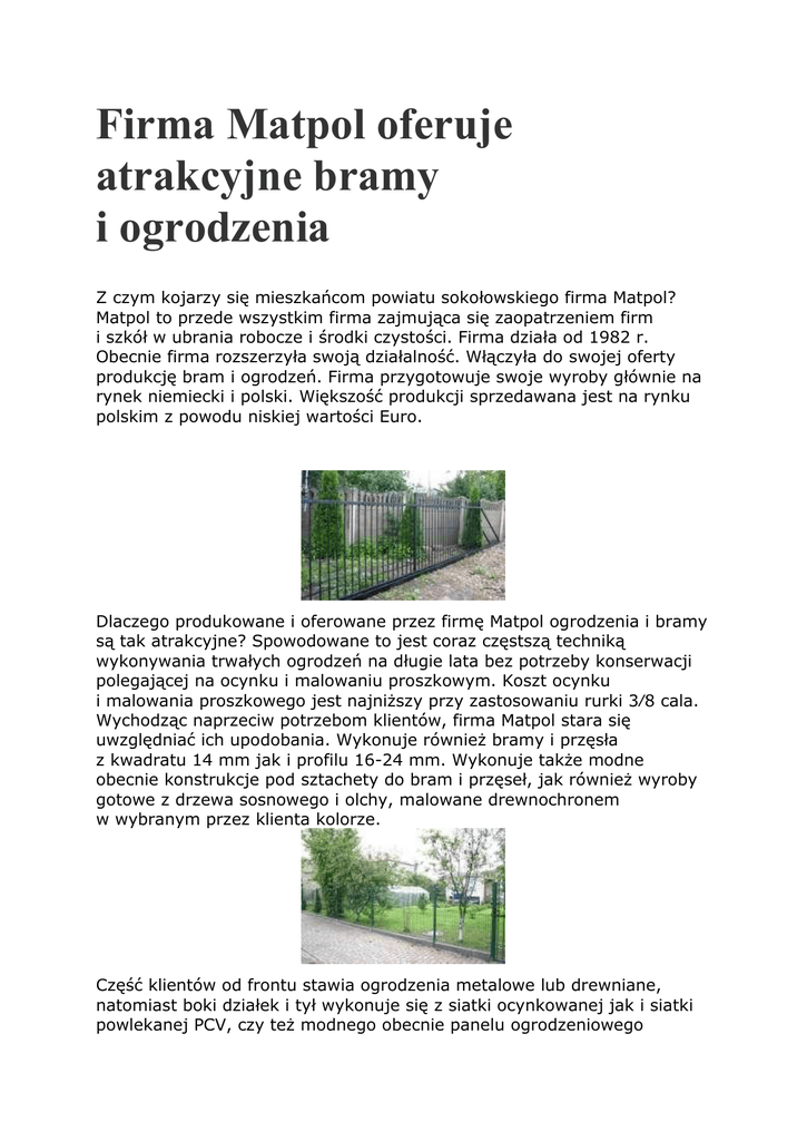 Firma Matpol oferuje atrakcyjne bramy i ogrodzenia Z czym kojarzy się mieszkańcom powiatu sokołowskiego firma Matpol? Matpol to przede wszystkim firma zajmująca się zaopatrzeniem firm i szkół w ubrania robocze i środki czystości. Firma działa od 1982 r. Obecnie firma rozszerzyła swoją działalność. Włączyła do swojej oferty produkcję bram i ogrodzeń. Firma przygotowuje swoje wyroby głównie na rynek niemiecki i polski. Większość produkcji sprzedawana jest na rynku polskim z powodu niskiej wartości Euro. Dlaczego produkowane i oferowane przez firmę Matpol ogrodzenia i bramy są tak atrakcyjne? Spowodowane to jest coraz częstszą techniką wykonywania trwałych ogrodzeń na długie lata bez potrzeby konserwacji polegającej na ocynku i malowaniu proszkowym. Koszt ocynku i malowania proszkowego jest najniższy przy zastosowaniu rurki 3⁄8 cala. Wychodząc naprzeciw potrzebom klientów, firma Matpol stara się uwzględniać ich upodobania. Wykonuje również bramy i przęsła z kwadratu 14 mm jak i profilu 16-24 mm. Wykonuje także modne obecnie konstrukcje pod sztachety do bram i przęseł, jak również wyroby gotowe z drzewa sosnowego i olchy, malowane drewnochronem w wybranym przez klienta kolorze. Część klientów od frontu stawia ogrodzenia metalowe lub drewniane, natomiast boki działek i tył wykonuje się z siatki ocynkowanej jak i siatki powlekanej PCV, czy też modnego obecnie panelu ogrodzeniowego wykonanego z drutu ocynkowanego lub malowanego proszkowo. Ogrodzenia panelowe i siatka sprawdzają się szczególnie przy ogrodzeniach boisk sportowych, szkół i osiedli mieszkaniowych. Ogrodzenia te są wykończone obrzeżami fundamentowymi, co daje estetyczny wygląd i długą trwałość. Ostatnio wykonaną inwestycją w Sokołowie Podlaskim było ogrodzenie przy Gimnazjum Nr 2, przy ul. Repkowskiej. Ogrodzenie niższe wykonane zostało z rurki 3/8 cala ocynkowanej i malowanej proszkowo i z panelu ogrodzeniowego czterometrowego z drutu ocynkowanego i malowanego proszkowo. Ponadto w swojej ofercie firma posiada ławki dwu i trzyosobowe wolnostojące, z możliwością betonowania. Są one ocynkowane i bardzo trwałe. Oferowane ławki są przede wszystkim przeznaczone dla szkół, urzędów miast, gmin i powiatów, spółdzielni mieszkaniowych, ale i dla indywidualnego klienta. Firma Matpol zajmuje się również montażem swoich wyrobów. Wielu klientów chce bowiem płacić za produkt skończony, za inwestycje wykonane pod klucz. Firma klientowi oferuje wykonanie fundamentów i podmurówki tradycyjnej (wykończonej tynkiem żywicznym, obłożonej klinkierem, pomalowanej jak i pokrytej blachą malowaną proszkowo). Istnieje też możliwość przygotowania podmurówki z kamienia polnego. Zapraszamy klientów do zapoznania się z naszą ofertą na stałej ekspozycji, która znajduje się w Sokołowie Podlaskim przy ul. Węgrowskiej (naprzeciwko Cukrowni, obok Dar-Gazu). Ekspozycję można oglądać w godz. 6.00-20.00. Telefon grzecznościowy: 501 626 926 lub kontakt: Hurtownia Ubrań Roboczych MATPOL ul. Piłsudskiego 13B (naprzeciwko Topazu). Tel. 25 787 26 87 Serdecznie zapraszamy!