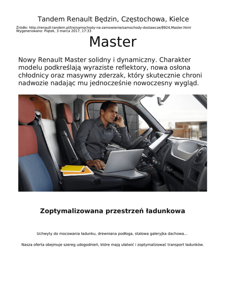 Tandem Renault Będzin, Częstochowa, Kielce Źródło: http://renault-tandem.pl/tre/samochody-na-zamowienie/samochody-dostawcze/8924,Master.html Wygenerowano: Piątek, 3 marca 2017, 17:33 Master Nowy Renault Master solidny i dynamiczny. Charakter modelu podkreślają wyraziste reflektory, nowa osłona chłodnicy oraz masywny zderzak, który skutecznie chroni nadwozie nadając mu jednocześnie nowoczesny wygląd. Zoptymalizowana przestrzeń ładunkowa Uchwyty do mocowania ładunku, drewniana podłoga, stalowa galeryjka dachowa... Nasza oferta obejmuje szereg udogodnień, które mają ułatwić i zoptymalizować transport ładunków. Lusterko "Wide View" Podróżuj spokojnie z lusterkiem "Wide System ESC nowej generacji View".To lusterko wsteczne udowadnia Dla Twojego bezpieczeństwa w każdym swoją użyteczność zwłaszcza na Renault MASTER montujemy seryjnie skrzyżowaniach. Lusterko umieszczone system ESC najnowszej generacji. System jest w tzw. martwym punkcie w osłonie ten wzbogacony jest o 3 dodatkowe przeciwsłonecznej pasażera i jest funkcje niezbędne w codziennym życiu prawdziwym atutem w bezpiecznej zawodowym. Funkcja Extended Grip jeździe. Lusterko zwiększa pole widzenia z optymalizuje przyczepność samochodu na boku na prawą stronę. miękkim gruncie takim jak luźny piach, błoto lub śnieg. Funkcja wspomagania ruszania pod górę pozwala Ci spokojnie ruszyć na nierównym podłożu nawet z pełnym obciążeniem. System stabilizacji toru jazdy przyczepy wykrywa wychylenia przyczepy i dokonuje korekty. Blokada mechanizmu różnicowego Poduszki powietrzne i pasy bezpieczeństwa Unikaj niebezpieczeństw związanych z Renault MASTER został wyposażony w jazdą na śliskiej nawierzchni. Funkcja urządzenia bezpieczeństwa pasywnego blokady mechanizmu różnicowego na najwyższym poziomie: seryjna dostępna w wersji Renault MASTER poduszka powietrzna kierowcy, poprawia przyczepność twojego trzypunktowe pasy bezpieczeństwa z samochodu. Przy prędkości poniżej regulowaną wysokością i 30km/h funkcja uruchamia się ogranicznikiem... Jako wyposażenie automatycznie, gdy jedno z kół pędnych dodatkowe można dodać poduszkę zaczyna się ślizgać. Jest to wyjątkowo powietrzną dla pasażera oraz poduszki użyteczna funkcja podczas wychodzenia z boczne. trudnych sytuacji przy niskich prędkościach, na przykład na błotnistym placu budowy! Pobierz katalog Potrzebujesz więcej informacji? Skontaktuj się z nami Będzin Częstochowa Kielce ul. Czeladzka 67 (DK 68 ul. Krótka 16 ul. Transportowców 16 Katowice – Warszawa) 34 366 91 66 41 34 35 700 32 267 27 67 czestochowa@renault-tandem. [email protected] [email protected] pl