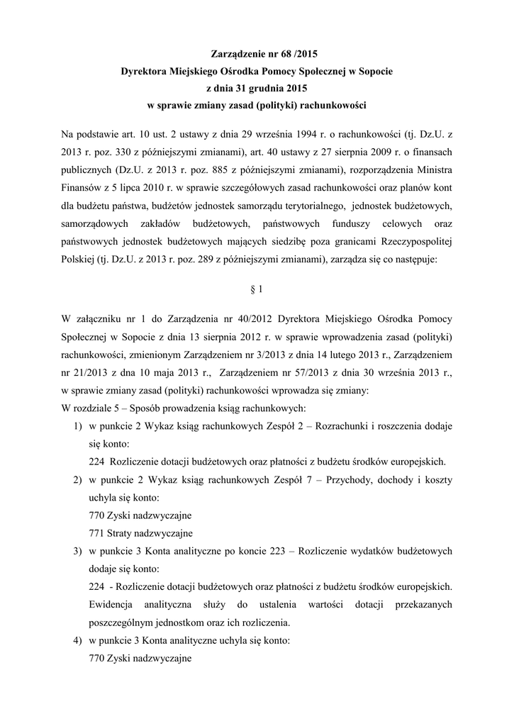 Zarządzenie nr 68 /2015 Dyrektora Miejskiego Ośrodka Pomocy Społecznej w Sopocie z dnia 31 grudnia 2015 w sprawie zmiany zasad (polityki) rachunkowości Na podstawie art. 10 ust. 2 ustawy z dnia 29 września 1994 r. o rachunkowości (tj. Dz.U. z 2013 r. poz. 330 z późniejszymi zmianami), art. 40 ustawy z 27 sierpnia 2009 r. o finansach publicznych (Dz.U. z 2013 r. poz. 885 z późniejszymi zmianami), rozporządzenia Ministra Finansów z 5 lipca 2010 r. w sprawie szczegółowych zasad rachunkowości oraz planów kont dla budżetu państwa, budżetów jednostek samorządu terytorialnego, jednostek budżetowych, samorządowych zakładów budżetowych, państwowych funduszy celowych oraz państwowych jednostek budżetowych mających siedzibę poza granicami Rzeczypospolitej Polskiej (tj. Dz.U. z 2013 r. poz. 289 z późniejszymi zmianami), zarządza się co następuje: §1 W załączniku nr 1 do Zarządzenia nr 40/2012 Dyrektora Miejskiego Ośrodka Pomocy Społecznej w Sopocie z dnia 13 sierpnia 2012 r. w sprawie wprowadzenia zasad (polityki) rachunkowości, zmienionym Zarządzeniem nr 3/2013 z dnia 14 lutego 2013 r., Zarządzeniem nr 21/2013 z dna 10 maja 2013 r., Zarządzeniem nr 57/2013 z dnia 30 września 2013 r., w sprawie zmiany zasad (polityki) rachunkowości wprowadza się zmiany: W rozdziale 5 – Sposób prowadzenia ksiąg rachunkowych: 1) w punkcie 2 Wykaz ksiąg rachunkowych Zespół 2 – Rozrachunki i roszczenia dodaje się konto: 224 Rozliczenie dotacji budżetowych oraz płatności z budżetu środków europejskich. 2) w punkcie 2 Wykaz ksiąg rachunkowych Zespół 7 – Przychody, dochody i koszty uchyla się konto: 770 Zyski nadzwyczajne 771 Straty nadzwyczajne 3) w punkcie 3 Konta analityczne po koncie 223 – Rozliczenie wydatków budżetowych dodaje się konto: 224 - Rozliczenie dotacji budżetowych oraz płatności z budżetu środków europejskich. Ewidencja analityczna służy do ustalenia poszczególnym jednostkom oraz ich rozliczenia. 4) w punkcie 3 Konta analityczne uchyla się konto: 770 Zyski nadzwyczajne wartości dotacji przekazanych 771 Straty nadzwyczajne. 5) w punkcie 4 Opis kont konto 221 otrzymuje brzmienie: konto 221 Należności z tytułu dochodów budżetowych służy do ewidencji należności z tytułu dochodów budżetowych, nienależnie pobranych świadczeń za lata ubiegłe, wpłat od komorników z tytułu funduszu alimentacyjnego oraz przypisu do zwrotu nierozliczonej dotacji. Na stronie Wn konta 221 ujmuje się ustalone należności z tytułu dochodów budżetowych i zwroty nadpłat, należności z tytułu dochodów budżetowych realizowanych na rzecz budżetu państwa oraz przypis do zwrotu nierozliczonej dotacji. Na stronie Ma konta 221 ujmuje się wpłaty należności z tytułu dochodów budżetowych, odpisy (zmniejszenia) należności oraz wpłaty z tytułu dochodów budżetowych realizowanych na rzecz budżetu państwa. Ewidencja analityczna do konta 221 prowadzona jest według dłużników i podziałek klasyfikacji budżetowej. Konto 221 może wykazywać dwa salda. Saldo Wn oznacza stan należności z tytułu dochodów budżetowych oraz dochodów budżetu Państwa, a saldo Ma stan zobowiązań jednostki budżetowej z tytułu nadpłat w tych dochodach. 6) w punkcie 4 Opis kont po koncie 223 Rozliczenie wydatków budżetowych dodaje się: konto 224 - Rozliczenie dotacji budżetowych oraz płatności z budżetu środków europejskich. Konto 224 służy do ewidencji rozliczenia przekazanych dotacji budżetowych. Na stronie Wn konta 224 ujmuje się wartość dotacji przekazanych. Na stronie Ma księguje się wartość dotacji uznanych za prawidłowo wykorzystane i rozliczone zgodnie z obowiązującymi przepisami lub zwróconych w roku ich przekazania. Konto 224 może wykazać saldo Wn, które oznacza wartość niewykorzystanych i nierozliczonych dotacji lub wartość dotacji należnych do zwrotu w roku, w którym zostały przekazane. Dotacje przypisane do zwrotu w roku następnym zaliczane są do dochodów budżetowych i wobec tego należności z tego tytułu ewidencjonowane są na koncie 221. 7) W punkcie 4 Opis kont uchyla się opis konta 770 Zyski nadzwyczajne oraz konta 771 Straty nadzwyczajne. 8) W punkcie 4 Opis konta 760 Pozostałe przychody operacyjne otrzymuje brzmienie: Konto 760 Pozostałe przychody operacyjne Konto służy do ewidencji przychodów niezwiązanych bezpośrednio ze zwykłą działnością jednostki, w tym wszystkich innych przychodów niż podlegające ewidencji na kontach 720,750. W szczególności na stronie Ma konta 760 ujmuje się: 1) przychody ze sprzedaży materiałów w wartości cen zakupu lub nabycia materiałów, 2) przychody ze sprzedaży środków trwałych, wartości niematerialnych i prawnych oraz środków trwałych w budowie, 3) odpisane przedawnione zobowiązania, otrzymane odszkodowania (niezwiązane ze zdarzeniami losowymi trudnymi do przewidzenia), kary, nieodpłatnie otrzymane w tym w drodze darowizny aktywa umorzone jednorazowo, rzeczowe aktywa obrotowe, przychody o nadzwyczajnej wartości, które wystąpiły incydentalnie, 4) wynajem środków trwałych, gdy nie stanowi to przedmiotu statutowej działalności jednostki. W końcu roku obrotowego przenosi się na stronę Ma konta 860 pozostałe przychody operacyjne. Na koniec roku konto 760 nie wykazuje salda. 9) W punkcie 4 Opis konta 761 Pozostałe koszty operacyjne otrzymuje brzmienie: Konto 761 Pozostałe przychody operacyjne Konto 761 służy do ewidencji kosztów niezwiązanych bezpośrednio z podstawową działnością jednostki. W szczególności na stronie Wn konta 761 księguje się: 1) koszty osiągnięcia pozostałych przychodów operacyjnych w wartości cen zakupu lub nabycia, 2) kary, koszty postępowania spornego, odpisy aktualizujące należności, 3) przedawnione, umorzone należności, koszty o nadzwyczajnej wartości, które wystąpiły incydentalnie. W końcu roku obrotowego przenosi się na stronę Wn konta 860 pozostałe ko