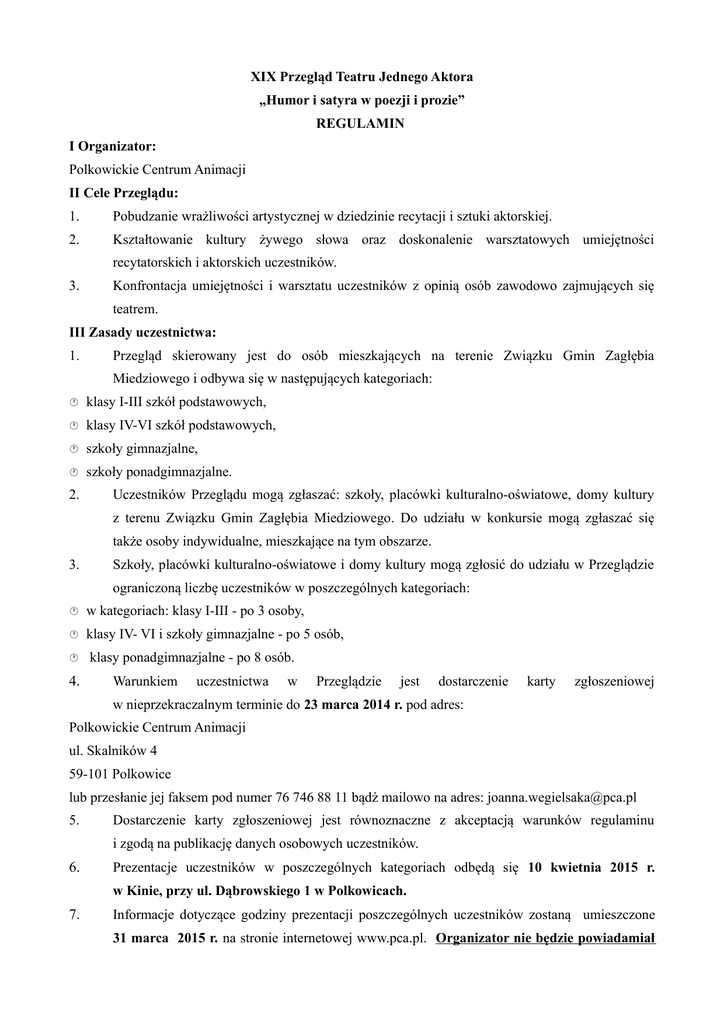 XIX Przegląd Teatru Jednego Aktora „Humor i satyra w poezji i prozie” REGULAMIN I Organizator: Polkowickie Centrum Animacji II Cele Przeglądu: 1. Pobudzanie wrażliwości artystycznej w dziedzinie recytacji i sztuki aktorskiej. 2. Kształtowanie kultury żywego słowa oraz doskonalenie warsztatowych umiejętności recytatorskich i aktorskich uczestników. 3. Konfrontacja umiejętności i warsztatu uczestników z opinią osób zawodowo zajmujących się teatrem. III Zasady uczestnictwa: 1. Przegląd skierowany jest do osób mieszkających na terenie Związku Gmin Zagłębia Miedziowego i odbywa się w następujących kategoriach:  klasy I-III szkół podstawowych,  klasy IV-VI szkół podstawowych,  szkoły gimnazjalne,  szkoły ponadgimnazjalne. 2. Uczestników Przeglądu mogą zgłaszać: szkoły, placówki kulturalno-oświatowe, domy kultury z terenu Związku Gmin Zagłębia Miedziowego. Do udziału w konkursie mogą zgłaszać się także osoby indywidualne, mieszkające na tym obszarze. 3. Szkoły, placówki kulturalno-oświatowe i domy kultury mogą zgłosić do udziału w Przeglądzie ograniczoną liczbę uczestników w poszczególnych kategoriach:  w kategoriach: klasy I-III - po 3 osoby,  klasy IV- VI i szkoły gimnazjalne - po 5 osób,  4. klasy ponadgimnazjalne - po 8 osób. Warunkiem uczestnictwa w Przeglądzie jest dostarczenie karty zgłoszeniowej w nieprzekraczalnym terminie do 23 marca 2014 r. pod adres: Polkowickie Centrum Animacji ul. Skalników 4 59-101 Polkowice lub przesłanie jej faksem pod numer 76 746 88 11 bądź mailowo na adres: [email protected] 5. Dostarczenie karty zgłoszeniowej jest równoznaczne z akceptacją warunków regulaminu i zgodą na publikację danych osobowych uczestników. 6. Prezentacje uczestników w poszczególnych kategoriach odbędą się 10 kwietnia 2015 r. w Kinie, przy ul. Dąbrowskiego 1 w Polkowicach. 7. Informacje dotyczące godziny prezentacji poszczególnych uczestników zostaną umieszczone 31 marca 2015 r. na stronie internetowej www.pca.pl. Organizator nie będzie powiadamiał indywidualnie uczestników oraz opiekunów artystycznych o godzinie prezentacji. 8. Zadaniem uczestnika Przeglądu jest prezentacja jednego tekstu w języku polskim o charakterze humorystycznym, satyrycznym lub kabaretowym (poezja, proza, monologi kabaretowe, stand up). Dopuszcza się prezentacje tekstów własnych. W takim przypadku do karty zgłoszeniowej należy dołączyć tekst utworu. Forma prezentacji oraz użyte środki wyrazu artystycznego powinny mieć charakter inscenizowanego monodramu. Dopuszcza się używanie rekwizytów, scenografii, wykorzystywanie muzyki, układów choreograficznych. Organizator zapewnia: odtwarzacz CD, podstawowe efekty oświetleniowe, stoliki, wieszaki, krzesła. Inne rekwizyty uczestnicy powinni zapewnić sobie we własnym zakresie. 9. Czas prezentacji - maksymalnie 10 min. Organizator i Jury zastrzegają sobie prawo do ewentualnego przerwania występu po znacznym przekroczeniu dopuszczalnego czasu. IV Jury: 1. Prezentacje oceniać będzie Jury złożone z osób zawodowo zajmujących się teatrem. 2. Decyzja Jury jest ostateczna. V Kryteria oceny: 1. Dobór repertuaru (uwzględnienie wartości artystycznych utworu oraz dostosowanie go do wieku i umiejętności uczestnika). 2. Interpretacja utworu. 3. Kultura słowa (dykcja oraz emisja głosu: tempo recytacji, modulacja, intonacja, akcentowanie). 4. Ogólny wyraz artystyczny. VI Nagrody: 1. W każdej kategorii Jury może przyznać nagrody i/lub wyróżnienia. 2. Wśród wszystkich uczestników Jury może wyłonić zwycięzcę Grand Prix XIX edycji Przeglądu Teatru Jednego Aktora. 3. Nagrody oraz dyplomy należy odbierać osobiście lub poprzez opiekunów w dniu konkursu. Ostateczny termin odbioru nagród mija 20 kwietnia 2015 r. Po tym terminie nagrody przechodzą na własność Organizatora. VII Dodatkowe informacje: 1. Wyniki Przeglądu zostaną zamieszczone na stronach internetowych www.dniteatru.pl, www.obliczateatru.pl oraz www.pca.pl 13 kwietnia 2015 r. 2. Przyjazd uczestników odbywa się na koszt własny lub instytucji delegującej. 3. Ostateczna interpretacja niniejszego regulaminu należy do Organizatora. 4. Szczegółowych informacji udziela koordynator konkursu p. Joanna Węgielska, e-mail: [email protected], nr tel. 76 746 88 18. Serdecznie zapraszamy!