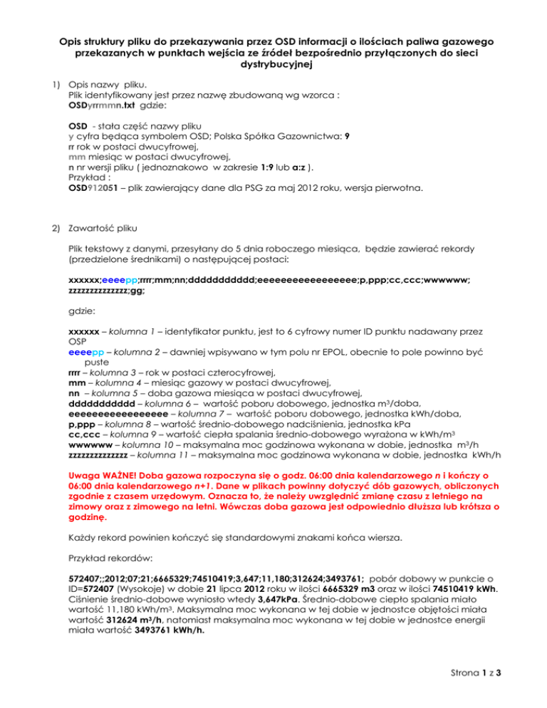 Opis struktury pliku do przekazywania przez OSD informacji o ilościach paliwa gazowego przekazanych w punktach wejścia ze źródeł bezpośrednio przyłączonych do sieci dystrybucyjnej 1) Opis nazwy pliku. Plik identyfikowany jest przez nazwę zbudowaną wg wzorca : OSDyrrmmn.txt gdzie: OSD - stała część nazwy pliku y cyfra będąca symbolem OSD; Polska Spółka Gazownictwa: 9 rr rok w postaci dwucyfrowej, mm miesiąc w postaci dwucyfrowej, n nr wersji pliku ( jednoznakowo w zakresie 1:9 lub a:z ). Przykład : OSD912051 – plik zawierający dane dla PSG za maj 2012 roku, wersja pierwotna. 2) Zawartość pliku Plik tekstowy z danymi, przesyłany do 5 dnia roboczego miesiąca, będzie zawierać rekordy (przedzielone średnikami) o następującej postaci: xxxxxx;eeeepp;rrrr;mm;nn;ddddddddddd;eeeeeeeeeeeeeeeee;p,ppp;cc,ccc;wwwwww; zzzzzzzzzzzzzz;gg; gdzie: xxxxxx – kolumna 1 – identyfikator punktu, jest to 6 cyfrowy numer ID punktu nadawany przez OSP eeeepp – kolumna 2 – dawniej wpisywano w tym polu nr EPOL, obecnie to pole powinno być puste rrrr – kolumna 3 – rok w postaci czterocyfrowej, mm – kolumna 4 – miesiąc gazowy w postaci dwucyfrowej, nn – kolumna 5 – doba gazowa miesiąca w postaci dwucyfrowej, ddddddddddd – kolumna 6 – wartość poboru dobowego, jednostka m3/doba, eeeeeeeeeeeeeeeee – kolumna 7 – wartość poboru dobowego, jednostka kWh/doba, p,ppp – kolumna 8 – wartość średnio-dobowego nadciśnienia, jednostka kPa cc,ccc – kolumna 9 – wartość ciepła spalania średnio-dobowego wyrażona w kWh/m3 wwwwww – kolumna 10 – maksymalna moc godzinowa wykonana w dobie, jednostka m3/h zzzzzzzzzzzzzz – kolumna 11 – maksymalna moc godzinowa wykonana w dobie, jednostka kWh/h Uwaga WAŻNE! Doba gazowa rozpoczyna się o godz. 06:00 dnia kalendarzowego n i kończy o 06:00 dnia kalendarzowego n+1. Dane w plikach powinny dotyczyć dób gazowych, obliczonych zgodnie z czasem urzędowym. Oznacza to, że należy uwzględnić zmianę czasu z letniego na zimowy oraz z zimowego na letni. Wówczas doba gazowa jest odpowiednio dłuższa lub krótsza o godzinę. Każdy rekord powinien kończyć się standardowymi znakami końca wiersza. Przykład rekordów: 572407;;2012;07;21;6665329;74510419;3,647;11,180;312624;3493761; pobór dobowy w punkcie o ID=572407 (Wysokoje) w dobie 21 lipca 2012 roku w ilości 6665329 m3 oraz w ilości 74510419 kWh. Ciśnienie średnio-dobowe wyniosło wtedy 3,647kPa. Średnio-dobowe ciepło spalania miało wartość 11,180 kWh/m3. Maksymalna moc wykonana w tej dobie w jednostce objętości miała wartość 312624 m3/h, natomiast maksymalna moc wykonana w tej dobie w jednostce energii miała wartość 3493761 kWh/h. Strona 1 z 3 3) Dodatkowe pozycje dla stacji zawierające informacje o poborze technologicznym za pomiarem głównym i korekcie rozliczenia miesięcznego oraz inne parametry stacji. 40 numer dnia - wartości zużycia własnego stacji (np. podgrzewanie przed redukcją) - w przypadku pomiaru za pomiarem głównym, w jednostce m3 i kWh. 41 numer dnia - sumaryczna wartość korekt, jeżeli występują w danym miesiącu dla danej stacji i nie zostały rozłożone na poszczególne dni, w jednostce m3 i kWh. 50 numer dnia – miesięczna ilość gazu przyjęta do rozliczenia, w m3/h i w kWh/h Przykład rekordów z pozycjami dodatkowymi: 210305;;2012;08;40;1184;13274; - ilość zużycia własnego na stacji 210305 w sierpniu 2012 210305;;2012;08;41;694;7779; - wartość korekty na stacji 210305 w sierpniu 2012 210305;;2012;08;43;341;3859; - wartość maksymalnej mocy wykonanej w sierpniu 2012r. na stacji o numerze id=210305 wynosi 341m3/h oraz 3859 kWh/h 210305;;2012;08;49;230;2558; - wartość minimalnej z maksymalnych dobowych mocy wykonanych w sierpniu 2012 dla stacji 210305 wynosi 230 m3/h oraz 2558 kWh/h 210305;;2012;08;50;127123;1425228; - miesięczna ilość gazu przyjęta do rozliczenia w sierpniu 2012 dla stacji 210305 wynosi 127123 m3/h i 1425228 kWh/h Uwaga ważne: Wartości prosimy podawać tylko jako liczby bez spacji. Strona 2 z 3 Schemat struktury pliku (na białym tle – wartości do podania, na szarym tle – objaśnienia) ID KDG Nr EPOL Rok Miesiąc Dzień przepływ dobowy przepływ dobowy średnie dobowe nadciśnienie zgodnie z UP średniodobowe ciepło spalania szczyt dobowy maksymalny szczyt dobowy maksymalny [m3] [kWh] [kPa] [kWh/m3] [m3] [kWh] 210175 2012 8 1 7538 67042 0,217 8,9 396 3528 210175 2012 8 2 7182 63659 0,216 8,86 457 4057 210175 2012 8 3 6901 60554 0,217 8,77 368 3245 210175 2012 8 4 1698 14851 0,217 8,75 174 1524 210175 2012 8 5 1729 15121 0,217 8,75 184 1609 210175 2012 8 6 6821 59656 0,216 8,75 383 3357 210175 2012 8 7 8097 70818 0,217 8,75 406 3557 210175 2012 8 8 8415 73594 0,217 8,75 443 3882 210175 2012 8 9 7613 66587 0,218 8,75 441 3859 210175 2012 8 10 8059 70487 0,218 8,75 412 3604 210175 2012 8 11 3605 31532 0,218 8,75 401 3510 210175 2012 8 12 1927 16854 0,218 8,75 296 2592 210175 2012 8 13 8516 74484 0,217 8,75 500 4375 210175 2012 8 14 7422 64924 0,217 8,75 450 3940 210175 2012 8 15 1775 15524 0,218 8,75 220 1931 210175 2012 8 16 7736 67657 0,217 8,75 436 3814 210175 2012 8 17 7933 69381 0,217 8,75 427 3736 210175 2012 8 18 1868 16342 0,218 8,75 229 2005 210175 2012 8 19 1750 15306 0,218 8,75 207 1812 210175 2012 8 20 8068 70555 0,217 8,75 466 4081 210175 2012 8 21 7900 69089 0,217 8,75 412 3608 210175 2012 8 22 7929 69349 0,216 8,75 476 4163 210175 2012 8 23 8132 71114 0,217 8,75 407 3563 210175 2012 8 24 5673 49605 0,217 8,75 345 3019 210175 2012 8 25 1898 16603 0,217 8,75 244 2141 210175 2012 8 26 1884 16474 0,217 8,75 233 2041 210175 2012 8 27 8461 74005 0,217 8,75 514 4500 210175 2012 8 28 8258 72222 0,217 8,75 408 3571 210175 2012 8 29 7771 67961 0,217 8,75 431 3772 210175 2012 8 30 7485 65463 0,217 8,75 372 3259 210175 2012 8 31 7539 65935 0,217 8,75 378 3312 210175 2012 8 40 0 0 40 210175 2012 8 41 0 0 41 210175 2012 8 50 187583 1642748 doba 50 zużycie własne z