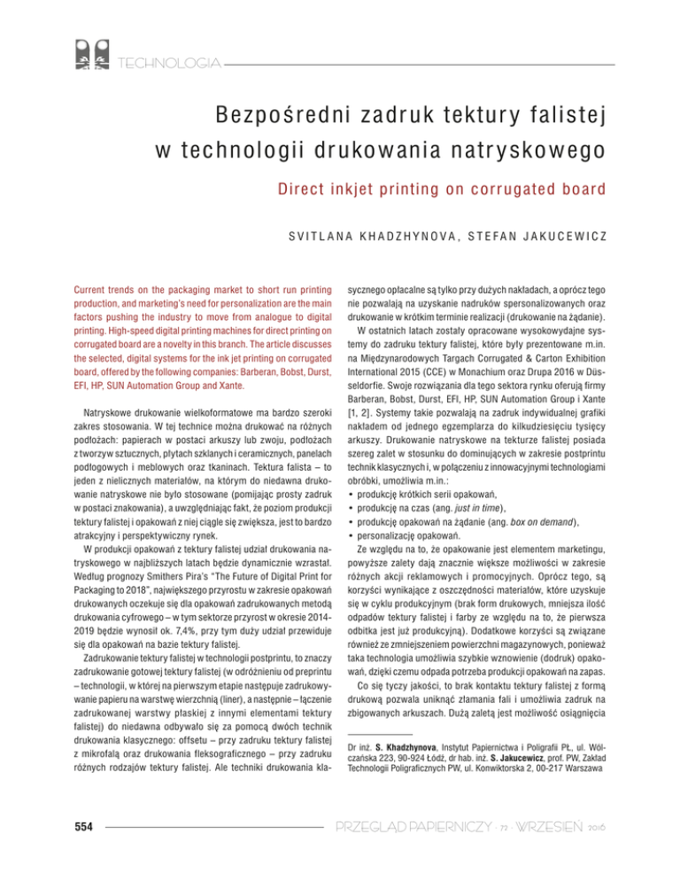 TECHNOLOGIA Bezpośredni zadr uk tektur y falistej w technologii dr ukowania natr yskowego D i rect in kjet p rin tin g on c or r u g ated bo a rd SVITL ANA KHADZHYNOVA , STEFAN JAKUCEWICZ Current trends on the packaging market to short run printing sycznego opłacalne są tylko przy dużych nakładach, a oprócz tego production, and marketing’s need for personalization are the main nie pozwalają na uzyskanie nadruków spersonalizowanych oraz factors pushing the industry to move from analogue to digital drukowanie w krótkim terminie realizacji (drukowanie na żądanie). printing. High-speed digital printing machines for direct printing on W ostatnich latach zostały opracowane wysokowydajne sys- corrugated board are a novelty in this branch. The article discusses temy do zadruku tektury falistej, które były prezentowane m.in. the selected, digital systems for the ink jet printing on corrugated na Międzynarodowych Targach Corrugated & Carton Exhibition board, offered by the following companies: Barberan, Bobst, Durst, International 2015 (CCE) w Monachium oraz Drupa 2016 w Düs- EFI, HP, SUN Automation Group and Xante. seldorfie. Swoje rozwiązania dla tego sektora rynku oferują firmy Barberan, Bobst, Durst, EFI, HP, SUN Automation Group i Xante Natryskowe drukowanie wielkoformatowe ma bardzo szeroki [1, 2]. Systemy takie pozwalają na zadruk indywidualnej grafiki zakres stosowania. W tej technice można drukować na różnych nakładem od jednego egzemplarza do kilkudziesięciu tysięcy podłożach: papierach w postaci arkuszy lub zwoju, podłożach arkuszy. Drukowanie natryskowe na tekturze falistej posiada z tworzyw sztucznych, płytach szklanych i ceramicznych, panelach szereg zalet w stosunku do dominujących w zakresie postprintu podłogowych i meblowych oraz tkaninach. Tektura falista – to technik klasycznych i, w połączeniu z innowacyjnymi technologiami jeden z nielicznych materiałów, na którym do niedawna druko- obróbki, umożliwia m.in.: wanie natryskowe nie było stosowane (pomijając prosty zadruk • produkcję krótkich serii opakowań, w postaci znakowania), a uwzględniając fakt, że poziom produkcji • produkcję na czas (ang. just in time), tektury falistej i opakowań z niej ciągle się zwiększa, jest to bardzo • produkcję opakowań na żądanie (ang. box on demand), atrakcyjny i perspektywiczny rynek. • personalizację opakowań. W produkcji opakowań z tektury falistej udział drukowania na- Ze względu na to, że opakowanie jest elementem marketingu, tryskowego w najbliższych latach będzie dynamicznie wzrastał. powyższe zalety dają znacznie większe możliwości w zakresie Według prognozy Smithers Pira’s “The Future of Digital Print for różnych akcji reklamowych i promocyjnych. Oprócz tego, są Packaging to 2018”, największego przyrostu w zakresie opakowań korzyści wynikające z oszczędności materiałów, które uzyskuje drukowanych oczekuje się dla opakowań zadrukowanych metodą się w cyklu produkcyjnym (brak form drukowych, mniejsza ilość drukowania cyfrowego – w tym sektorze przyrost w okresie 2014- odpadów tektury falistej i farby ze względu na to, że pierwsza 2019 będzie wynosił ok. 7,4%, przy tym duży udział przewiduje odbitka jest już produkcyjną). Dodatkowe korzyści są związane się dla opakowań na bazie tektury falistej. również ze zmniejszeniem powierzchni magazynowych, ponieważ Zadrukowanie tektury falistej w technologii postprintu, to znaczy taka technologia umożliwia szybkie wznowienie (dodruk) opako- zadrukowanie gotowej tektury falistej (w odróżnieniu od preprintu wań, dzięki czemu odpada potrzeba produkcji opakowań na zapas. – technologii, w której na pierwszym etapie następuje zadrukowy- Co się tyczy jakości, to brak kontaktu tektury falistej z formą wanie papieru na warstwę wierzchnią (liner), a następnie – łączenie drukową pozwala uniknąć złamania fali i umożliwia zadruk na zadrukowanej warstwy płaskiej z innymi elementami tektury zbigowanych arkuszach. Dużą zaletą jest możliwość osiągnięcia falistej) do niedawna odbywało się za pomocą dwóch technik drukowania klasycznego: offsetu – przy zadruku tektury falistej z mikrofalą oraz drukowania fleksograficznego – przy zadruku różnych rodzajów tektury falistej. Ale techniki drukowania kla- 554 Dr inż. S. Khadzhynova, Instytut Papiernictwa i Poligrafii PŁ, ul. Wólczańska 223, 90-924 Łódź, dr hab. inż. S. Jakucewicz, prof. PW, Zakład Technologii Poligraficznych PW, ul. Konwiktorska 2, 00-217 Warszawa PRZEGLĄD PAPIERNICZY · 72 · WRZESIEŃ 2016