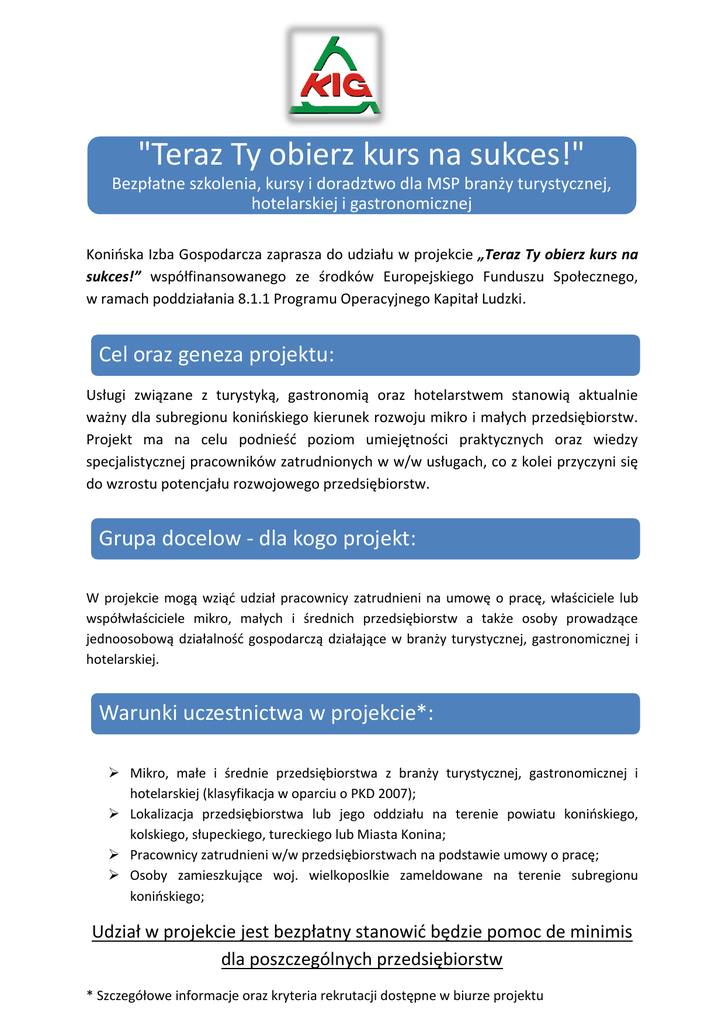 "Teraz Ty obierz kurs na sukces!" Bezpłatne szkolenia, kursy i doradztwo dla MSP branży turystycznej, hotelarskiej i gastronomicznej Konińska Izba Gospodarcza zaprasza do udziału w projekcie „Teraz Ty obierz kurs na sukces!” współfinansowanego ze środków Europejskiego Funduszu Społecznego, w ramach poddziałania 8.1.1 Programu Operacyjnego Kapitał Ludzki. Cel oraz geneza projektu: Usługi związane z turystyką, gastronomią oraz hotelarstwem stanowią aktualnie ważny dla subregionu konińskiego kierunek rozwoju mikro i małych przedsiębiorstw. Projekt ma na celu podnieść poziom umiejętności praktycznych oraz wiedzy specjalistycznej pracowników zatrudnionych w w/w usługach, co z kolei przyczyni się do wzrostu potencjału rozwojowego przedsiębiorstw. Grupa docelow - dla kogo projekt: W projekcie mogą wziąć udział pracownicy zatrudnieni na umowę o pracę, właściciele lub współwłaściciele mikro, małych i średnich przedsiębiorstw a także osoby prowadzące jednoosobową działalność gospodarczą działające w branży turystycznej, gastronomicznej i hotelarskiej. Warunki uczestnictwa w projekcie*: Mikro, małe i średnie przedsiębiorstwa z branży turystycznej, gastronomicznej i hotelarskiej (klasyfikacja w oparciu o PKD 2007); Lokalizacja przedsiębiorstwa lub jego oddziału na terenie powiatu konińskiego, kolskiego, słupeckiego, tureckiego lub Miasta Konina; Pracownicy zatrudnieni w/w przedsiębiorstwach na podstawie umowy o pracę; Osoby zamieszkujące woj. wielkoposlkie zameldowane na terenie subregionu konińskiego; Udział w projekcie jest bezpłatny stanowić będzie pomoc de minimis dla poszczególnych przedsiębiorstw * Szczegółowe informacje oraz kryteria rekrutacji dostępne w biurze projektu Tematyka szkoleń i kursów: Ogólne: Kurs komputerowy I i II stopnia – Informatyka w prowadzeniu biznesu (zajęcia teoretyczne i praktyczne); Kurs nauki języka angielskiego poziom podstawowy i zaawansowany branżowy; Szkolenie - Finanse i rachunkowość w przedsiębiorstwie; Specjalistyczne: Pilot wycieczek – zajęcia praktyczne oraz ćwiczenia wyjazdowe – kurs zakończony egzaminem państwowym przy Marszałku woj. Wlkp. (zdanie egzaminu nadaje licencję pilota wycieczek); Przewodnik terenowy – zajęcia teoretyczne i ćwiczenia wyjazdowe – kurs zakończony egzaminem państwowym przy Marszałku woj. Wlkp. (zdanie egzaminu nadaje licencję przewodnika terenowego); Przygotowanie do zawodu kucharz małej gastronomi – zajęcia teoretyczne i praktyczne; Przygotowanie do zawodu kelner – zajęcia teoretyczne i praktyczne; Przygotowanie do zawodu hotelarz – zajęcia teoretyczne i praktyczne Profesjonalna obsługa klienta Skuteczny marketing usług turystycznych Zarządzanie personelem i organizacja zespołu Doradztwo indywidualne: Marketing Rachunkowość Prawo pracy Każdy uczestnik projektu otrzyma materiały szkoleniowe oraz wyżywienie w trakcie zajęć Pierwsze zajęcia w ramach projektu rozpoczną się na przełomie września i października 2012 Szczegółowe informacje odnośnie ilości godzin i terminów KONTAKT: Tel. (63) 245 88 00 w. 19, e-mail: [email protected] www.kig.konin.pl Projekt współfinansowany ze środków Unii Europejskiej w ramach Europejskiego Funduszu Społecznego